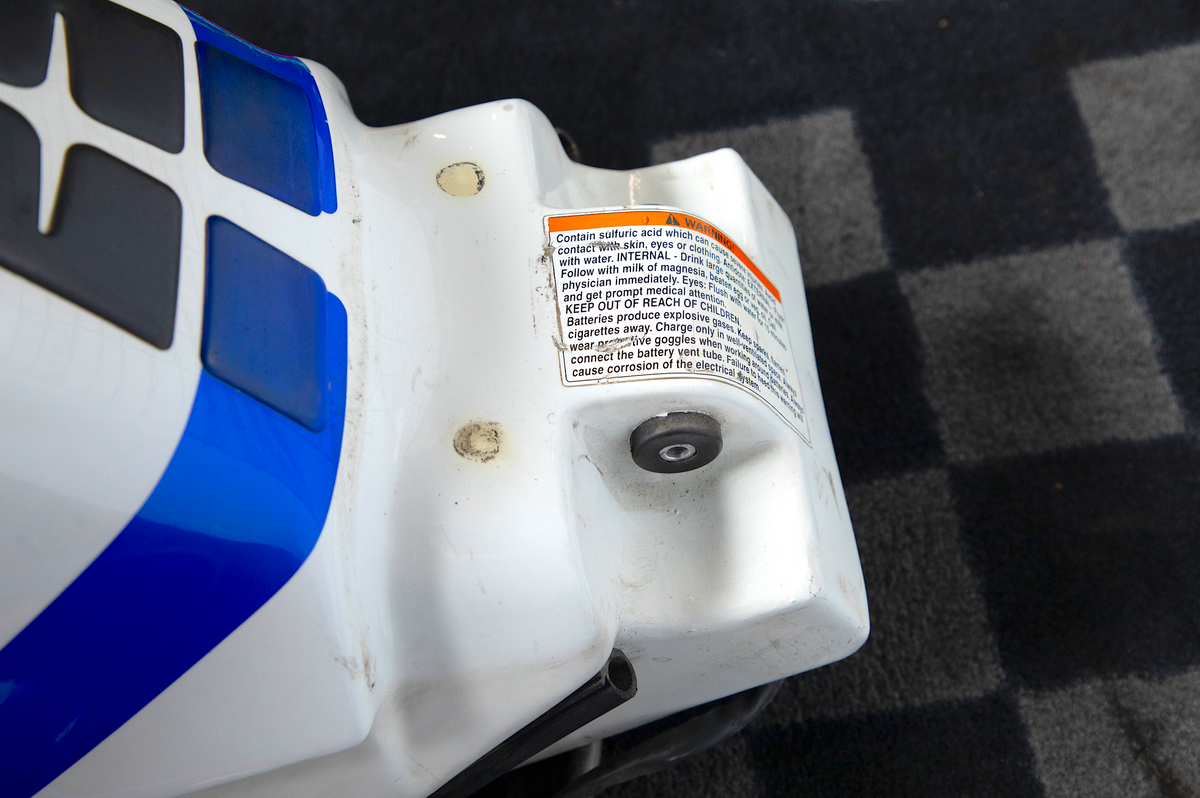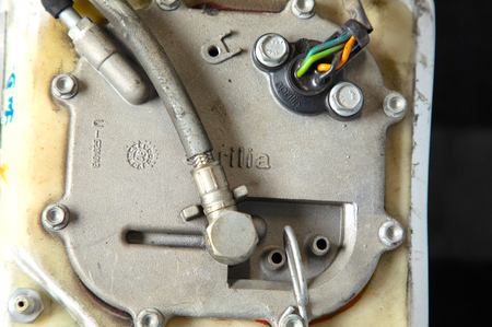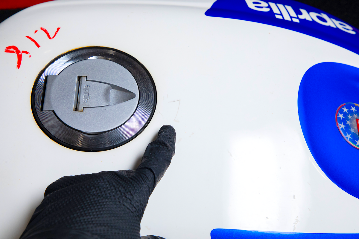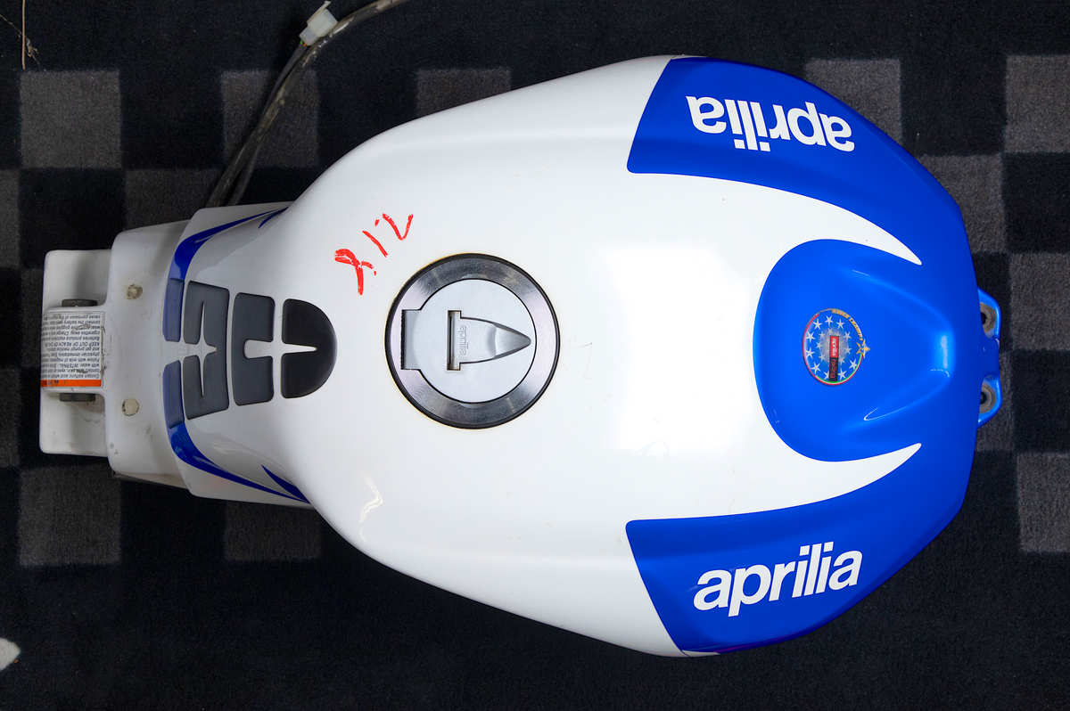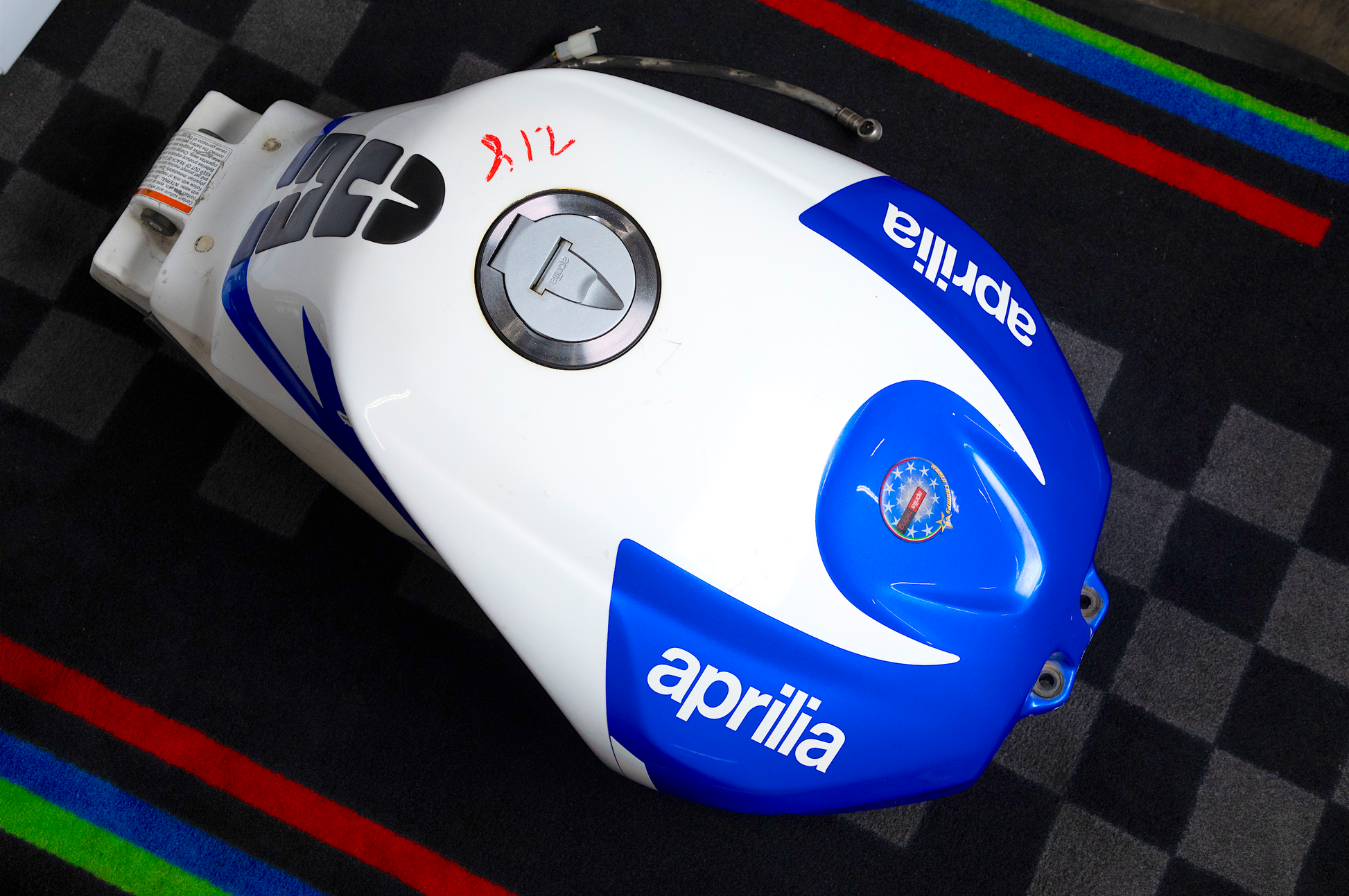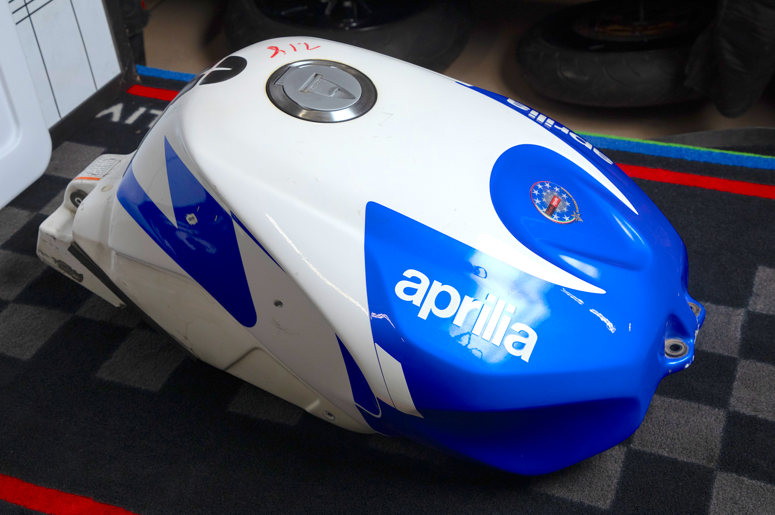 Aprilia Genuine Parts: Fuel tank, blue & white. Good condition, pre-owned, with wear. Clean with a few marks & blemishes (see pics #4, 5, 7, 9). Includes fuel cap (no key), and connecting lines (pics #13-16). Sold complete as shown, as-is.