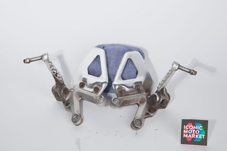 Aprilia Genuine Parts: Rear sets - foot pegs & heel guards. Good condition, pre-owned, with wear. Investigation of the parts reveal some dirt/grease, light surface corrosion on fasteners, and should clean up nicely. Sold complete as shown, as-is.