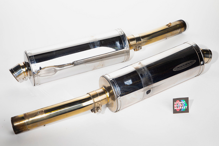 Aprilia part #AP8119837 / 838: Delkevic exhaust silencers, left & right set. (OEM)