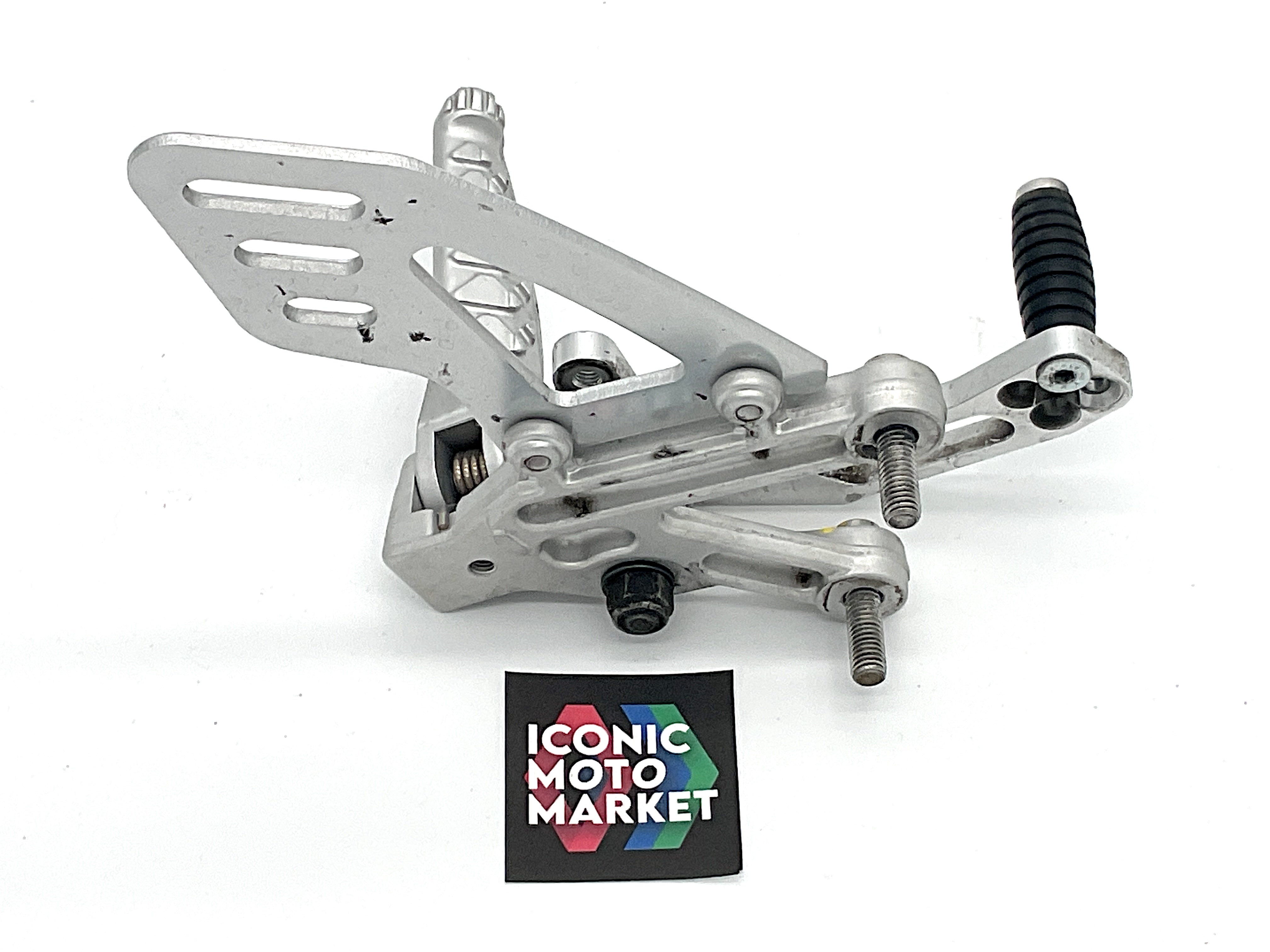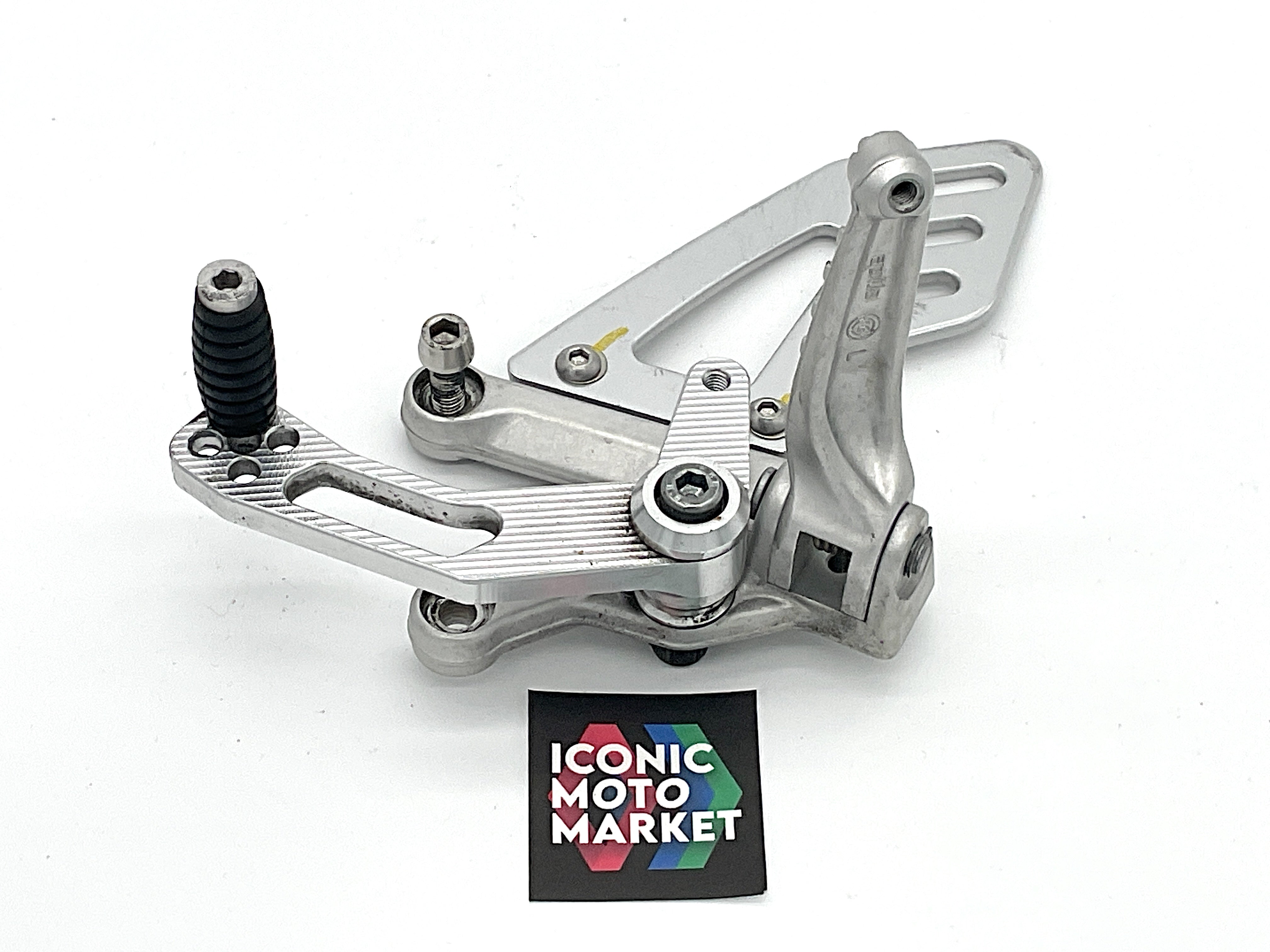 Aprilia Genuine Parts - Front footrests, heel guards, brackets & levers. Very good condition with wear. The left-side gear shifter has been upgraded to an adjustable billet aluminum lever. Sold complete as shown. (see pics)