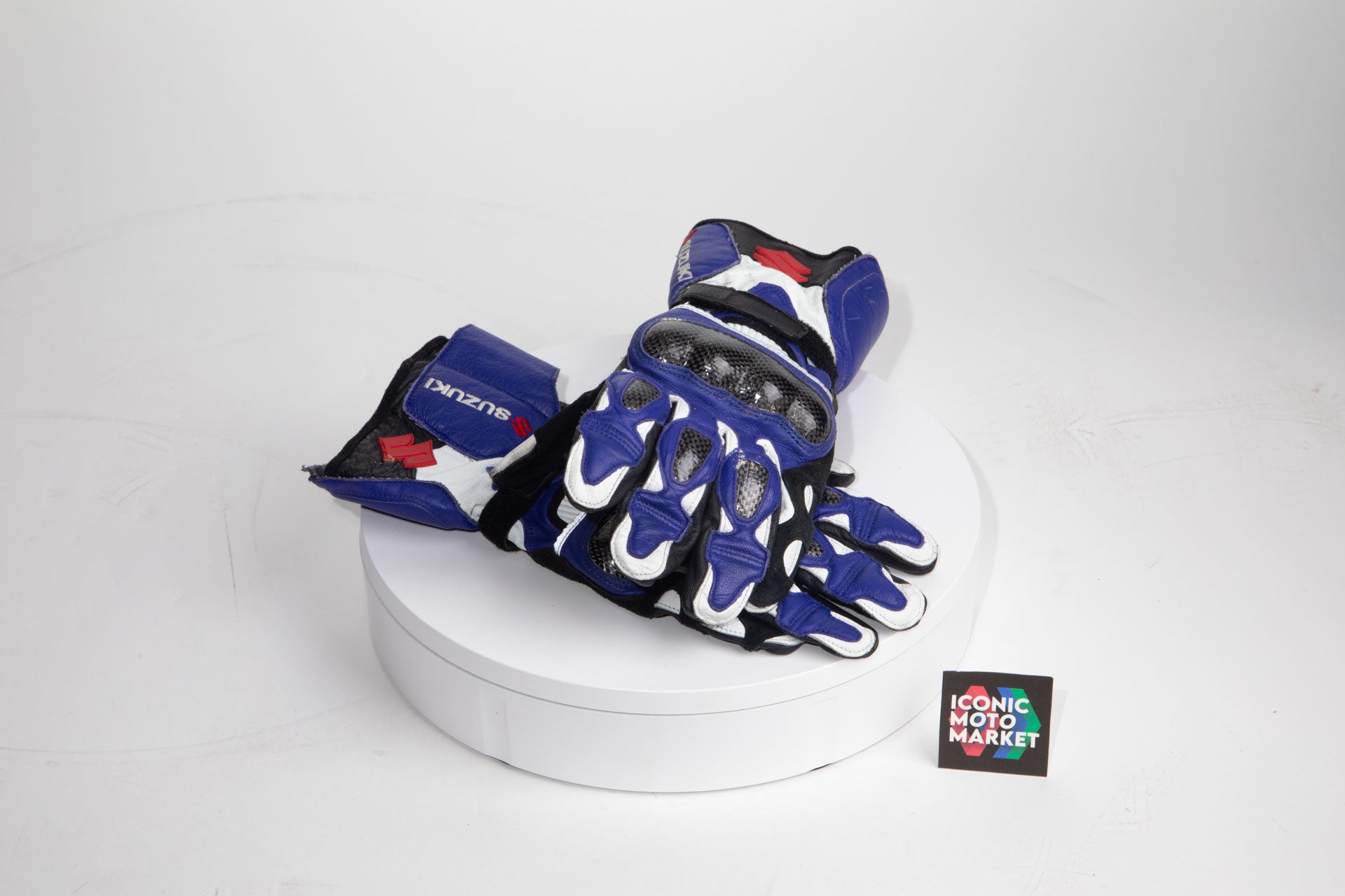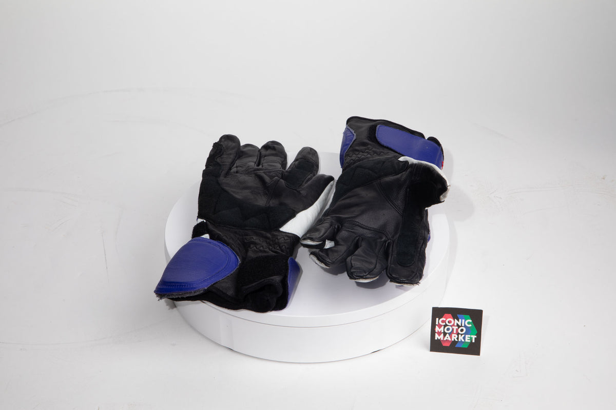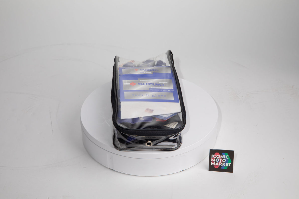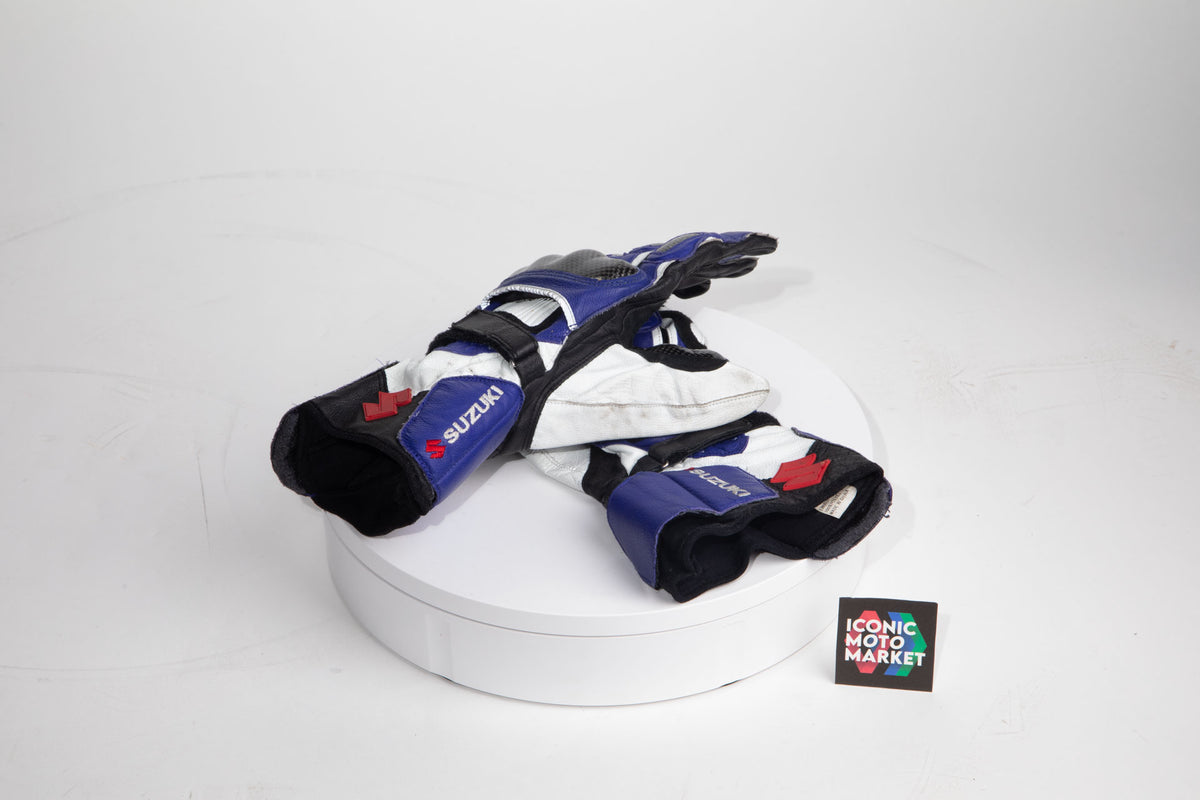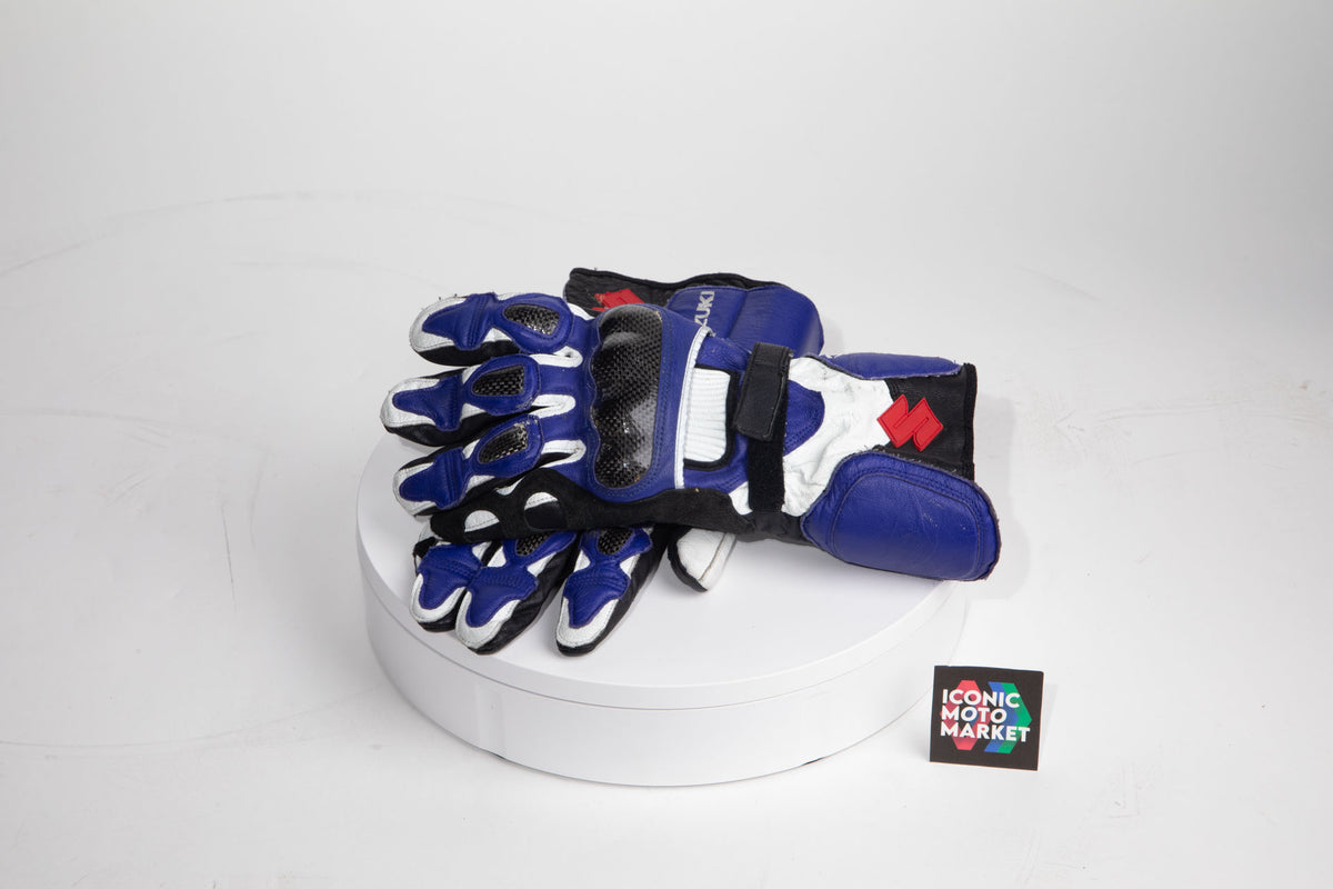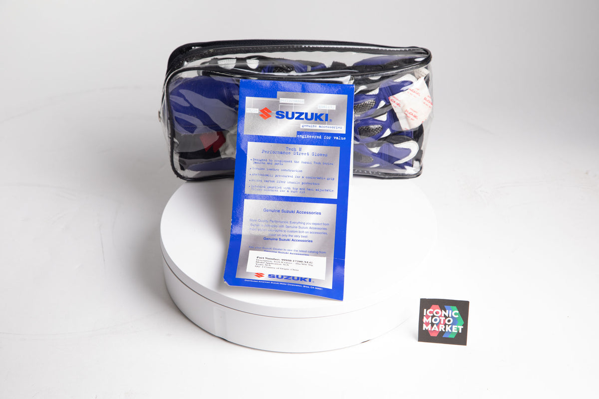 Arai Quality Products: DT-X model helmet with Suzuki licensed branding/design. The helmet is a 'Like-new condition', size large, with safety designation of Snell M2020D. Includes helmet soft-bag. This helmet rating shows that the product may still be used for street-use. The gloves are a Suzuki OEM product, size XL, and like-new in package.