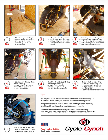 Cycle Cynch™ provides a complete line-up of easy-to-use products for helping to safely secure your motorbike during transportation. Whether you're hauling cross-country to a destination point, or making a short trip to the track, Cycle Cynch is the industry name you can depend upon. Proudly Made in the U.S.A.