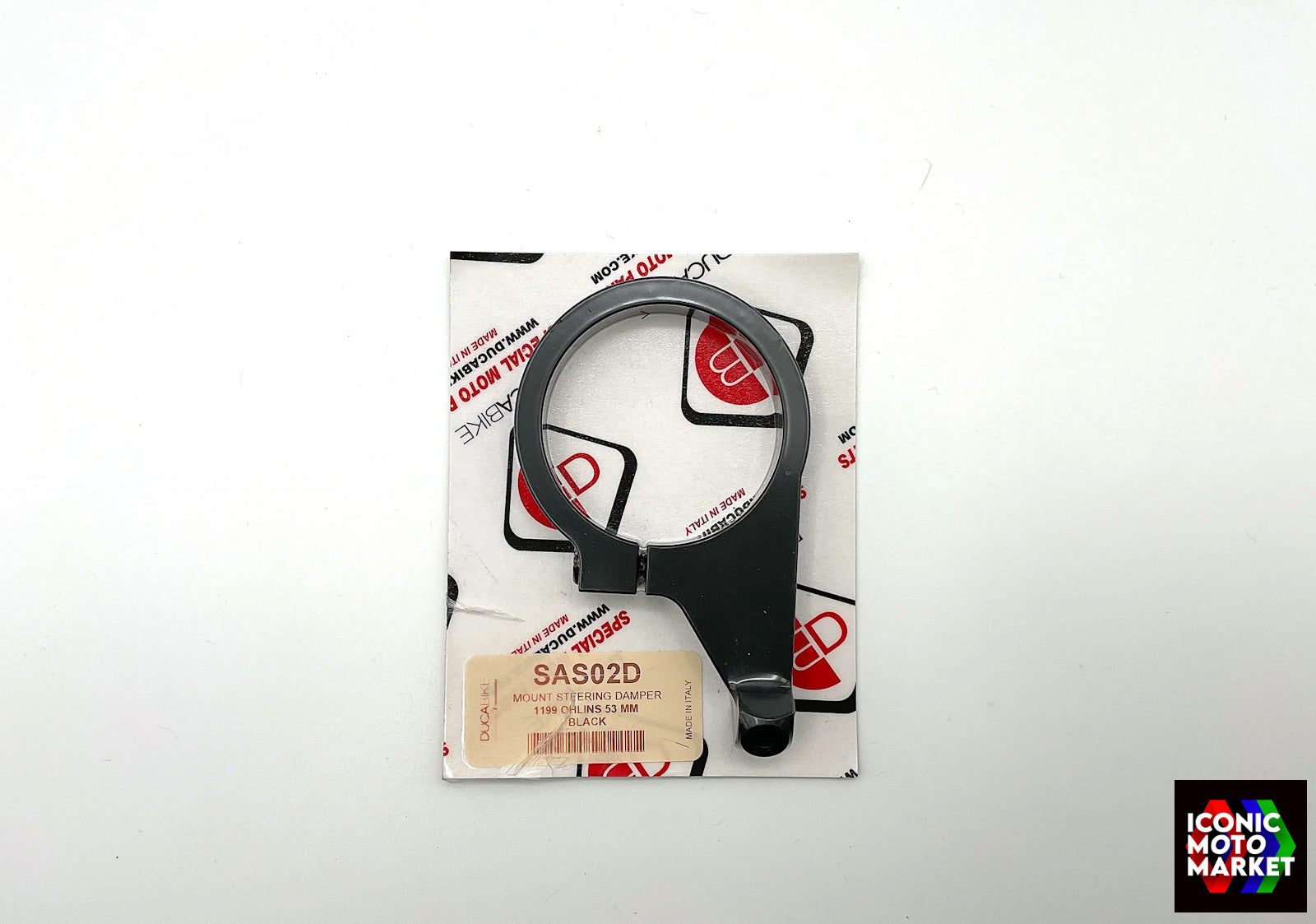 Ducabike - Made in Italy: Steering damper bracket, CNC machined 7075 billet aluminum, black anodized. New-in-package. Fits the Ohlins D.53mm.