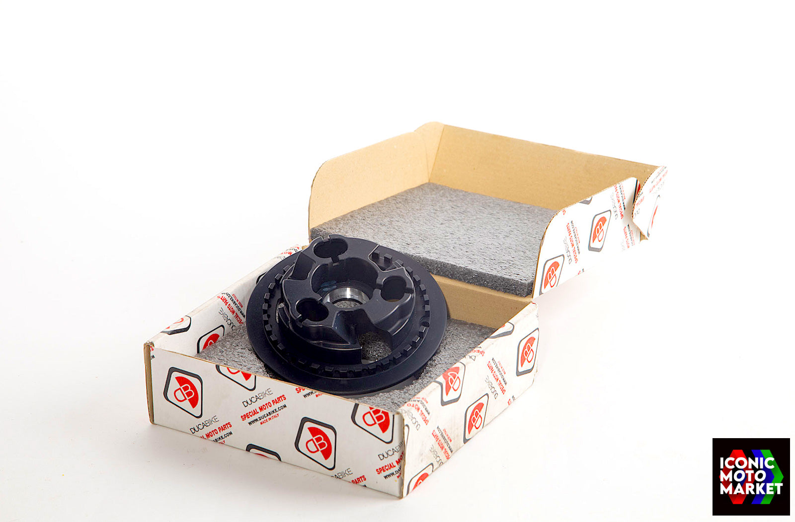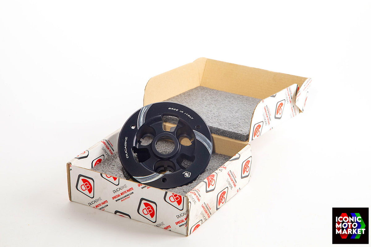 Ducabike - Made in Italy: Clutch pressure plate. Made from 7075 billet aluminum, black anodized. New-in-box. This item was removed temporarily from original packaging for final inspection and photographic presentation purposes only. Your part will be shipped in the original box. NOTE: There may be light signs of handling and from being in storage. Sold as shown, as-is.