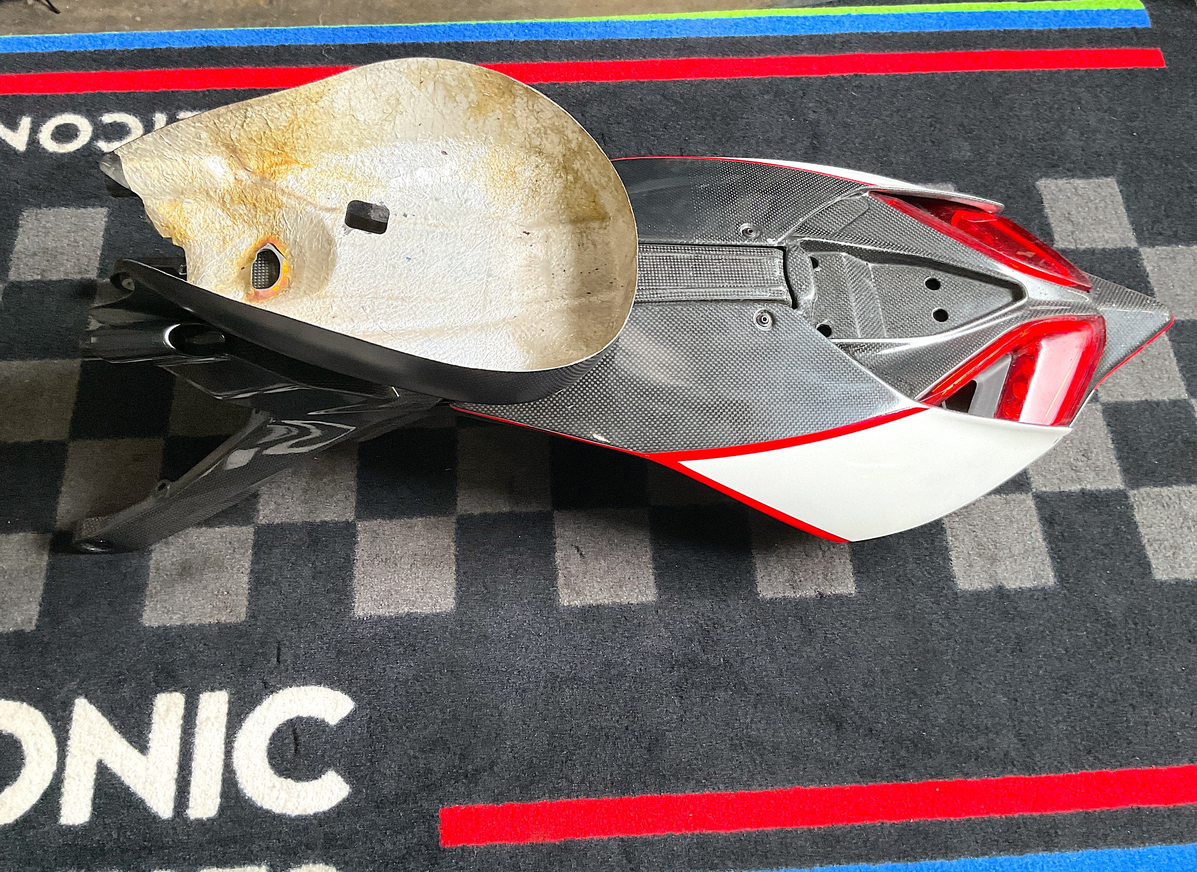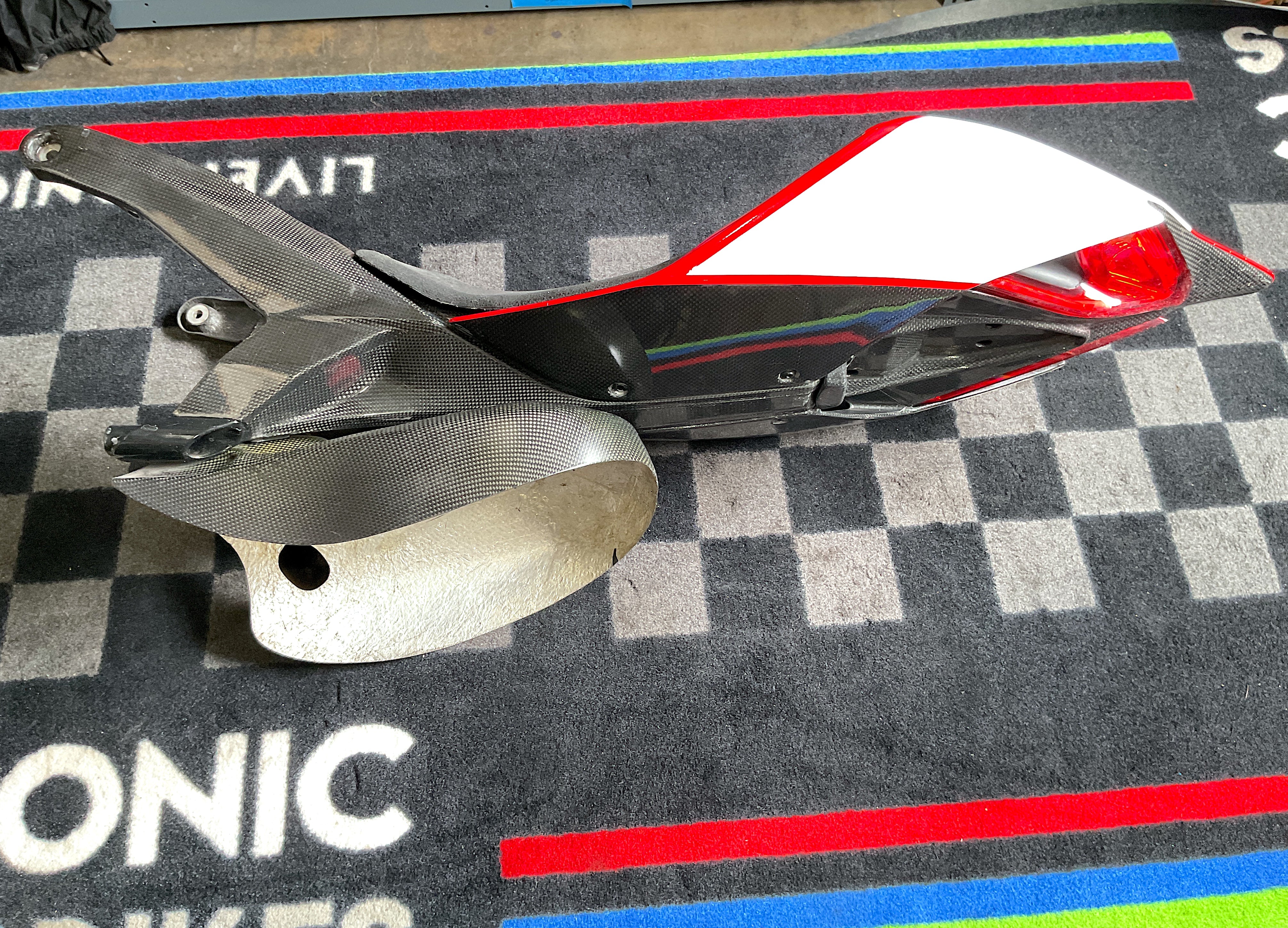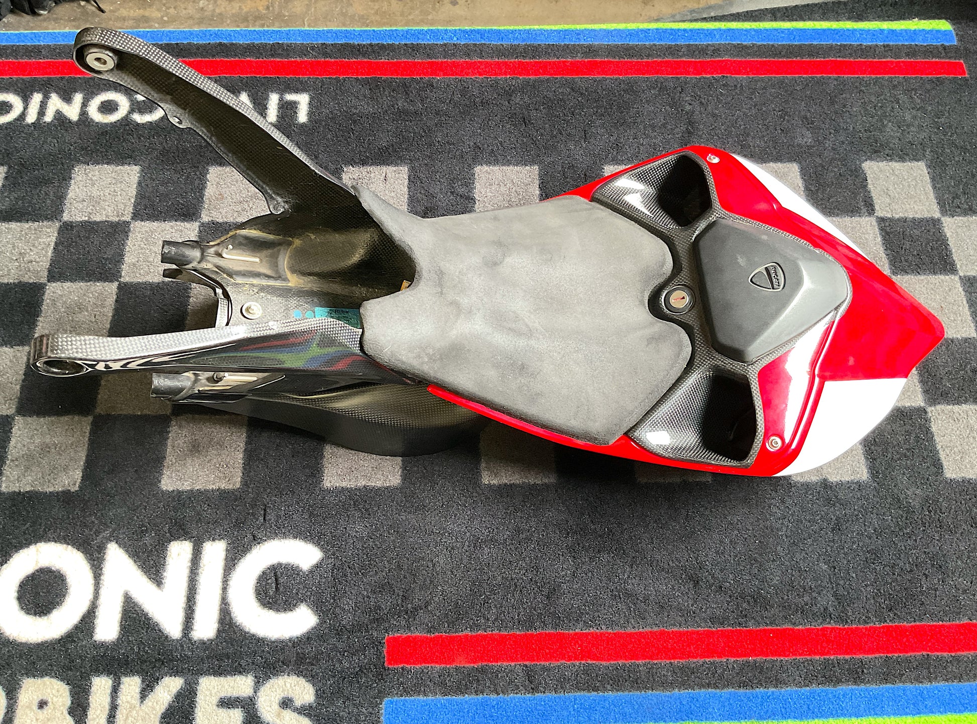 Ducati Genuine Parts - Carbon fiber tail-fairing, seat, tail-light assembly, with added carbon fiber exhaust heat-shield. Excellent condition, pre-owned, with light wear. Very rare components to find sold together. Sold complete as shown. (see pics)