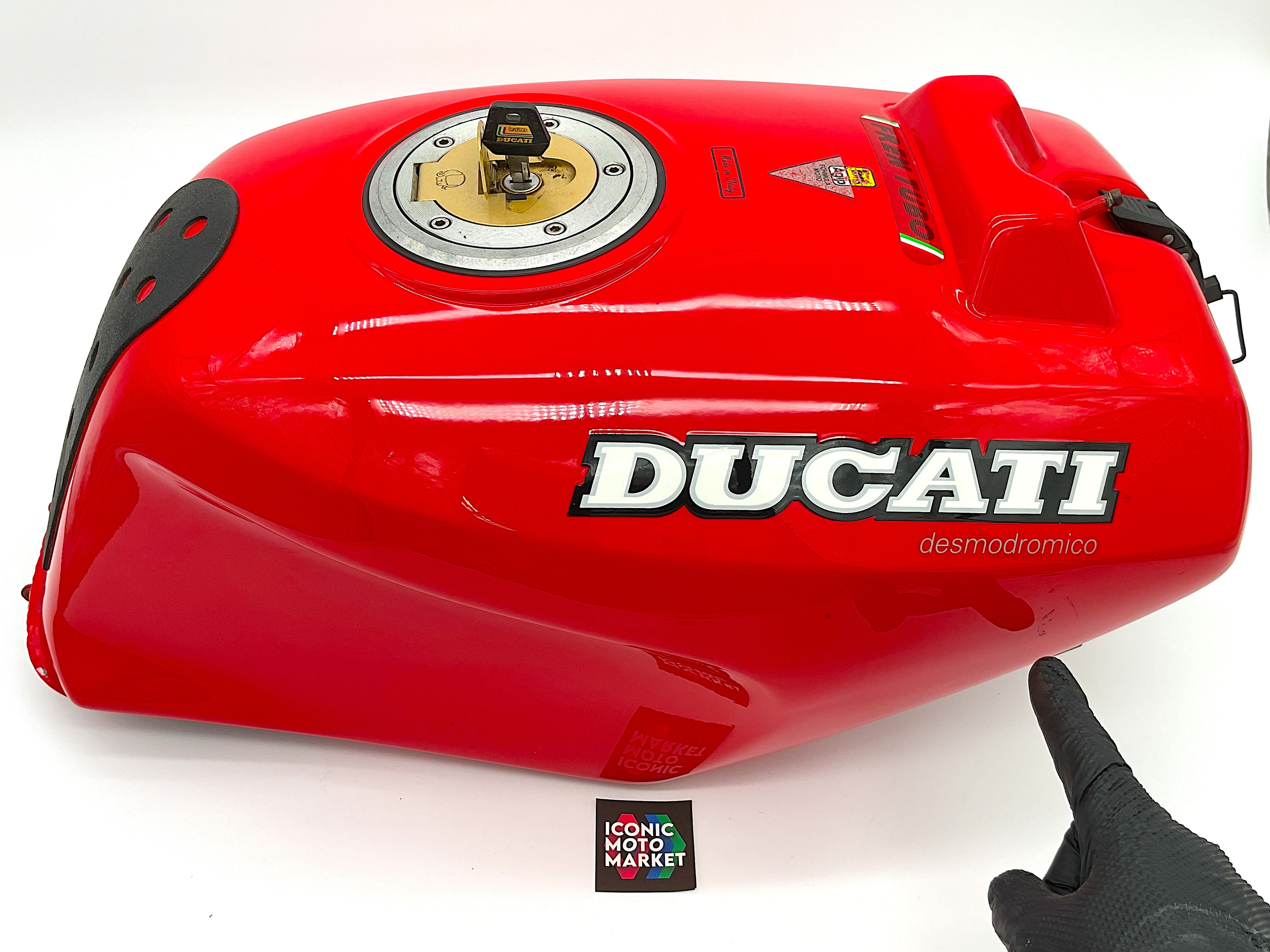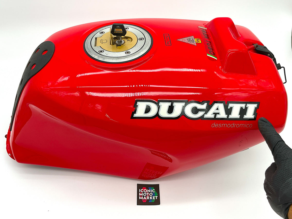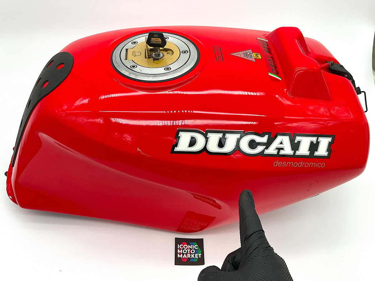 Ducati Genuine Parts - Fuel tank with cap & key, front strap. Very good condition, pre-owned, with light wear. Several small blemishes from regular use. Clean internally. This appears to be an SP series model tank, likely for the SP4, SP5. Please validate fitment by reviewing your service manual. Sold complete as shown (see pics)