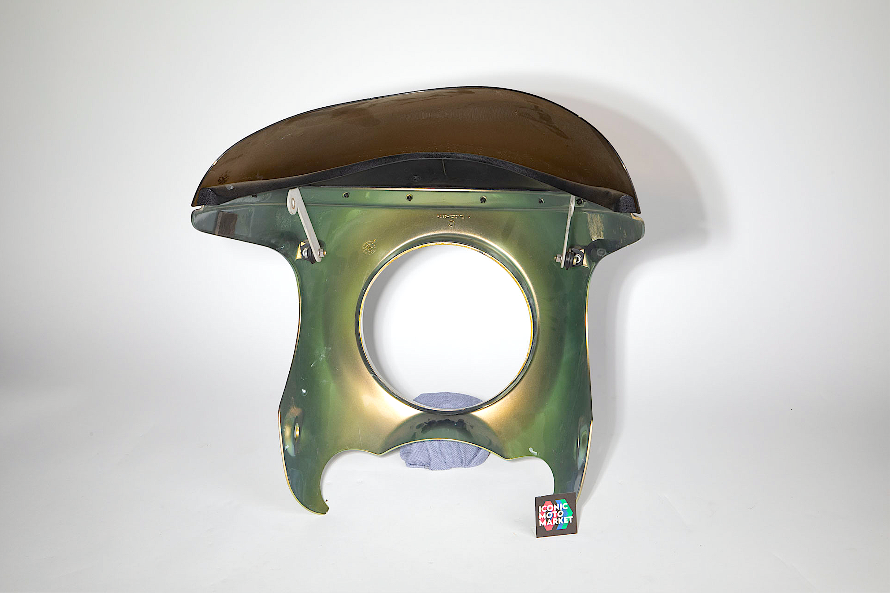 Description: Cafe racer front upper fairing with tinted screen. Originally a stock BMW cowl, this can be modified for fitment to a variety of classic motorbikes. Good condition, pre-owned, with light wear. Clean cosmetic piece, some light scratches to the clear coat found on the right-side (see pic #5). This piece would make for a finishing or add-on component for the right custom build. Sold as shown, as-is.