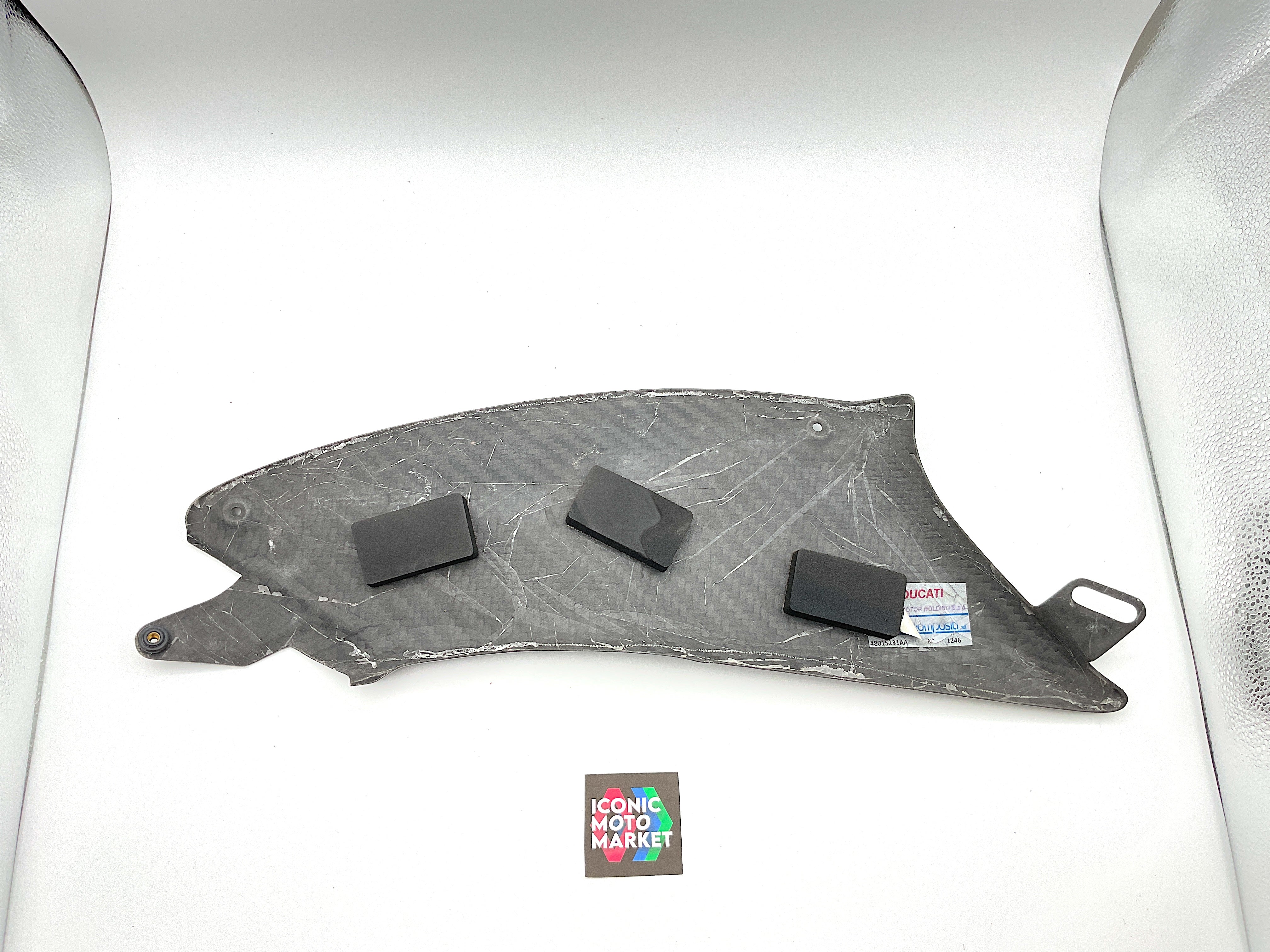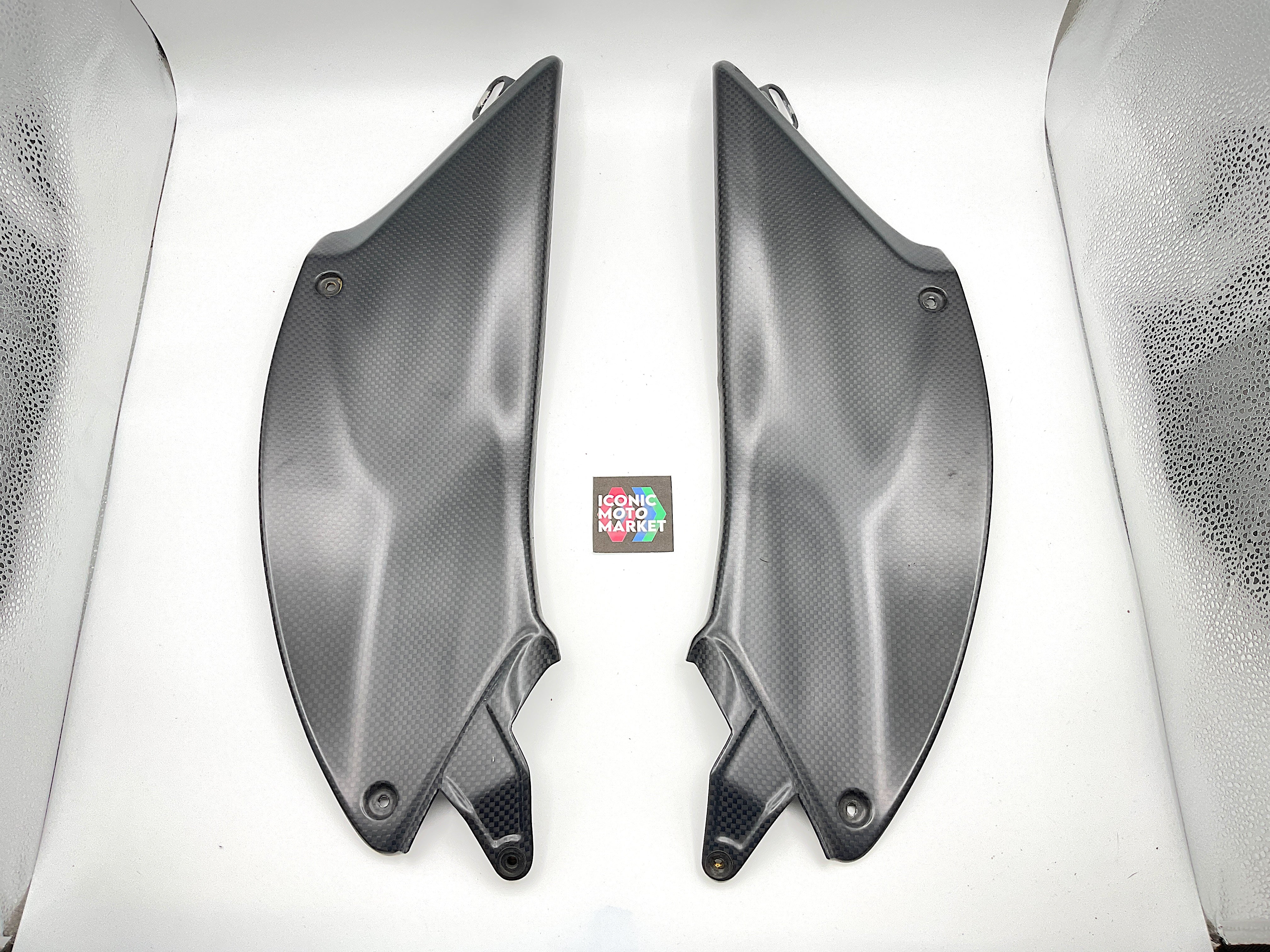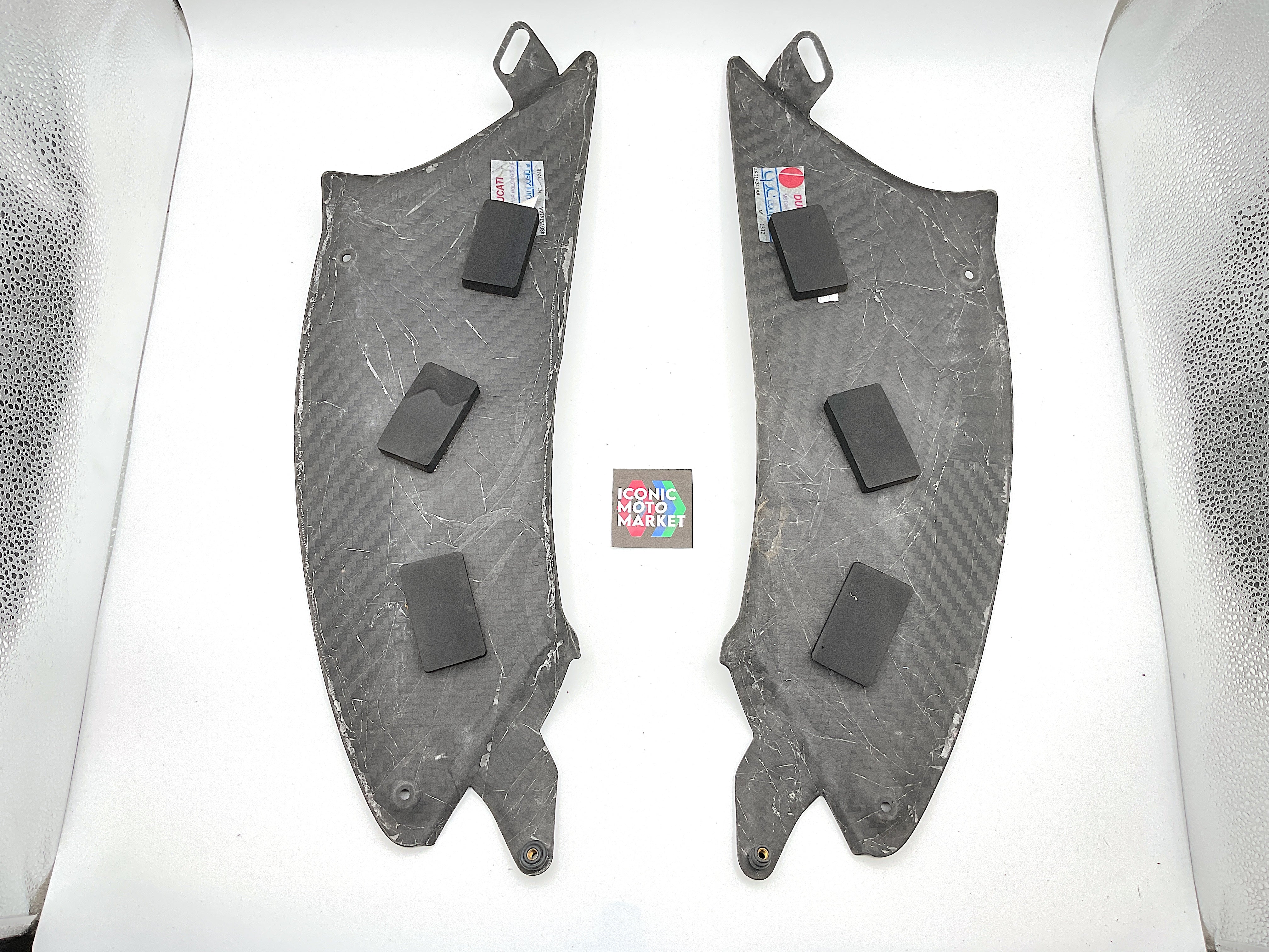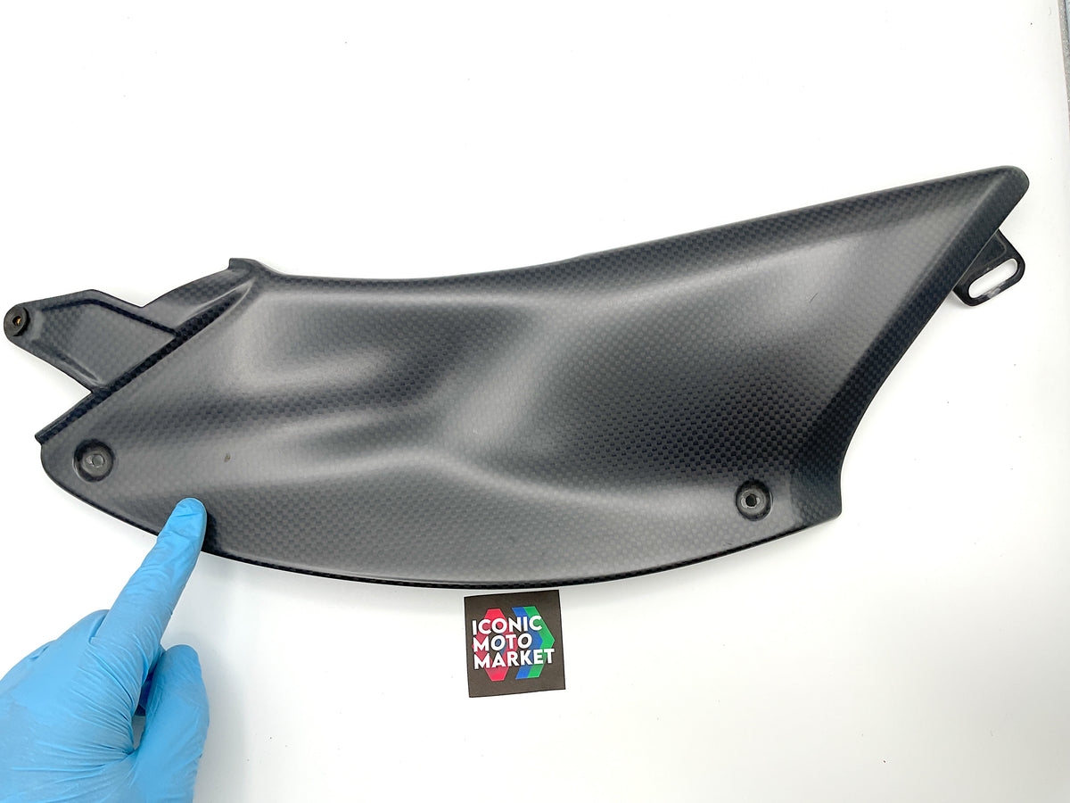 Genuine Ducati, carbon fiber, fuel tank fairing set LH/RH. Pre-owned - fine condition, with one light blemish to right-side fairing. Please refer to the attached images. Sold as-is.
