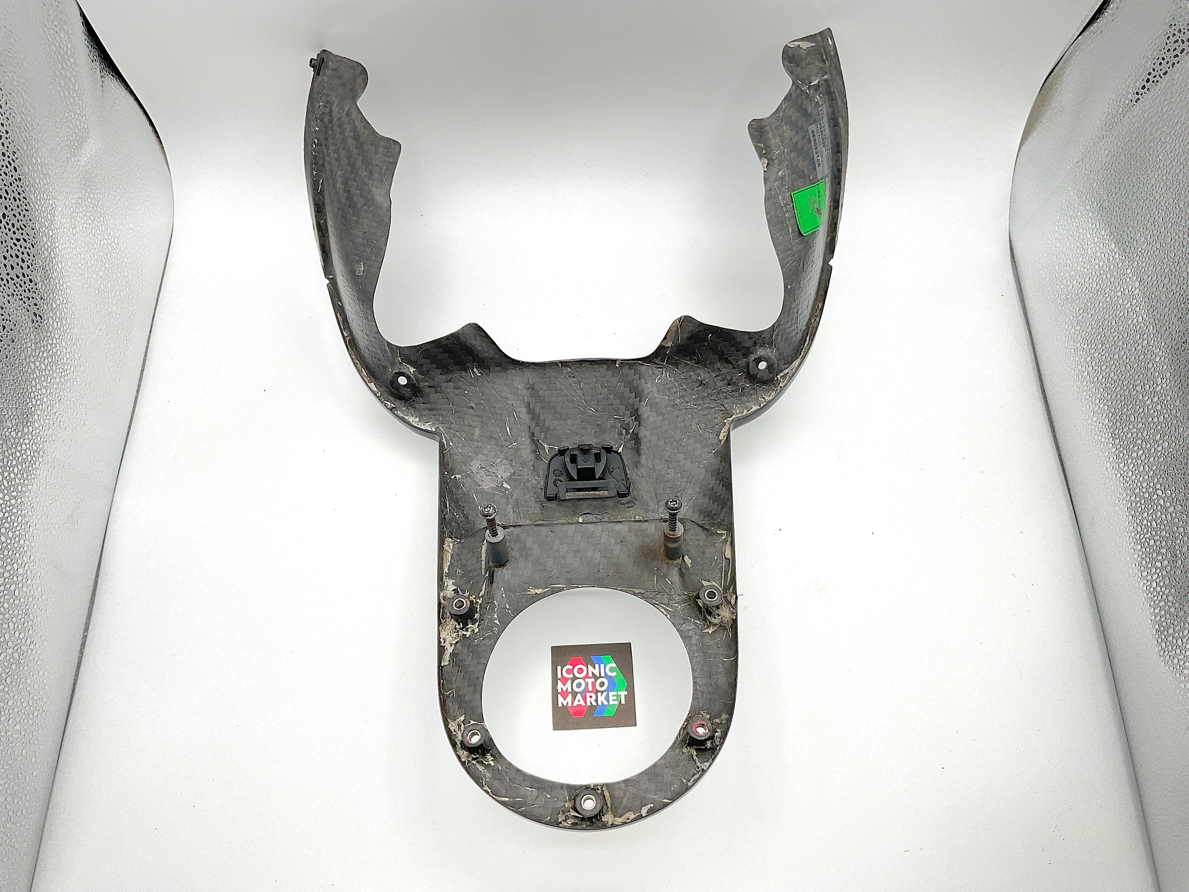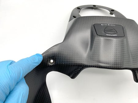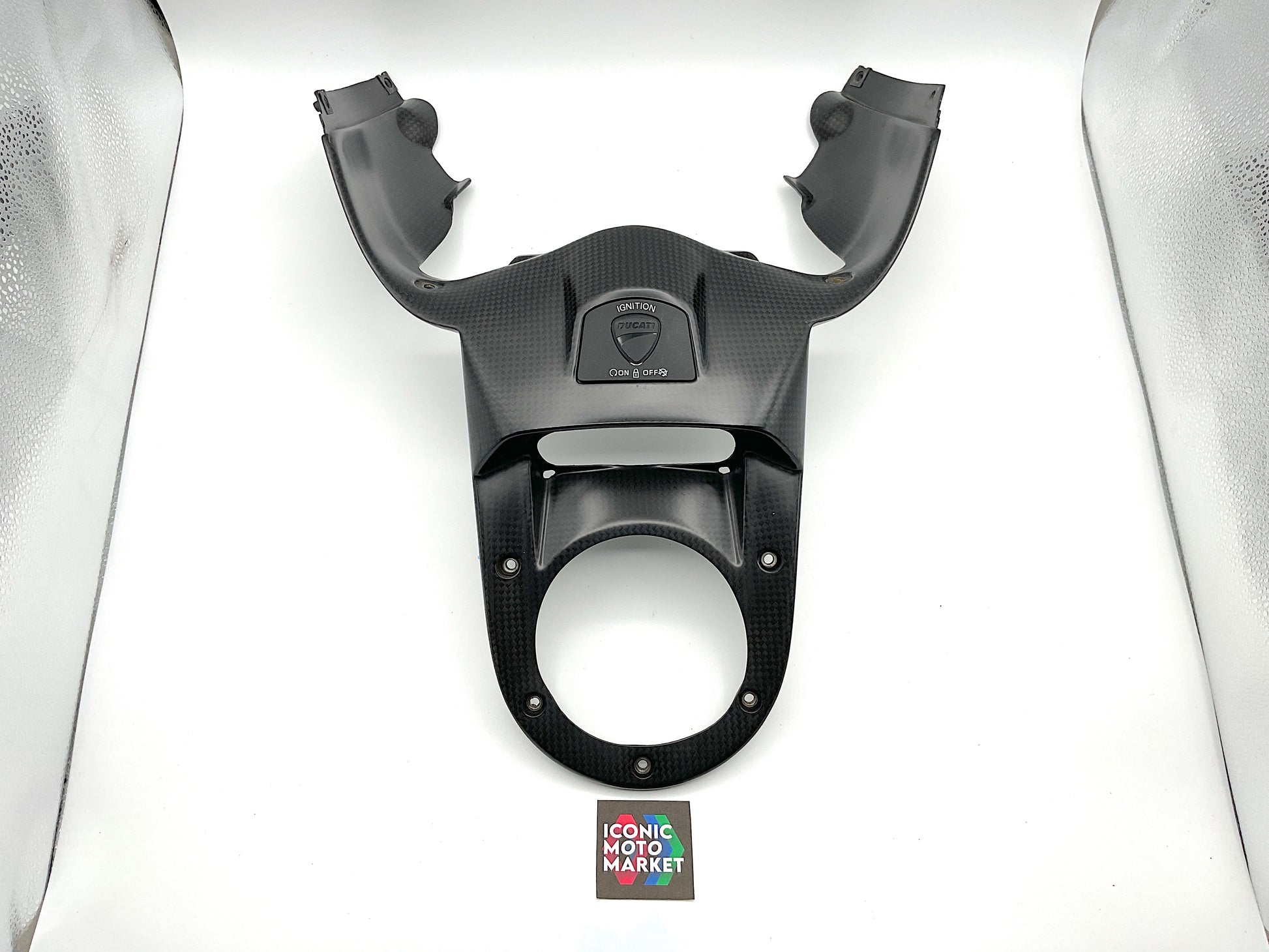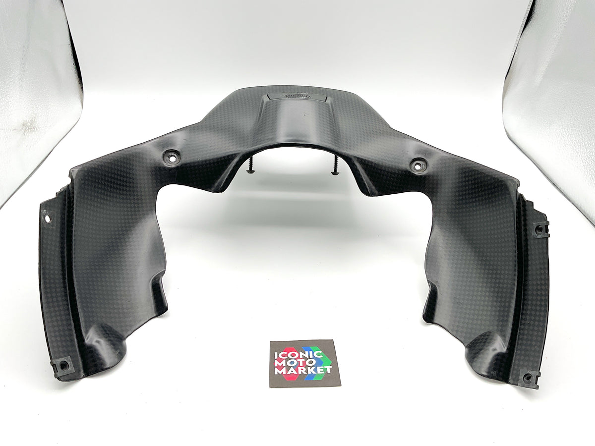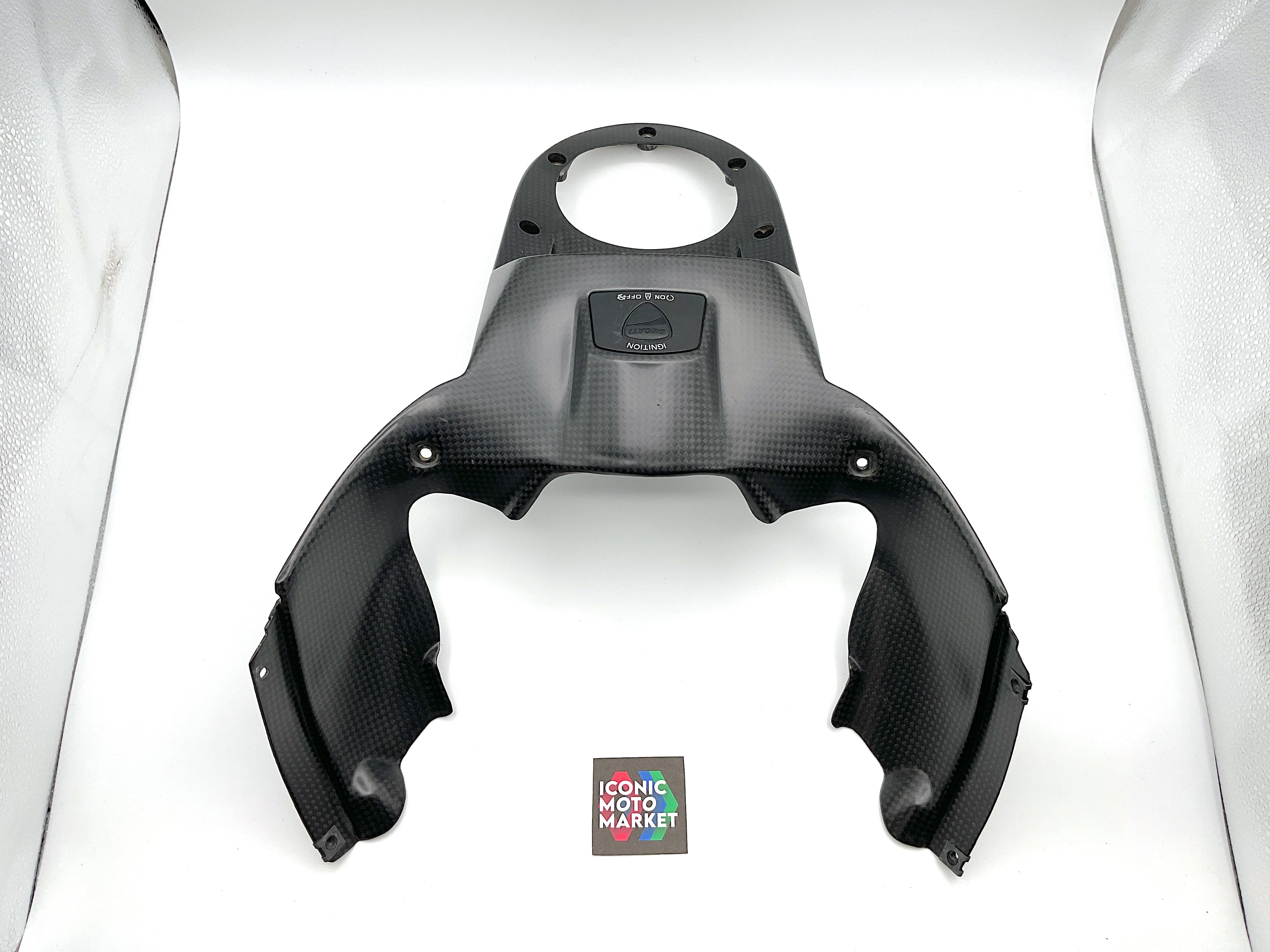 Genuine Ducati, carbon fiber, ignition switch cover. Pre-owned - very good condition, with wear and one light blemish. Missing one metal fastening tab, which can be purchased online. Sold as-is. Please refer to the attached images.