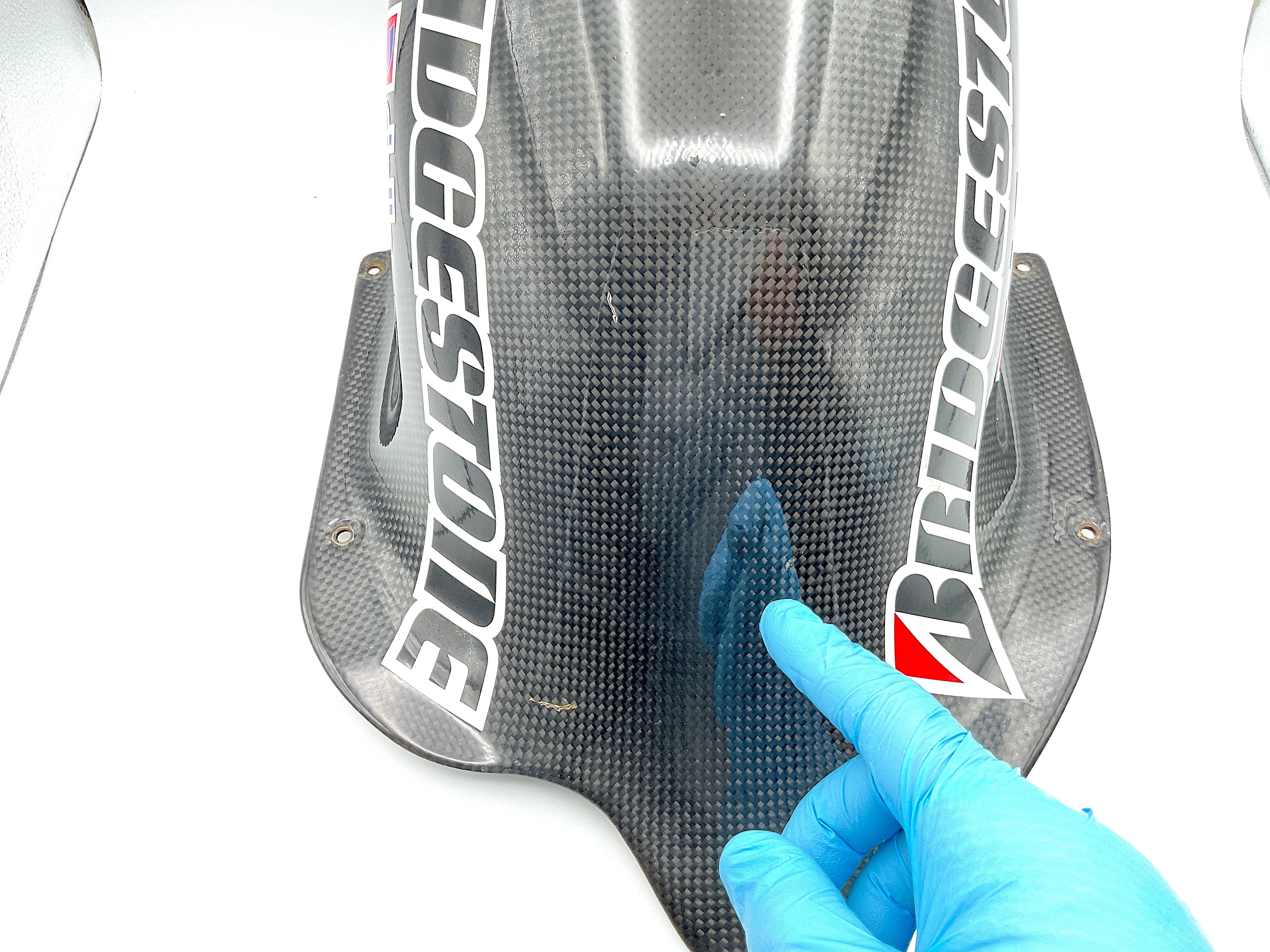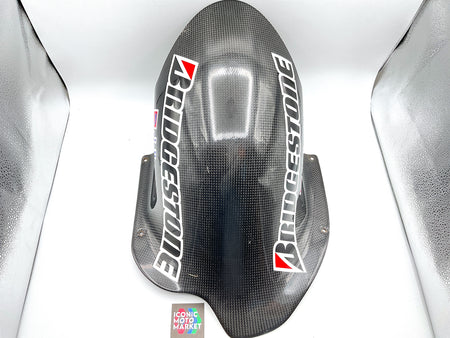 Carbon fiber, rear wheel fender. Pre-owned. Good condition, light wear with several blemishes. Please refer to the attached images.