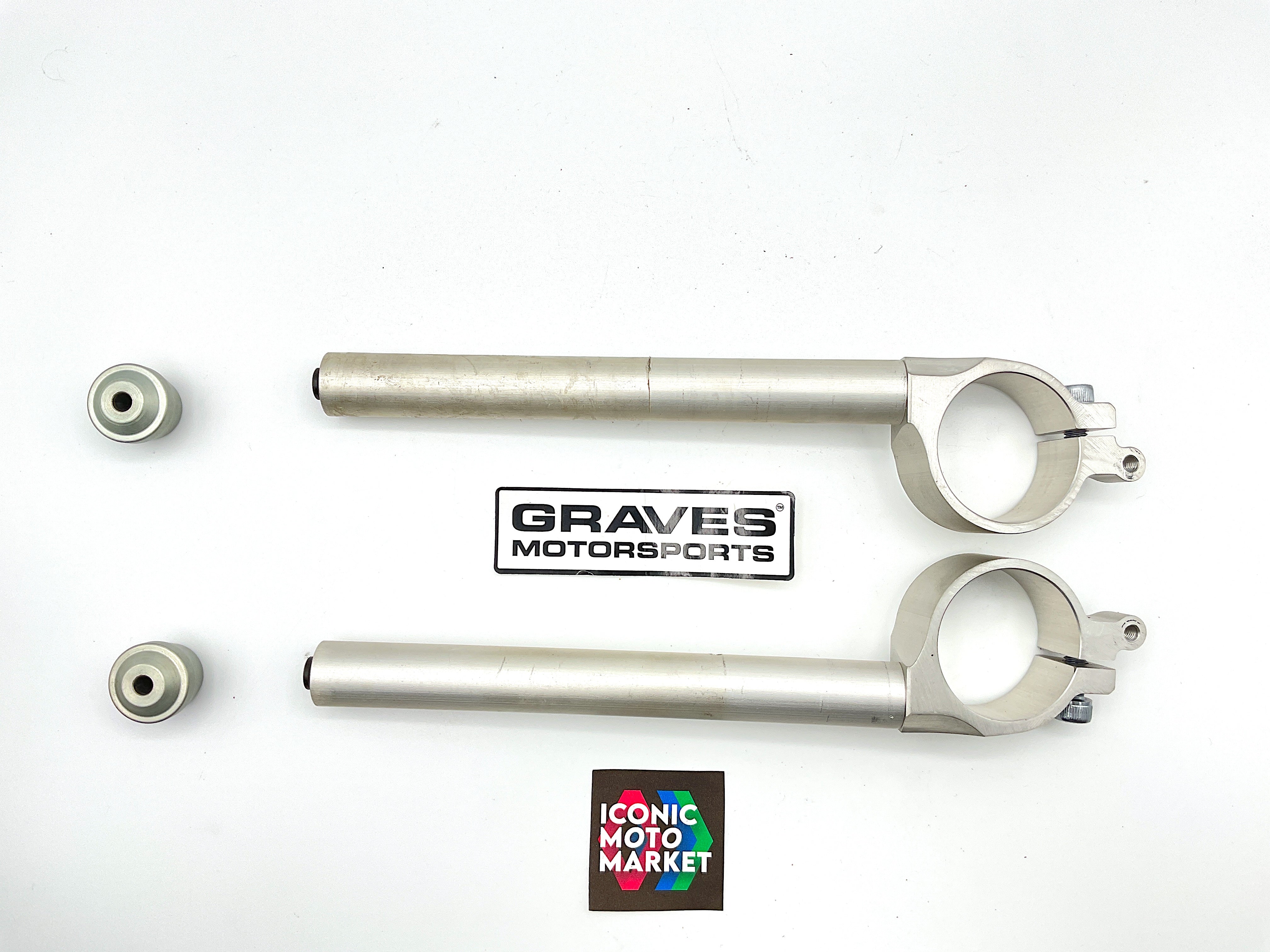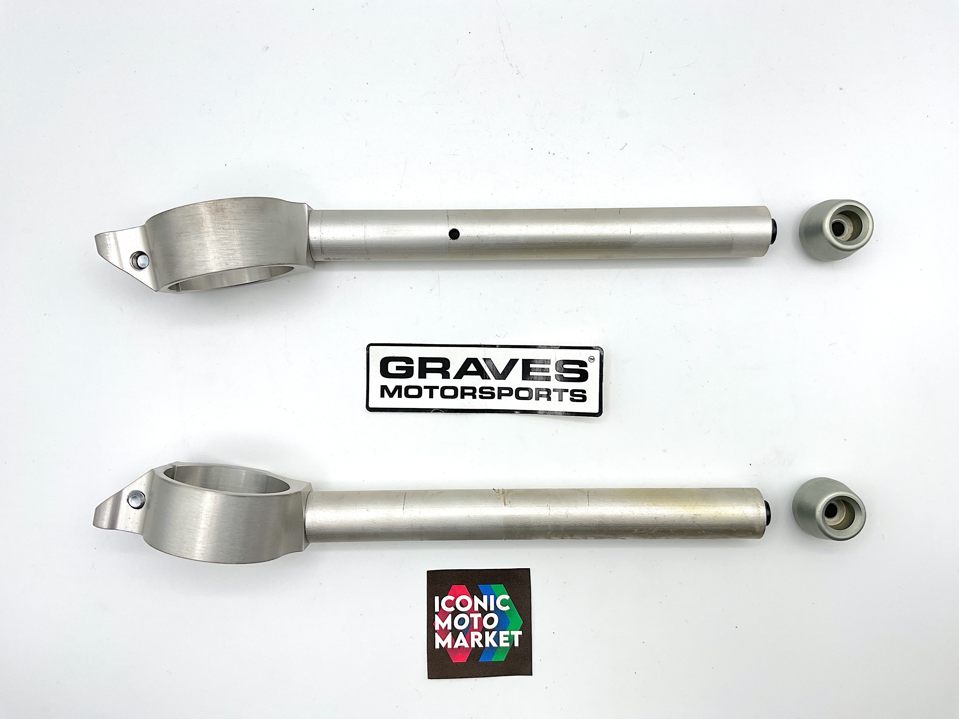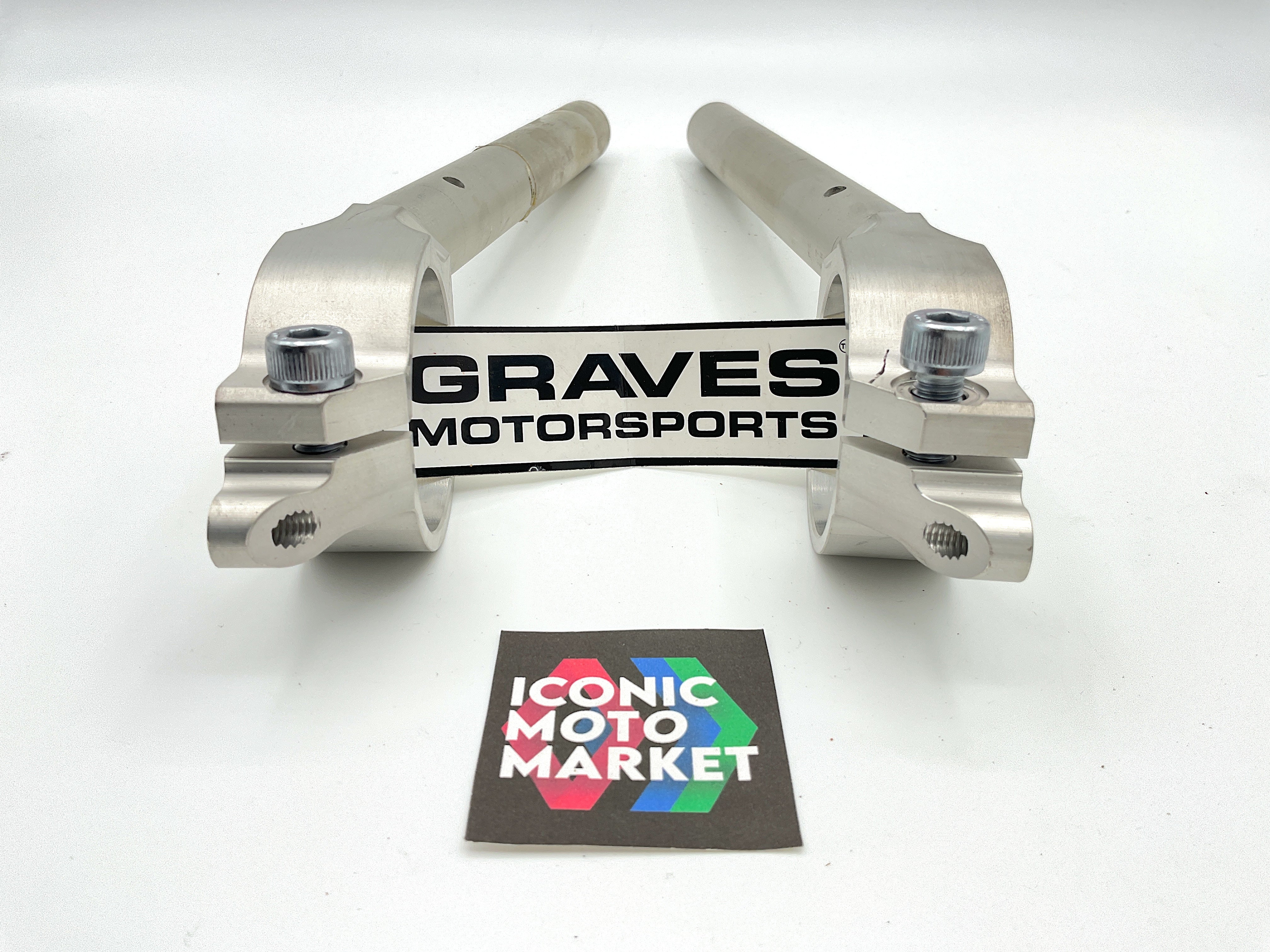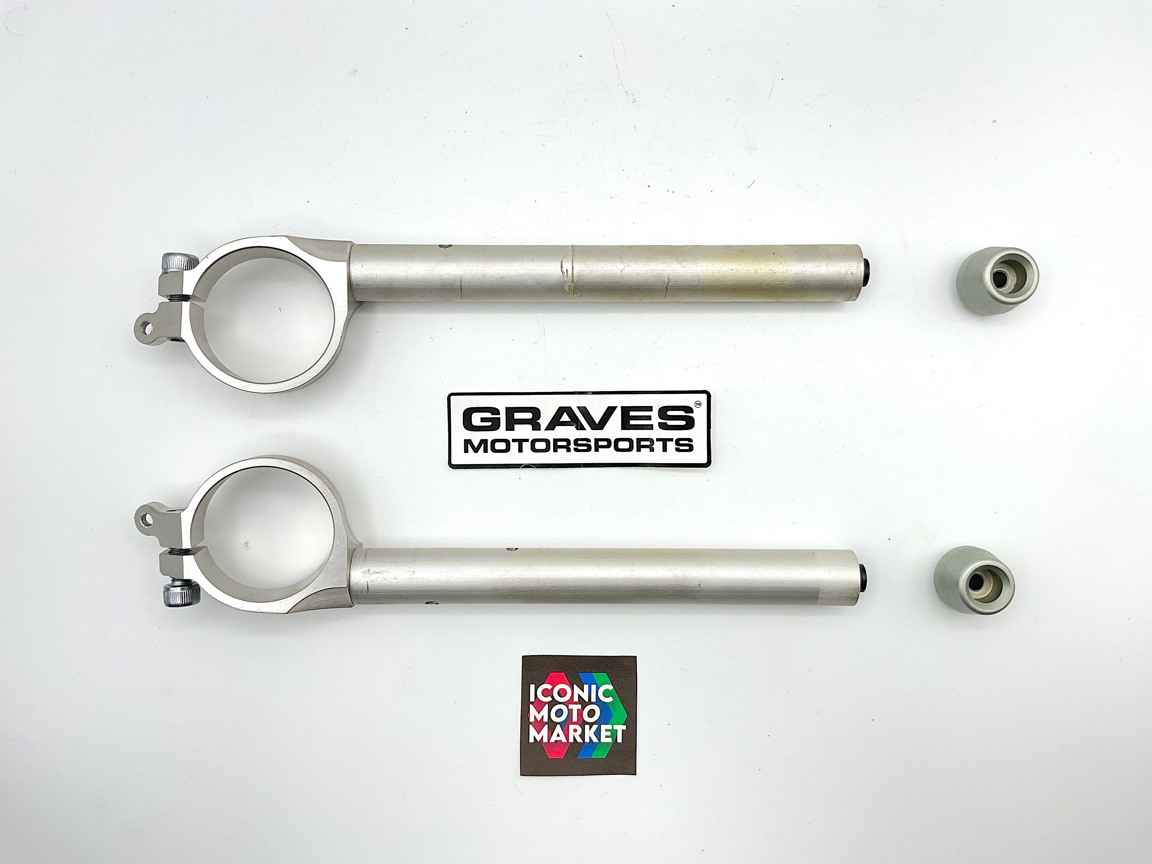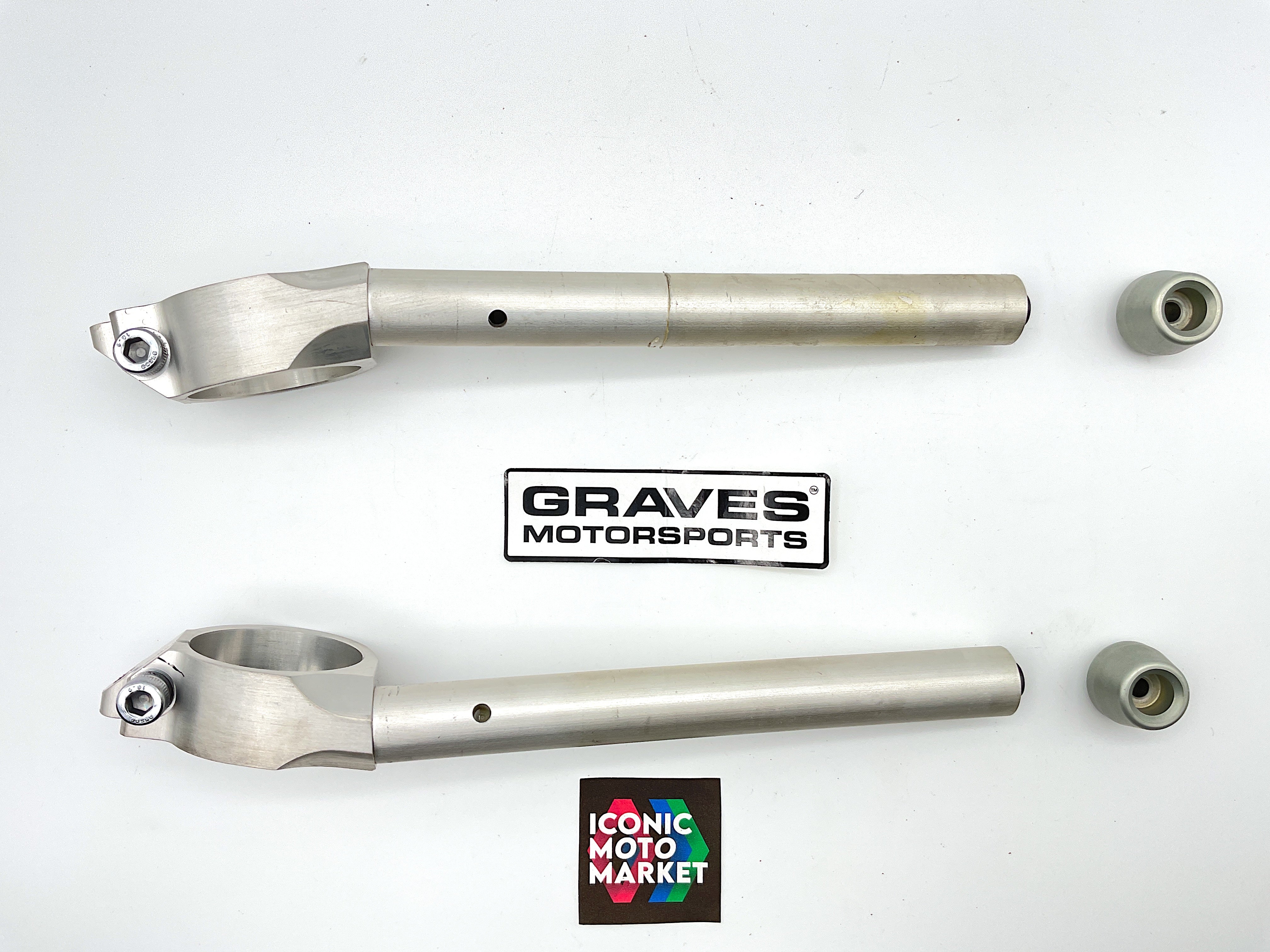 Graves Motorsports 50mm Clip-on motorcycle handlebars. These are CNC machined 7075-T6 billet aluminum clamps for superior strength and rigidity. Pre-owned, with light wear. Please refer to the attached images.