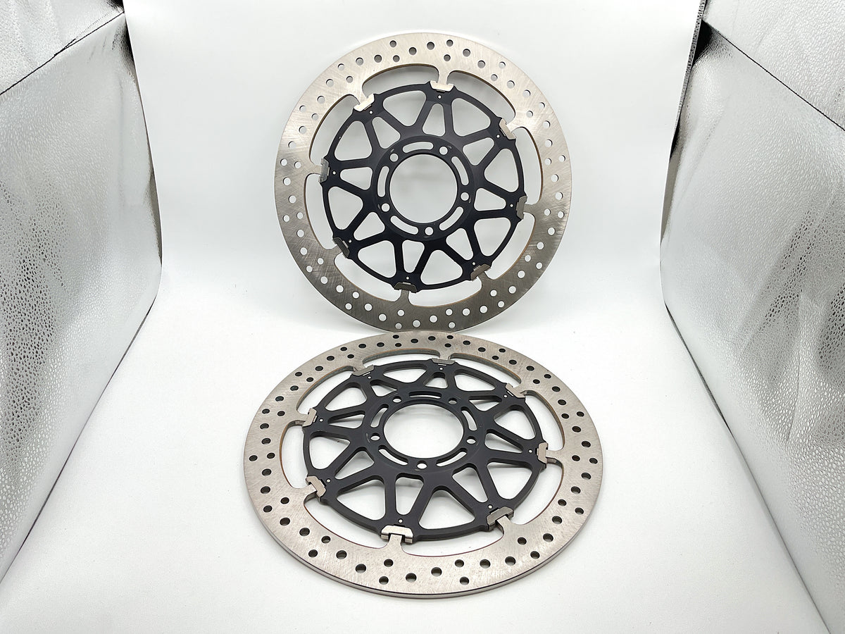 This set is 330mm brake rotors are new-in-box. There is a single light circular blemish on one side, and this was found on closer inspection by our techs. The rotors were removed from the packaging for photographic purposes only.
