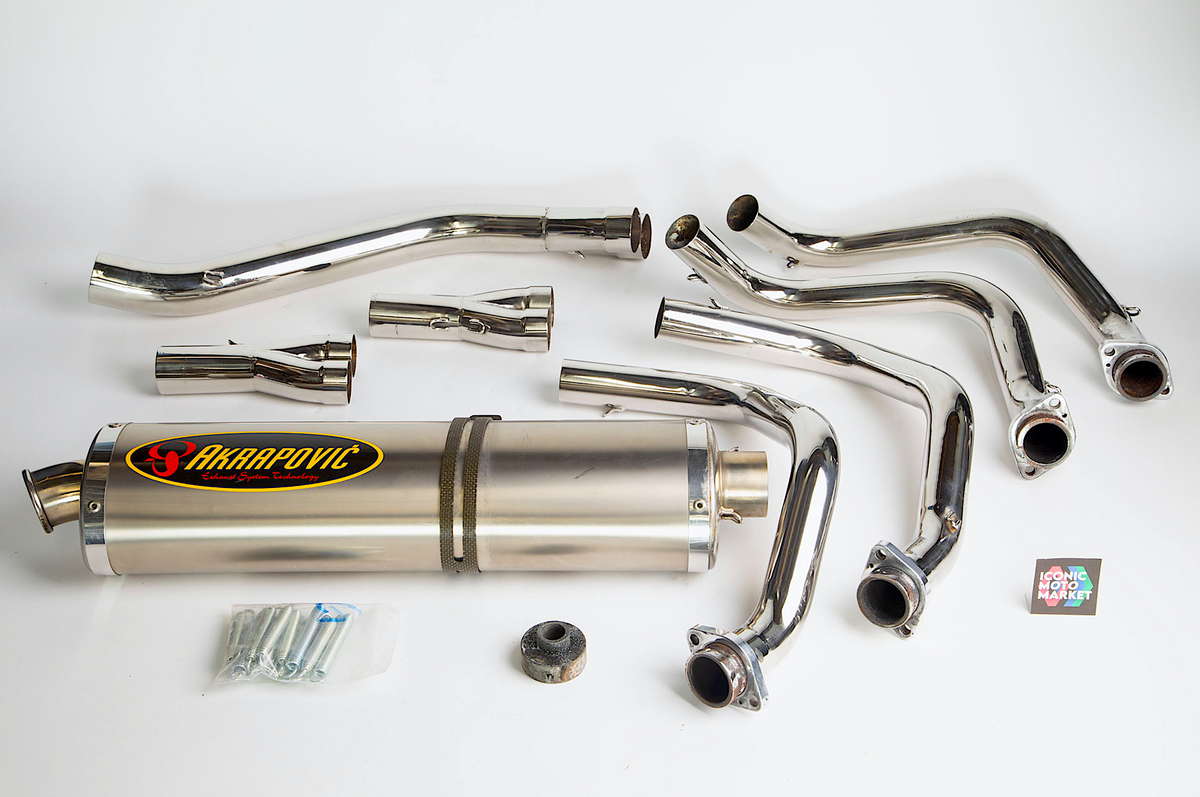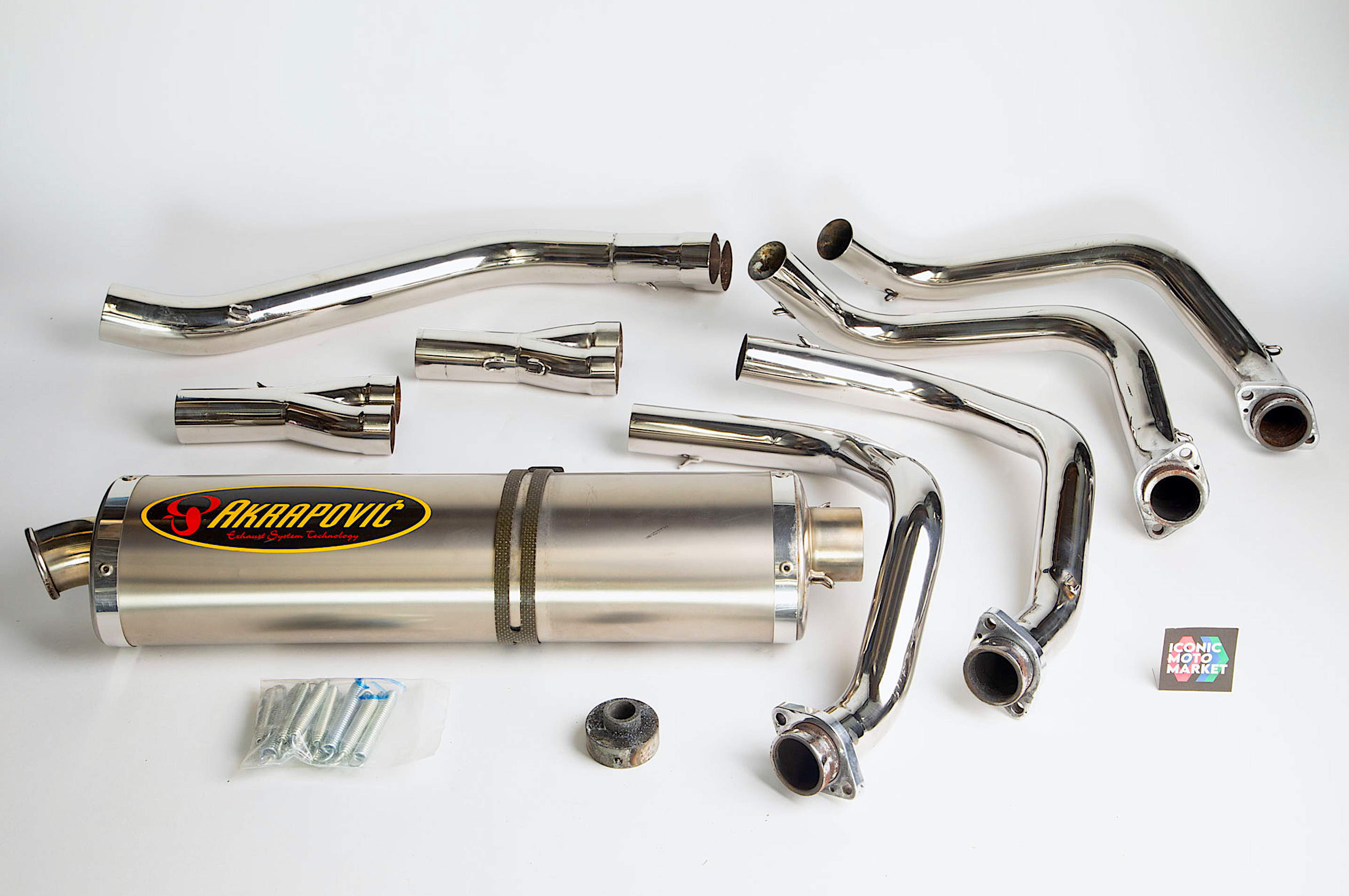 Akrapovic Quality Products: Supersport 4-2-1, full exhaust system w/ db killer. Very good condition, pre-owned, with mild wear. Investigation of this system reveals light scratches on the canister - facing towards the chassis, with a few marks on the outside circumference (see pics #1-2). Overall quite clean. Sold complete with everything as shown, as-is.