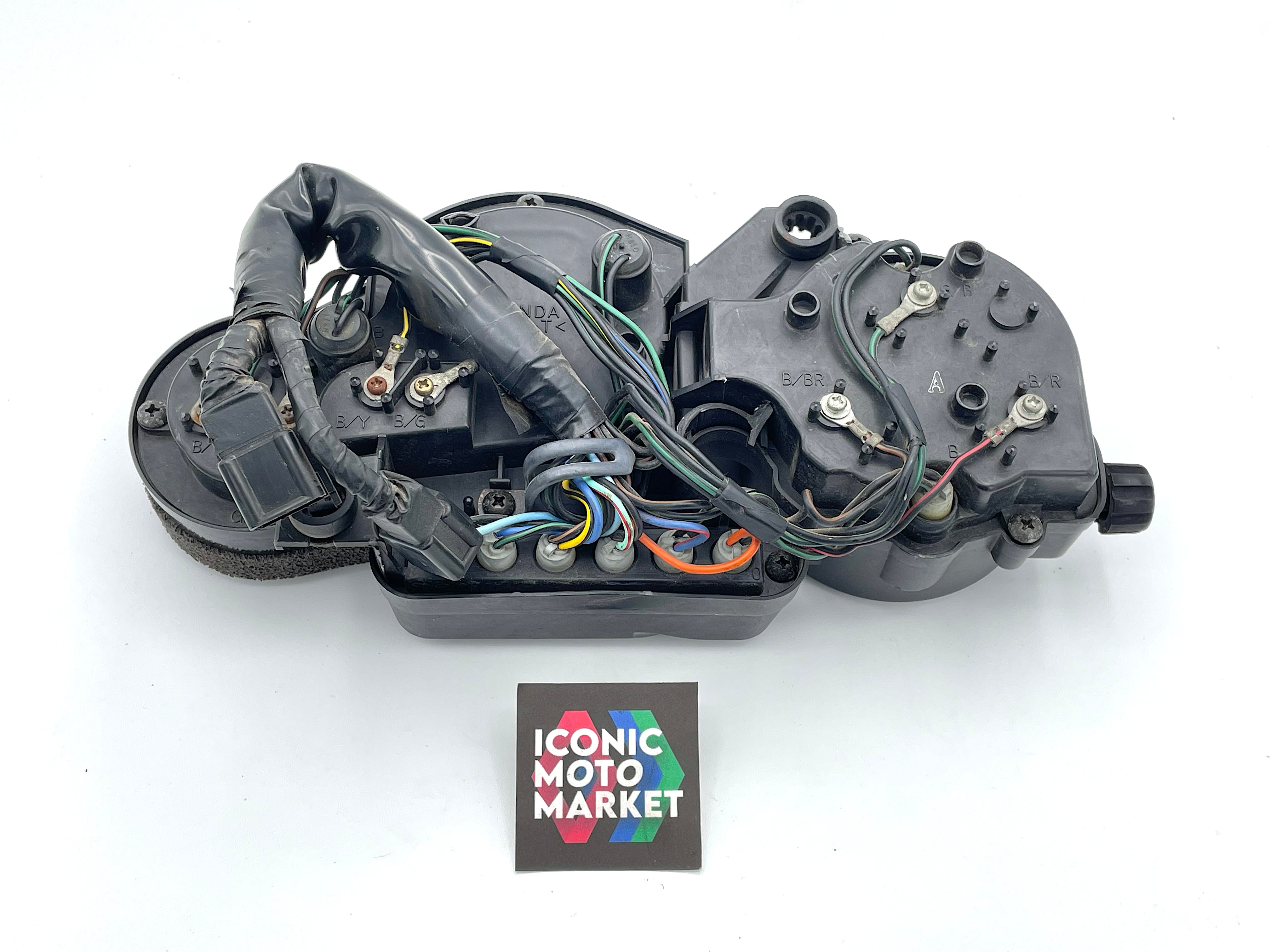 Honda Genuine Parts - Speedometer/tachometer gauge cluster assembly. Very good condition, pre-owned, with light wear. Solid cosmetically, with one indent to plastic near the display lights (see pic #3). Wire loom at rear is in remarkable condition. Sold complete as shown, as-is.