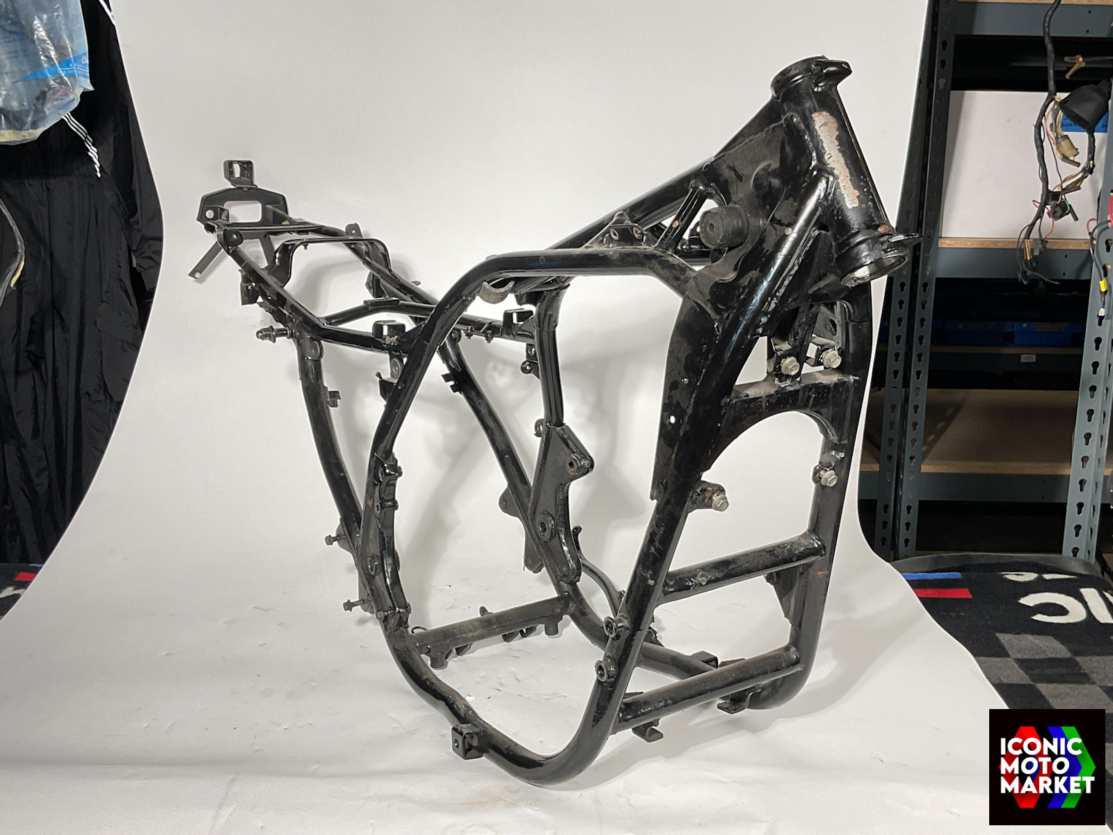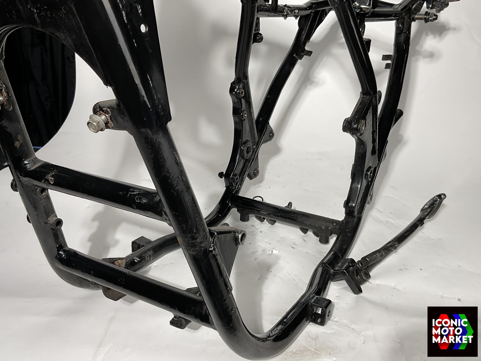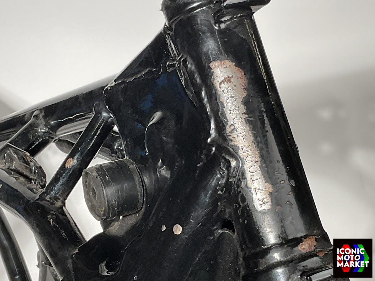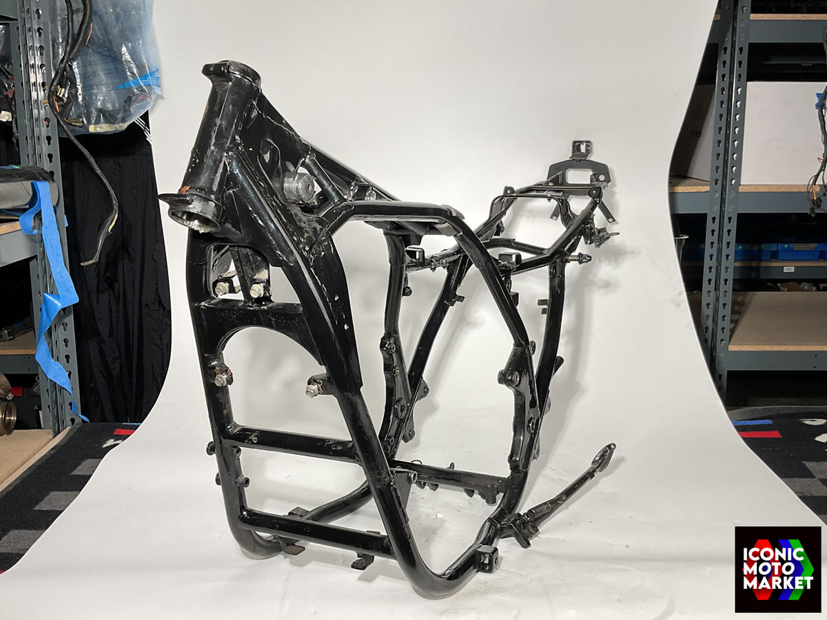 Kawasaki Genuine Parts: Frame, chassis. Good condition, pre-owned, with use. Further inspection reveals mild wear, paint imperfections, blemishes, with some surface corrosion. The kickstand (shown) is included. This bike is sold with a bill of sale only. Sold as shown, as-is.