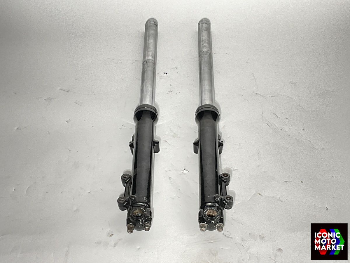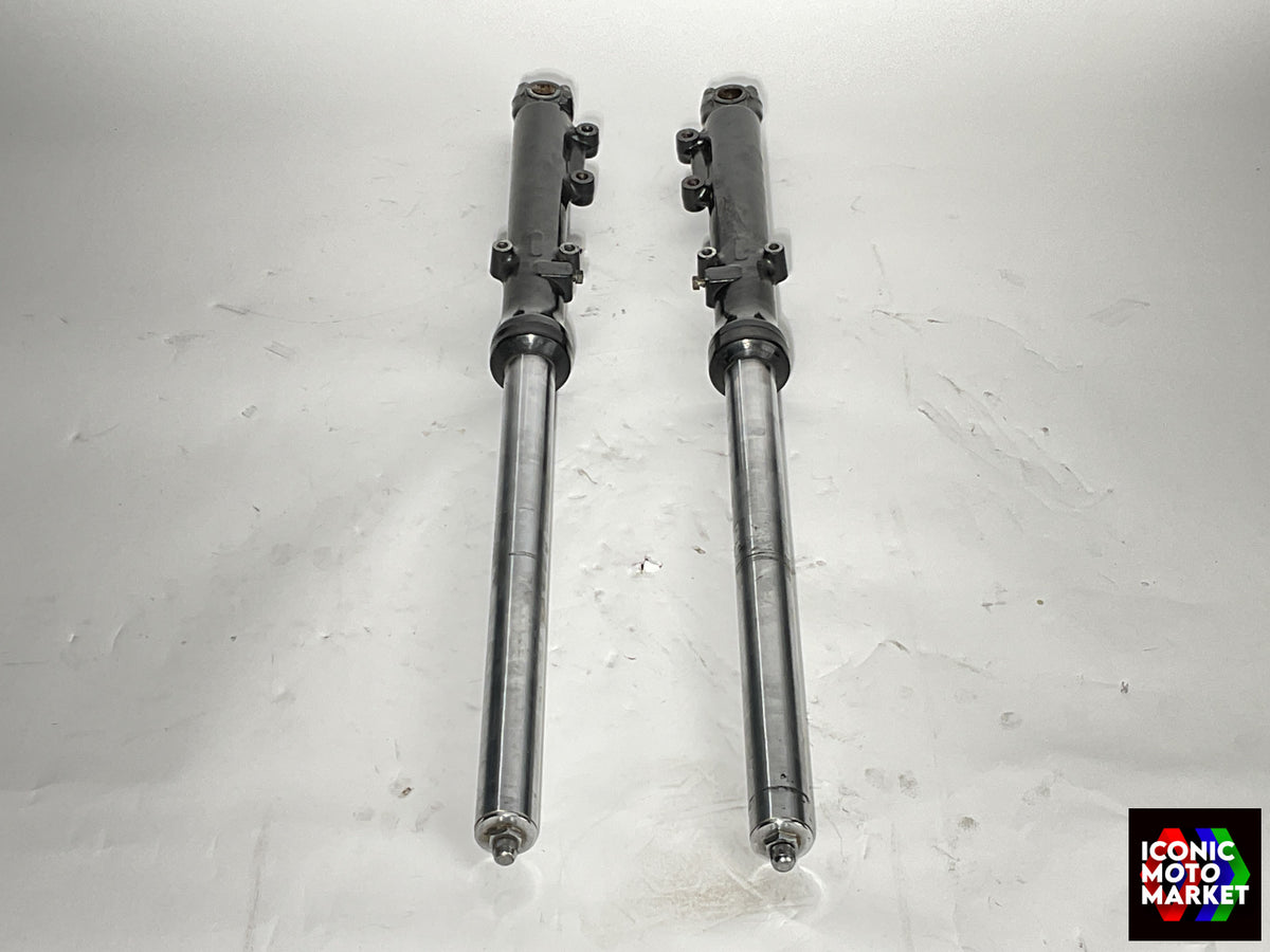 Kawasaki Genuine Parts: Front forks. Good condition, pre-owned, with wear. These parts are not readily available, and would make for a very good acquisition and restoration piece when completing a Classic Eddie Lawson replica KZ1000. Sold complete as shown, as-is.