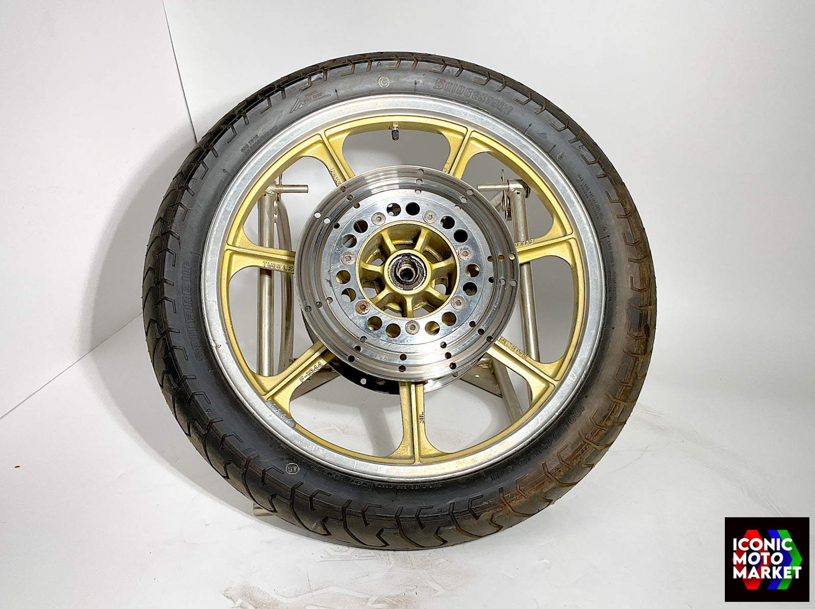 Kawasaki Genuine Parts: Front wheel, 19" x 1.85", gold color. Good condition, pre-owned. Brake disc rotors included, as shown/as-is. Further investigation of the unit reveals cosmetic blemishes from regular use. Due diligence should be performed by inspecting and/or replacing wear items such as bearings and brake components before use. Sold as shown, as-is. All sales final.