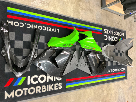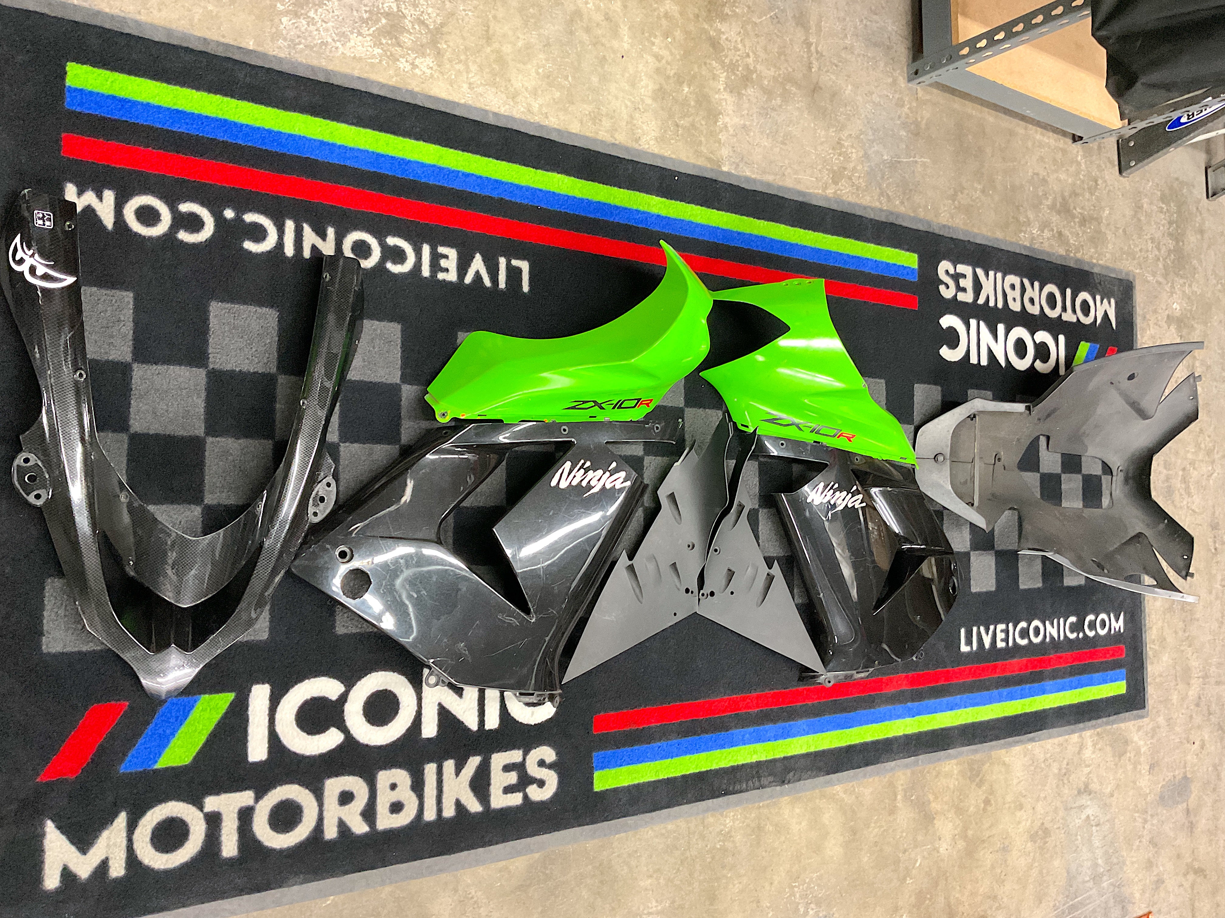 Set includes uppers, mids, lower belly 2-pc, and internal fairings. Great opportunity to acquire an OEM set of ZX-10R Ninja fairings. Sold complete as shown. (see pics)
