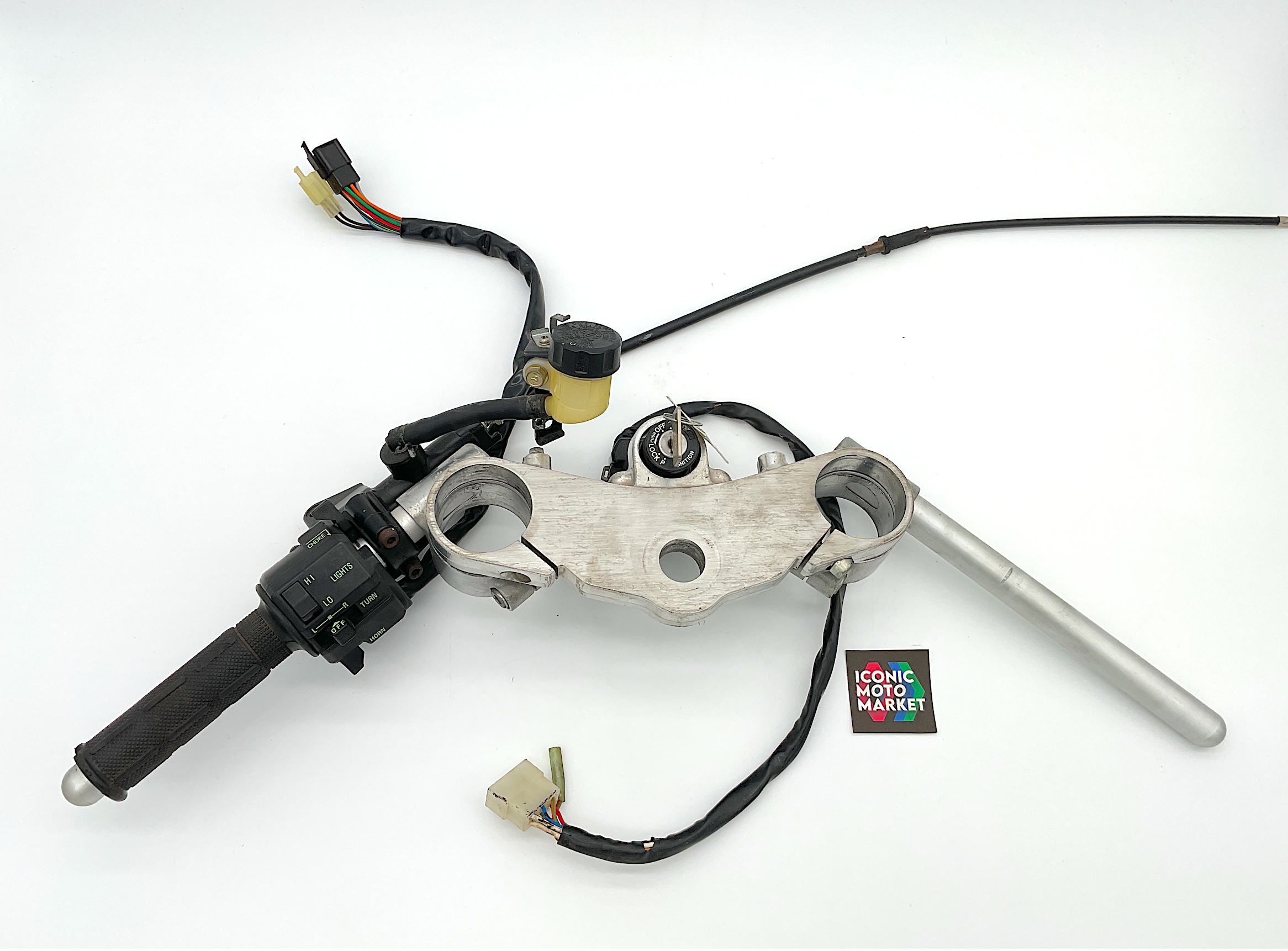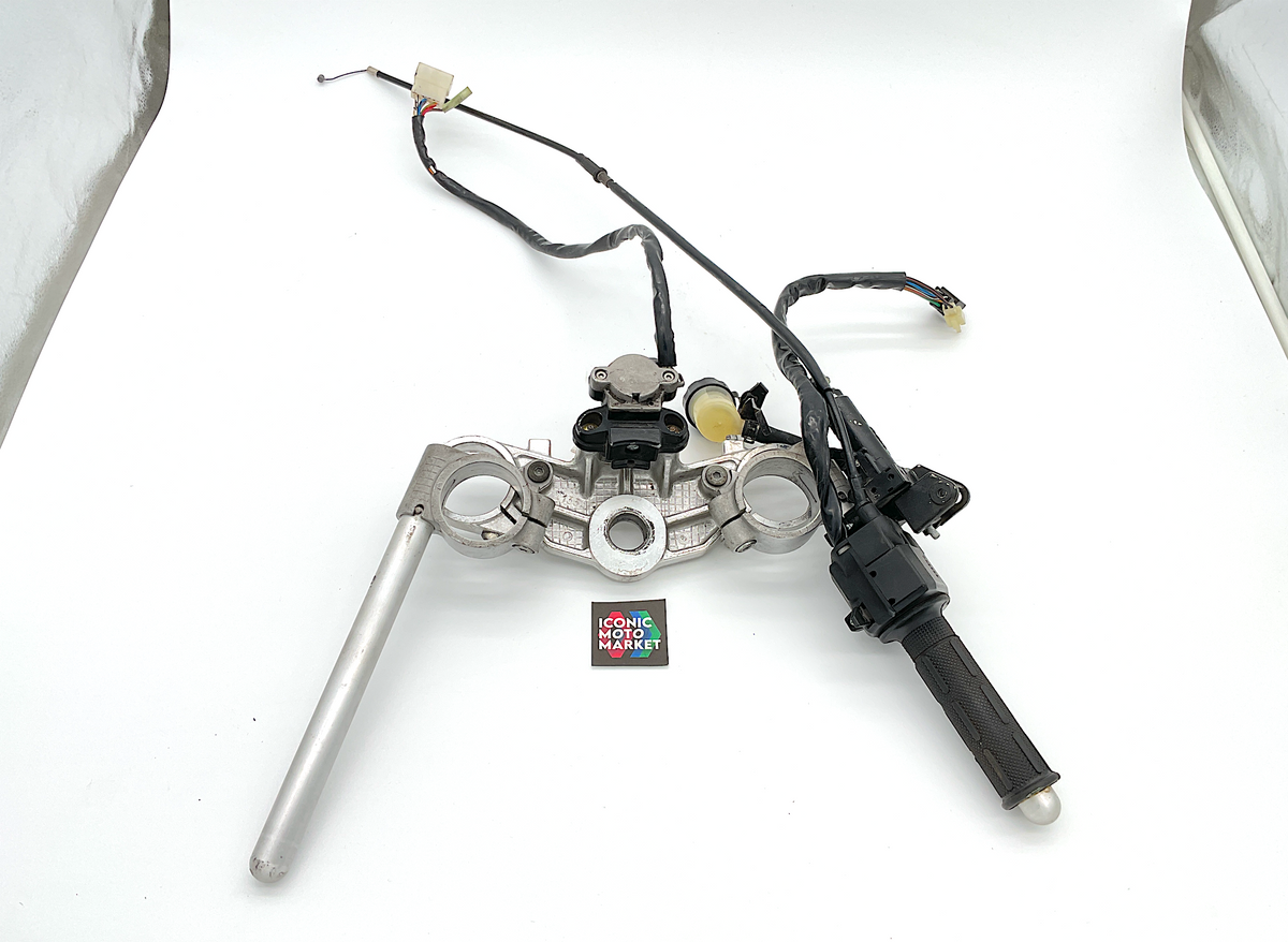 Kawasaki Genuine Parts - Top triple, left-hand switch assembly, handlebars, ignition w/ key, clutch assembly/reservoir. NOTE: Clutch lever is not included. Good condition, pre-owned, with wear. Sold as shown, as-is.
