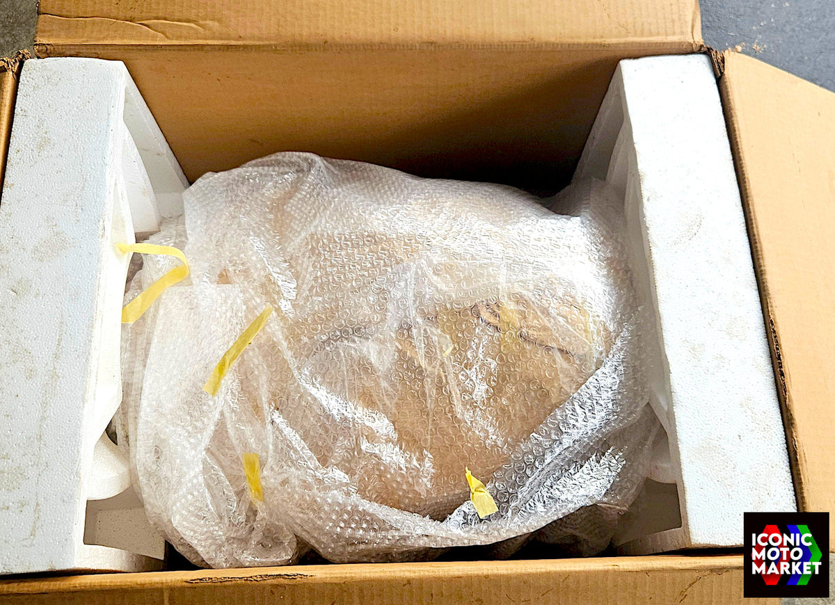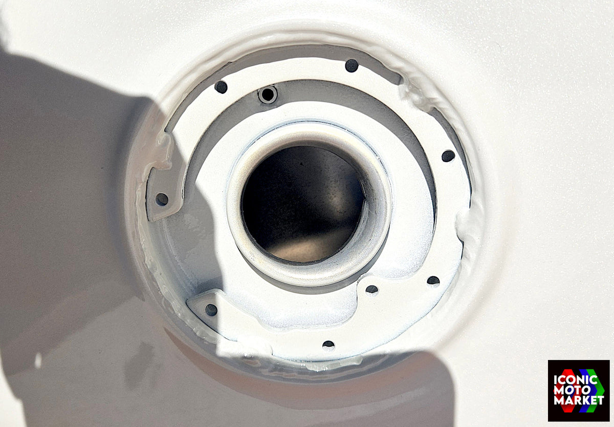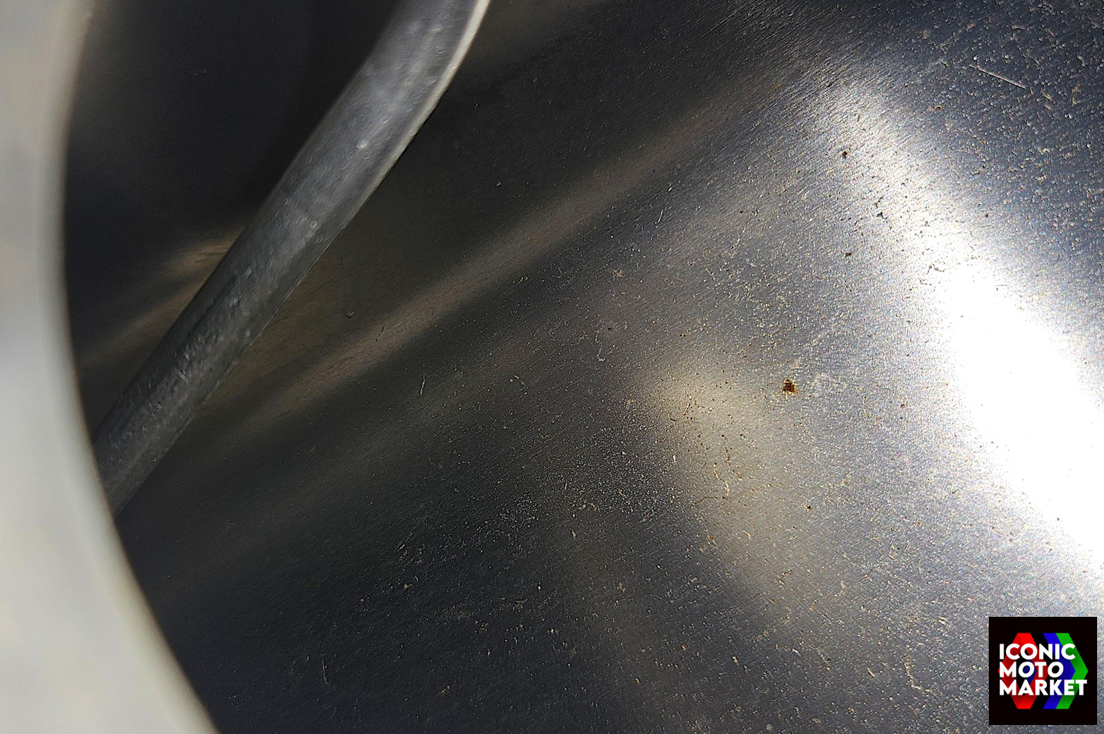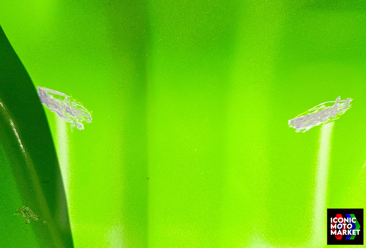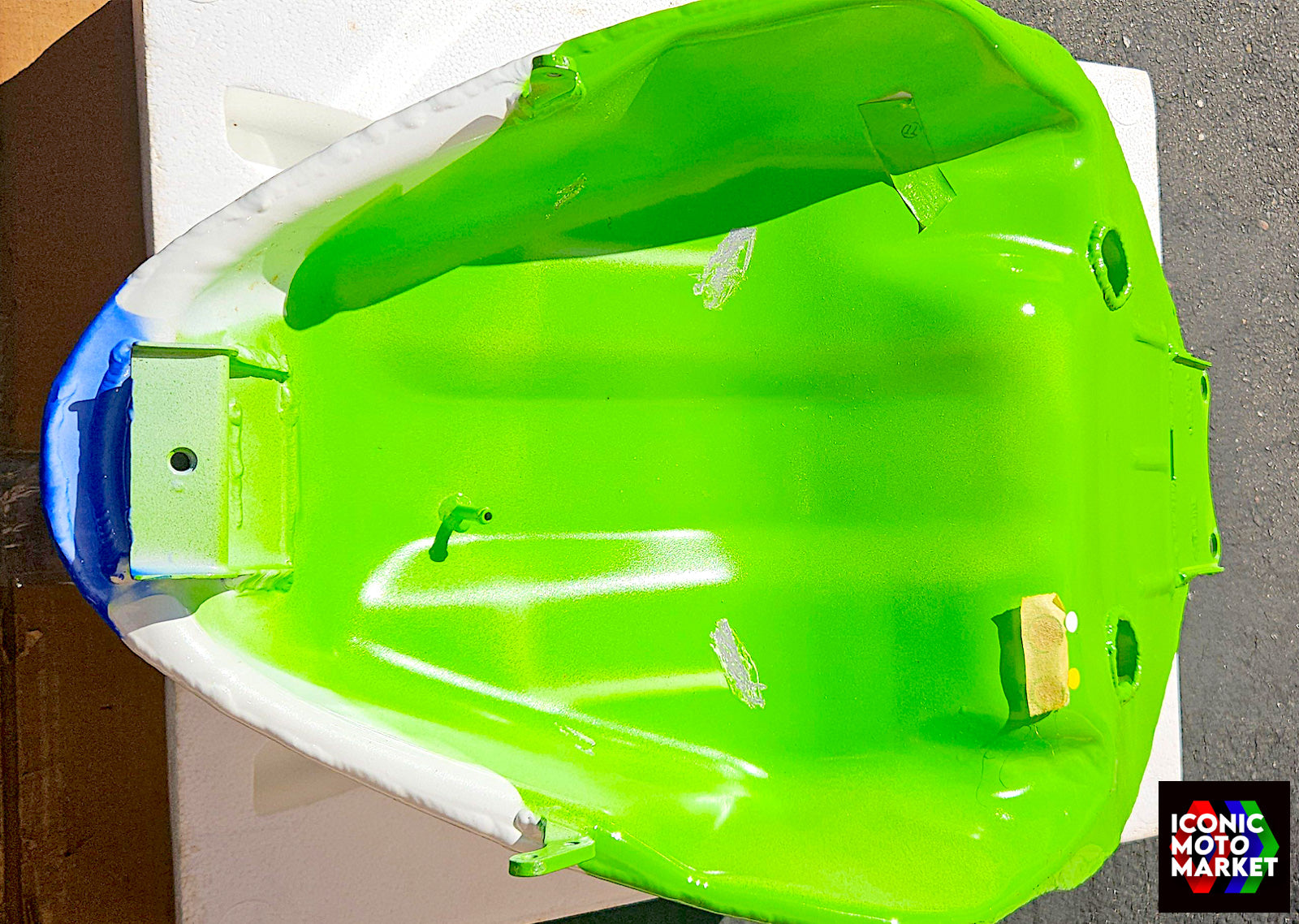 Kawasaki Genuine Parts: Aluminum fuel tank. Rare and very good condition, clean cosmetically and internally. Further inspection of this tank reveals several marks to the underside (see pics #14-15), and there appears to be a light imperfection ... not clearly visible but found on the left-side, which looks to be a handling or storage type blemish (see pic #1).