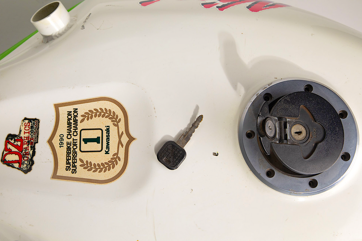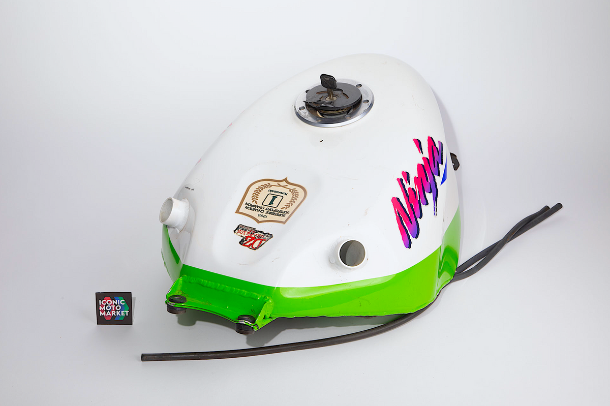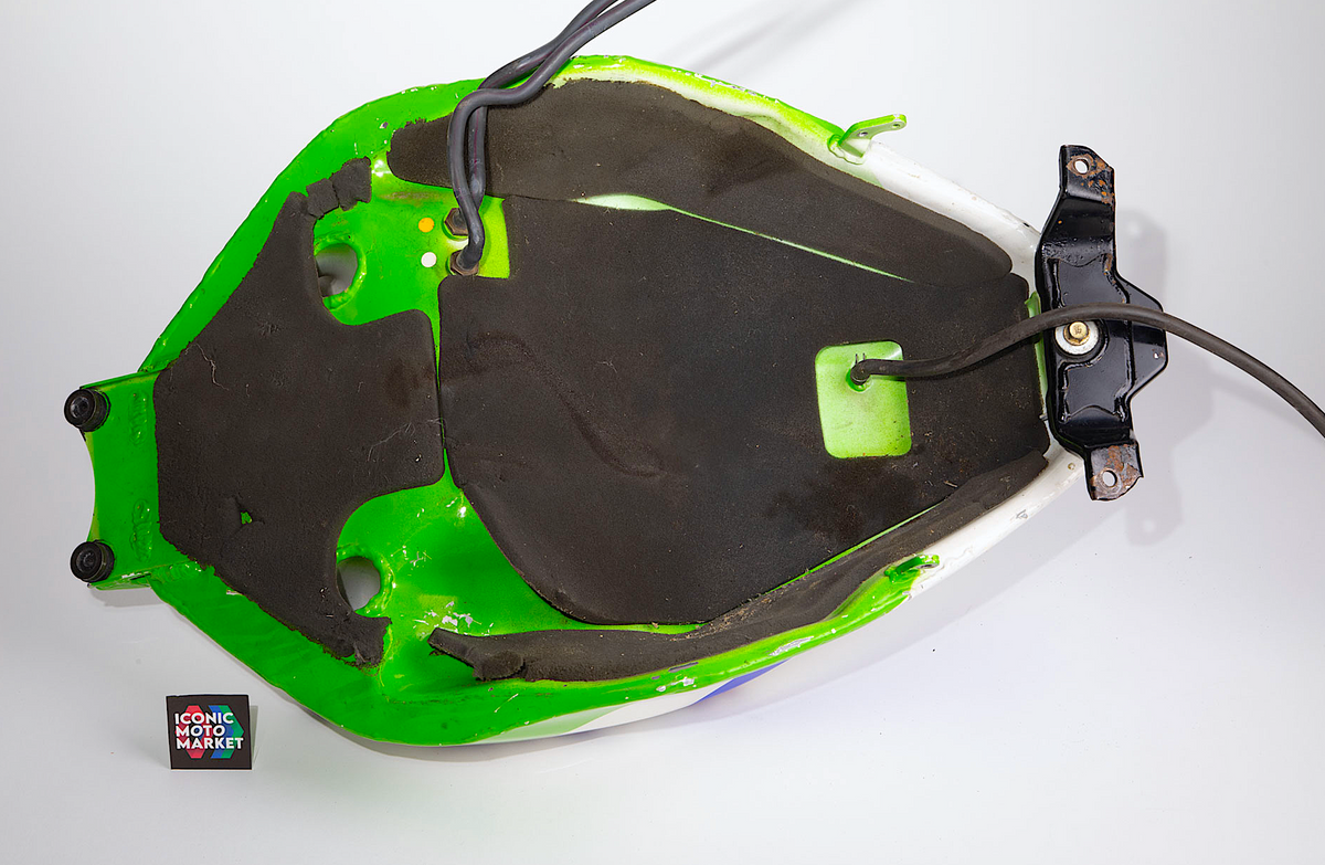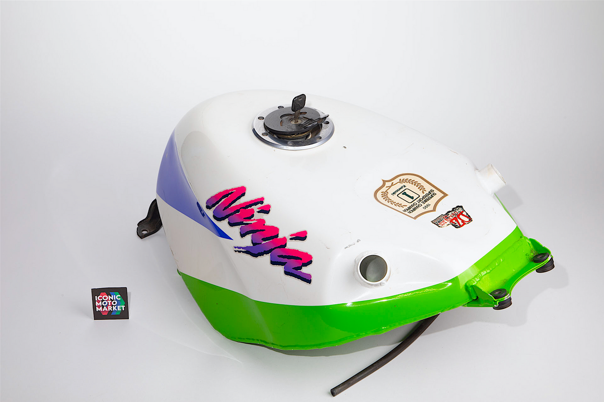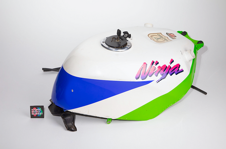 Kawasaki Genuine Parts: Aluminum fuel tank, with fuel cap & key. Good condition, pre-owned, with mild wear. The key is bent (see pics #10-11). Investigation of this tank reveals light scratches, blemishes in the paint, but overall very clean. There is no appearance of a ding or dent in our findings. This is a solid specimen for some lucky ZX-7R owner out there, looking to upgrade to a better tank - or restoration project.