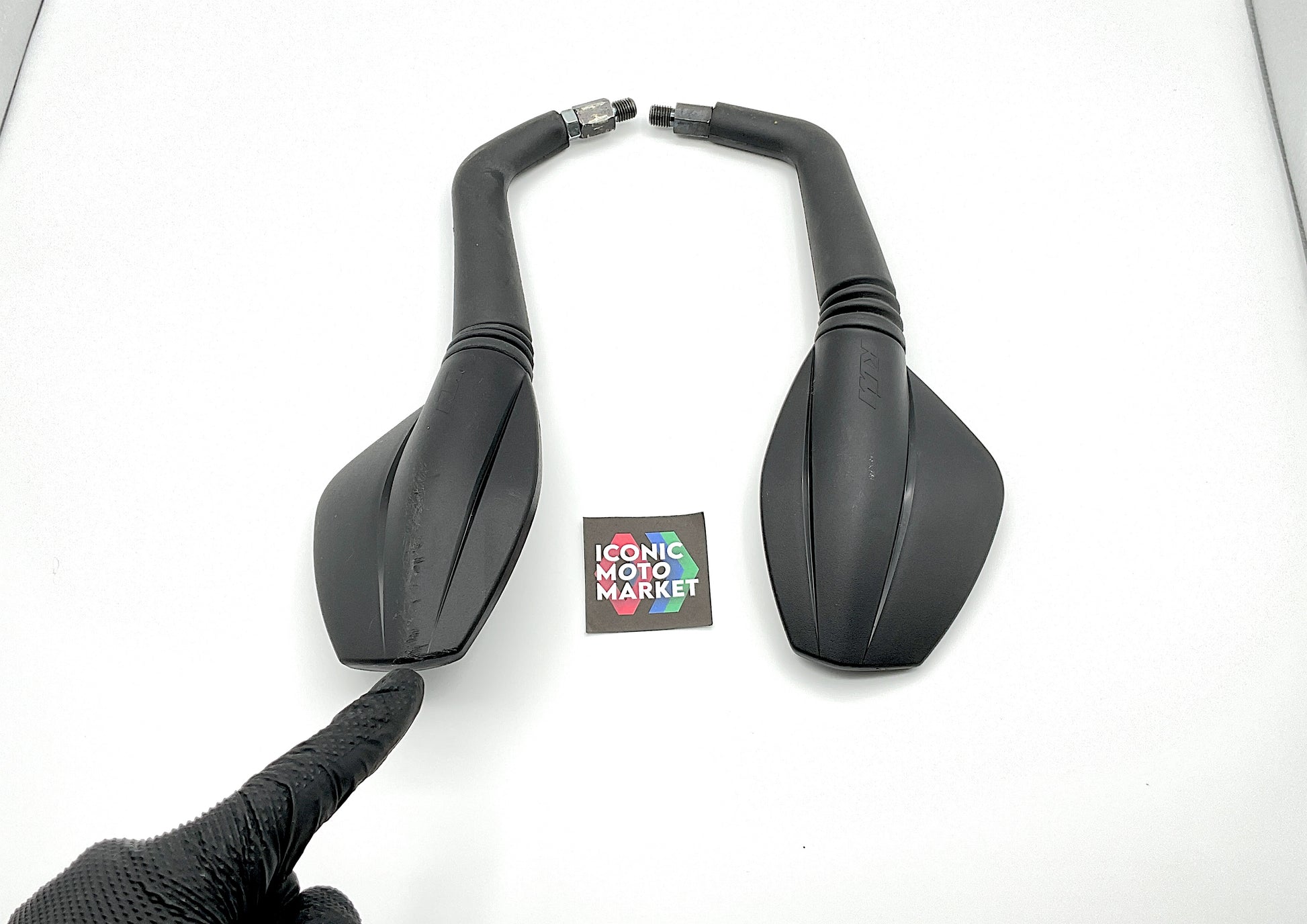 KTM Genuine Parts - Mirrors, left & right set. Good condition, pre-owned, with a missing mirror on right-side. Some abrasions on right-side. Sold complete as shown, as-is. (see pics)