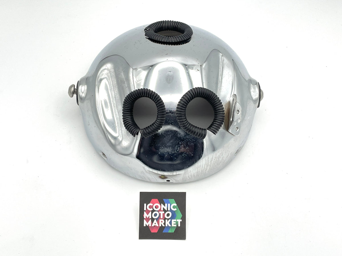 Description - Front head-light casing/cage. Fair condition, pre-owned, with wear. Cage portion has some corrosion. Would be a good project, requiring some restoration, and could possibly be applied to a variety of other motorcycles. Sold as shown, as-is.
