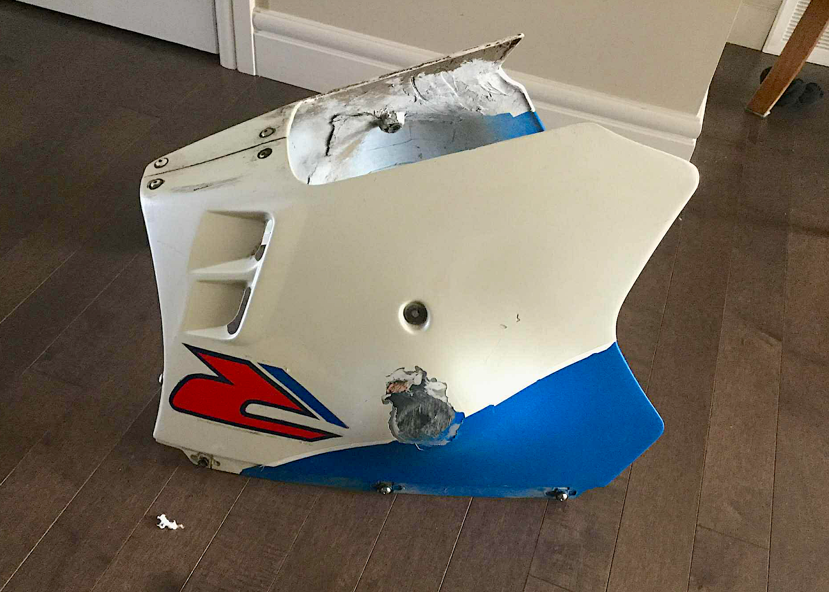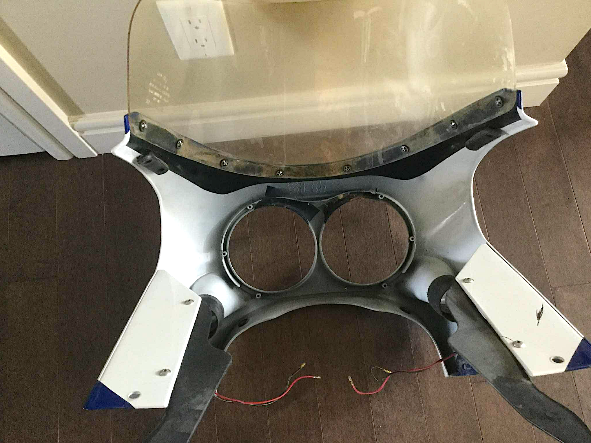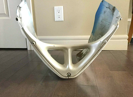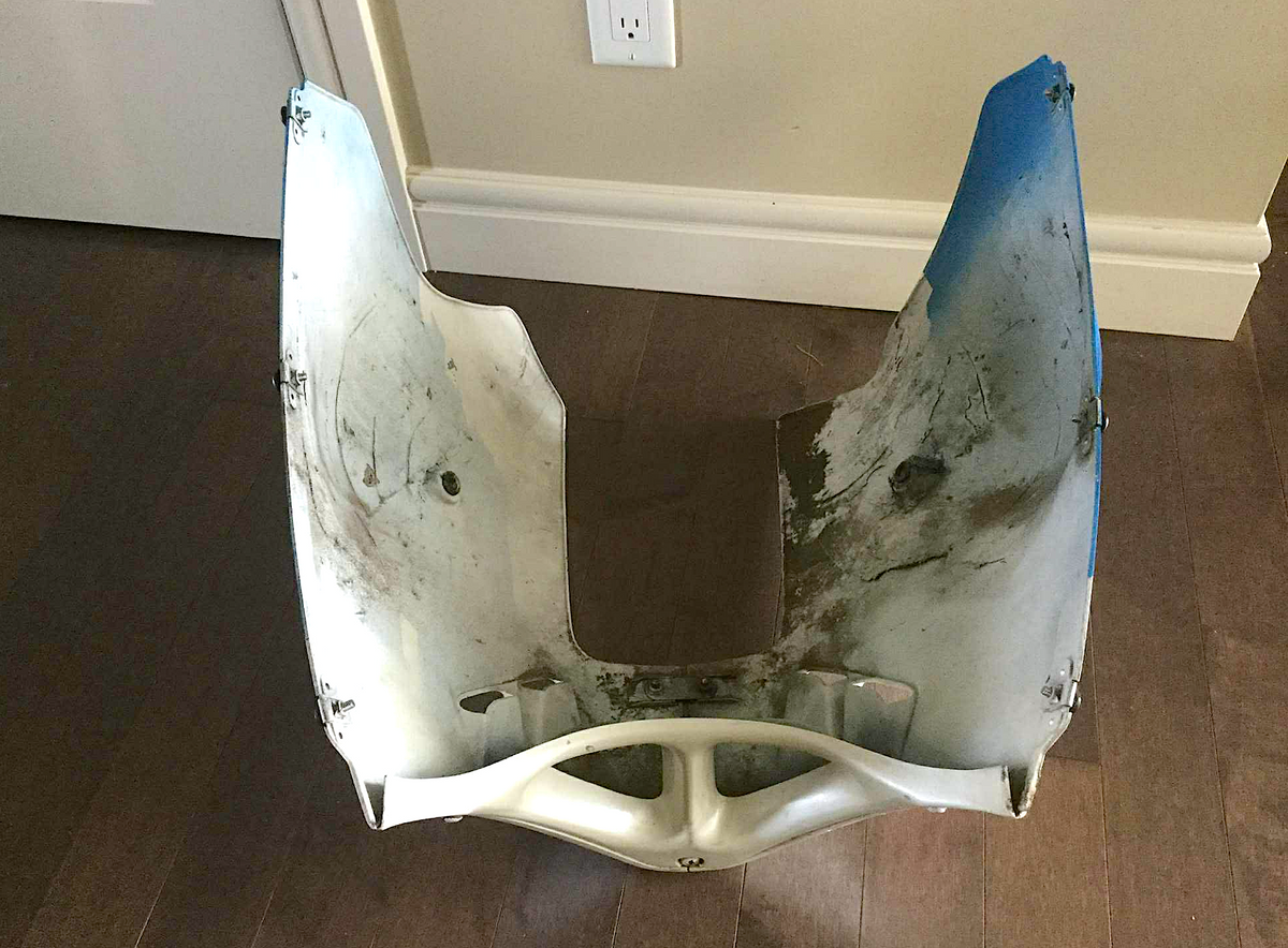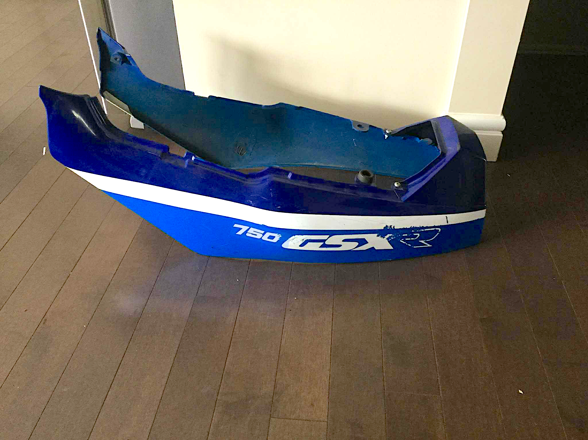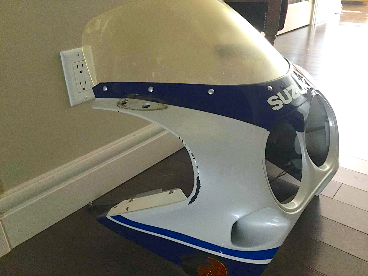 Suzuki Genuine Parts: Original factory Suzuki fairings set. This sale includes: front upper with screen & aftermarket turn signals, mid 2-piece fairings, lower 2-piece fairings with connecting V-fairing, and the 3-piece tail-fairing. Good condition with typical wear from use. Scratches, and imperfections found on the right-side of upper fairing (see pic #3). Scratches, rash, fracture, and internal plastic repairs to the lower fairing (see pics #9-12). Sold as shown, as-is.