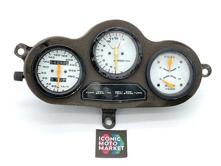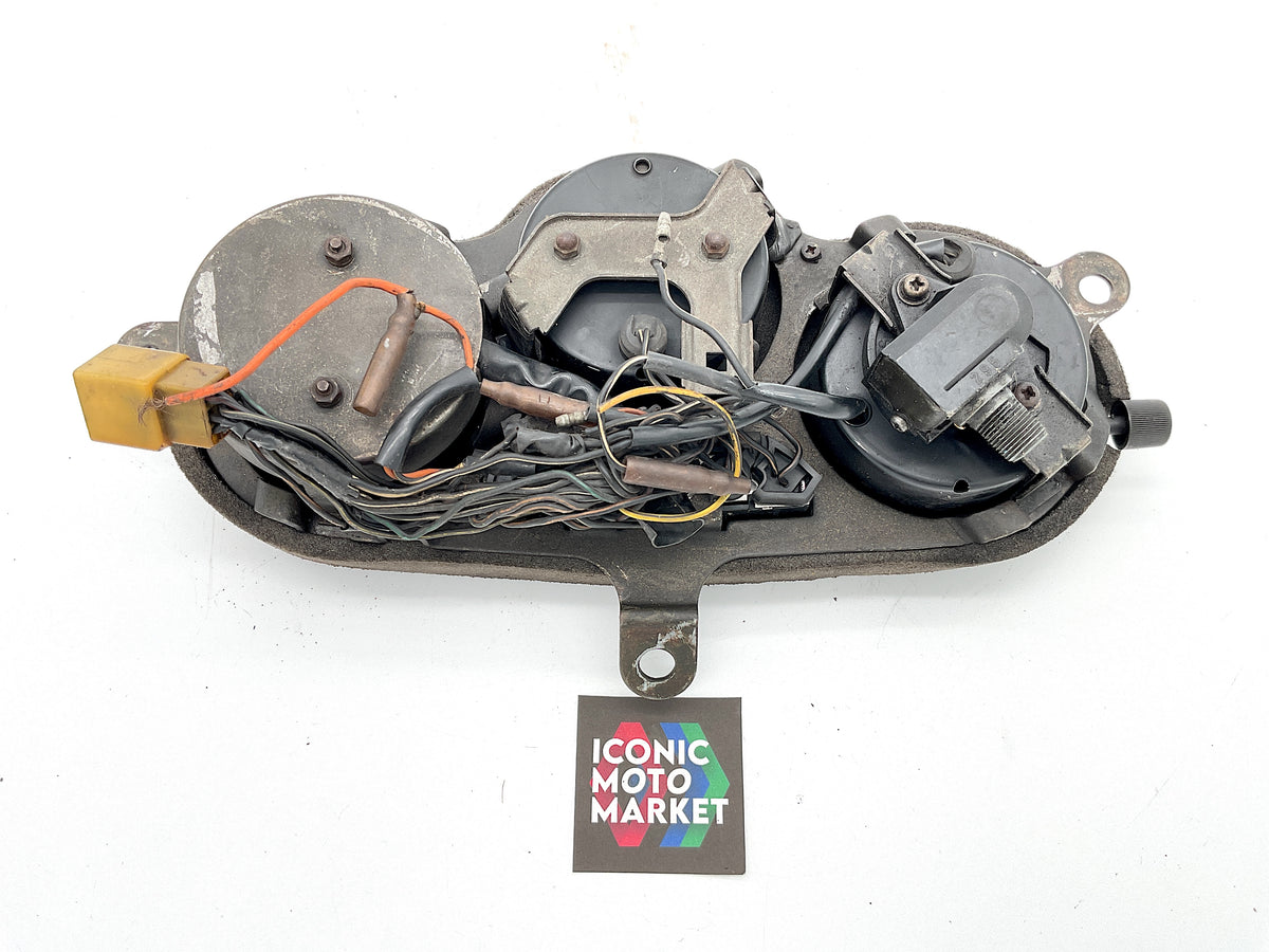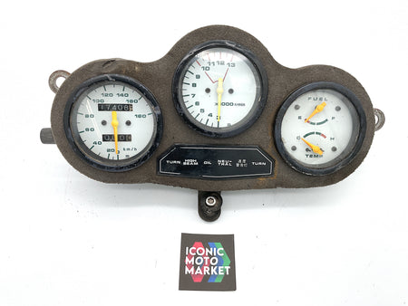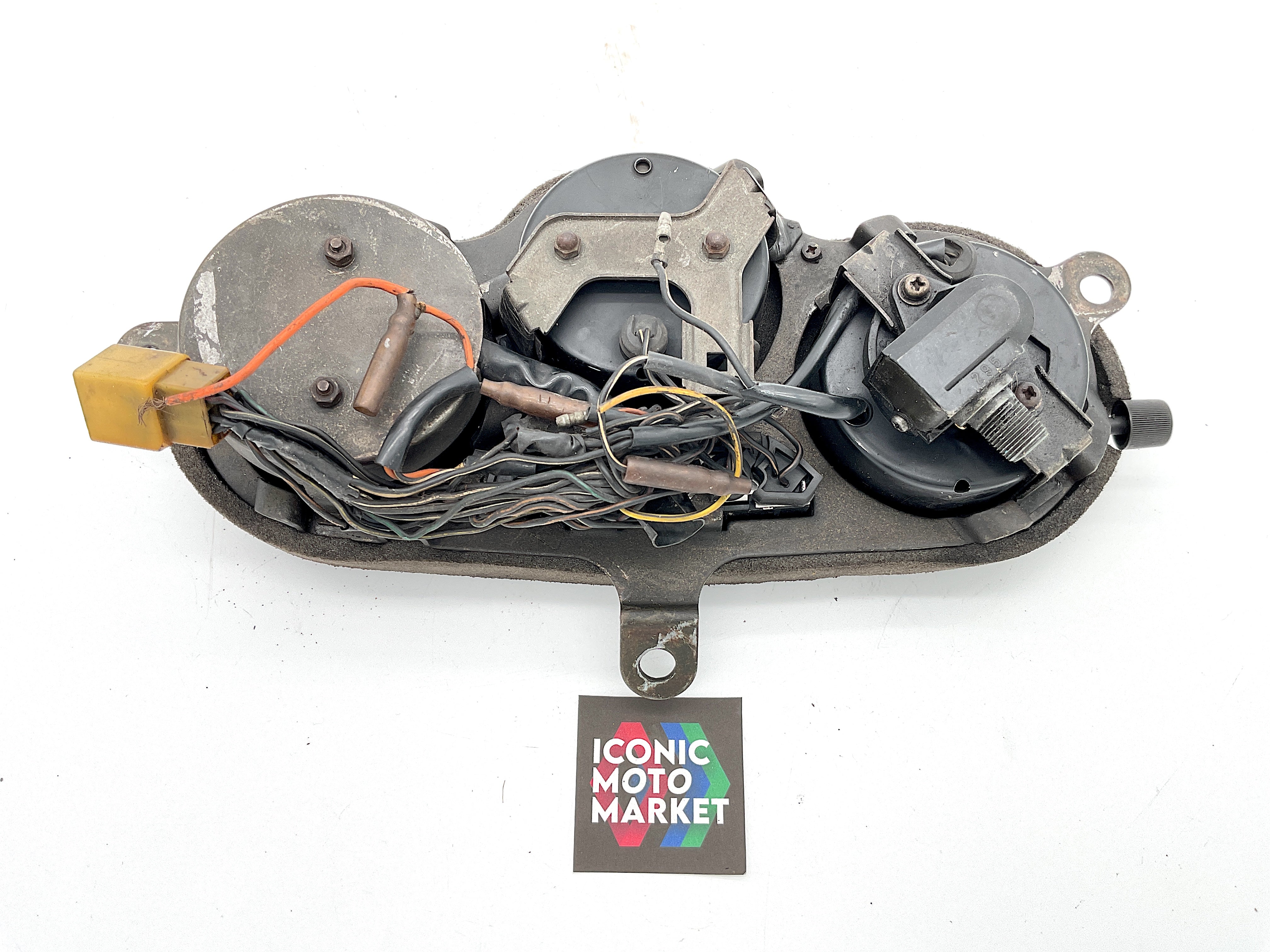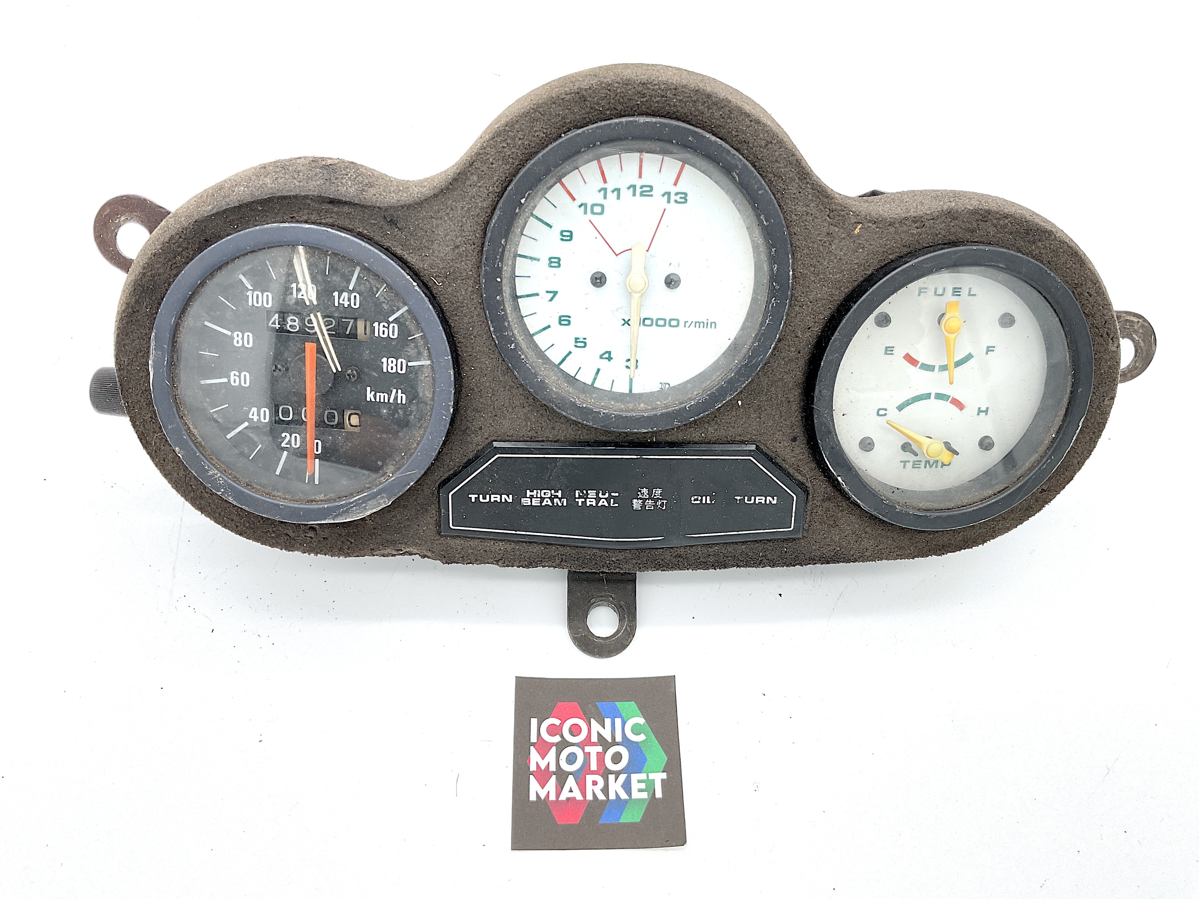 Suzuki Genuine Parts - Speedometer, tachometer, and split fuel & temperature gauges - complete assembly as displayed. Fair condition, pre-owned, with gauges bezels requiring restoration address.