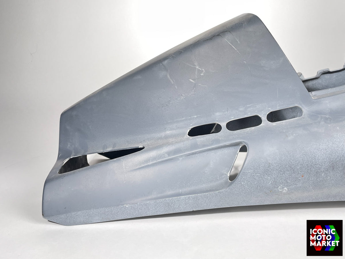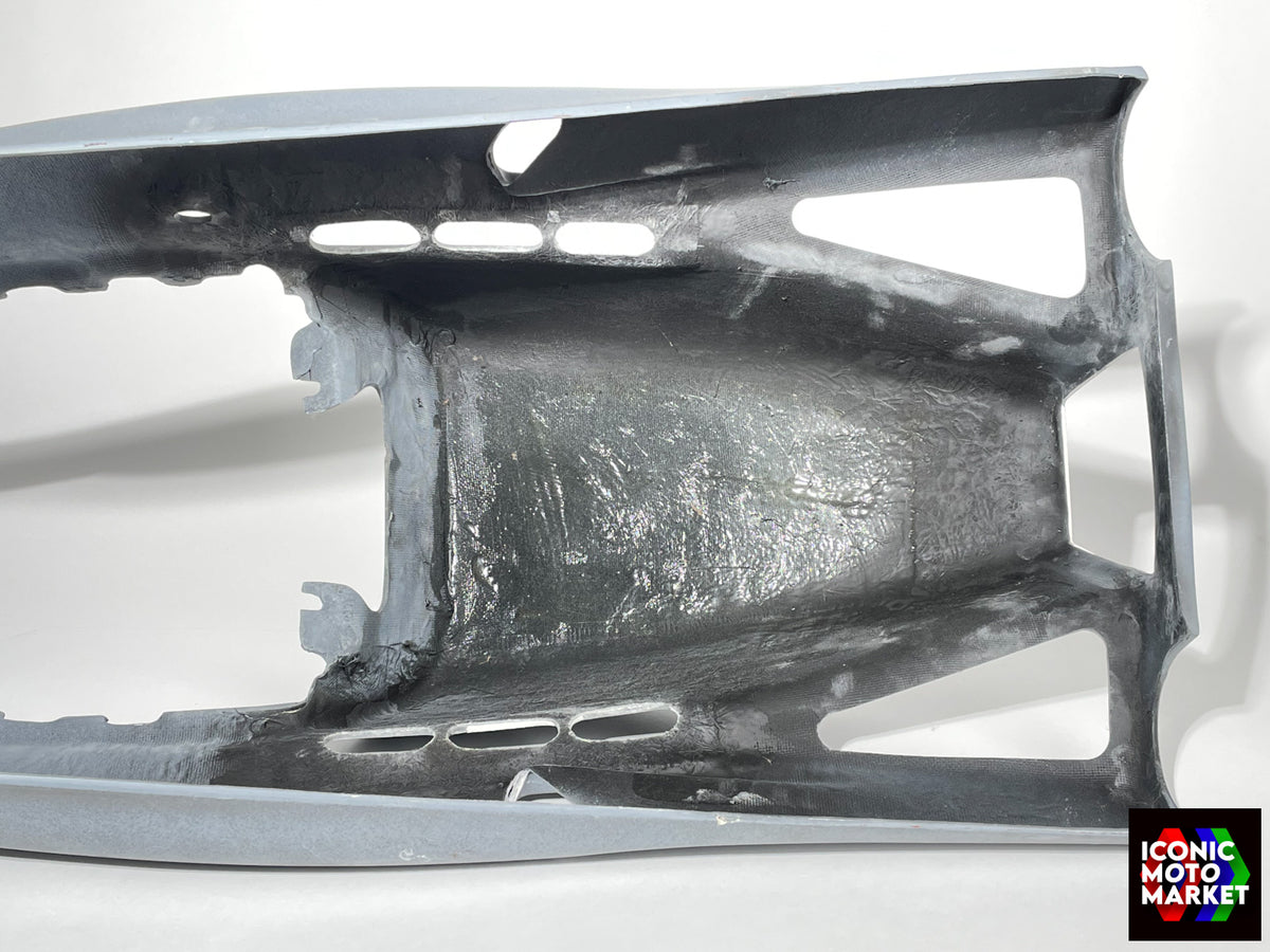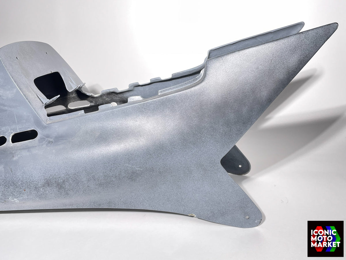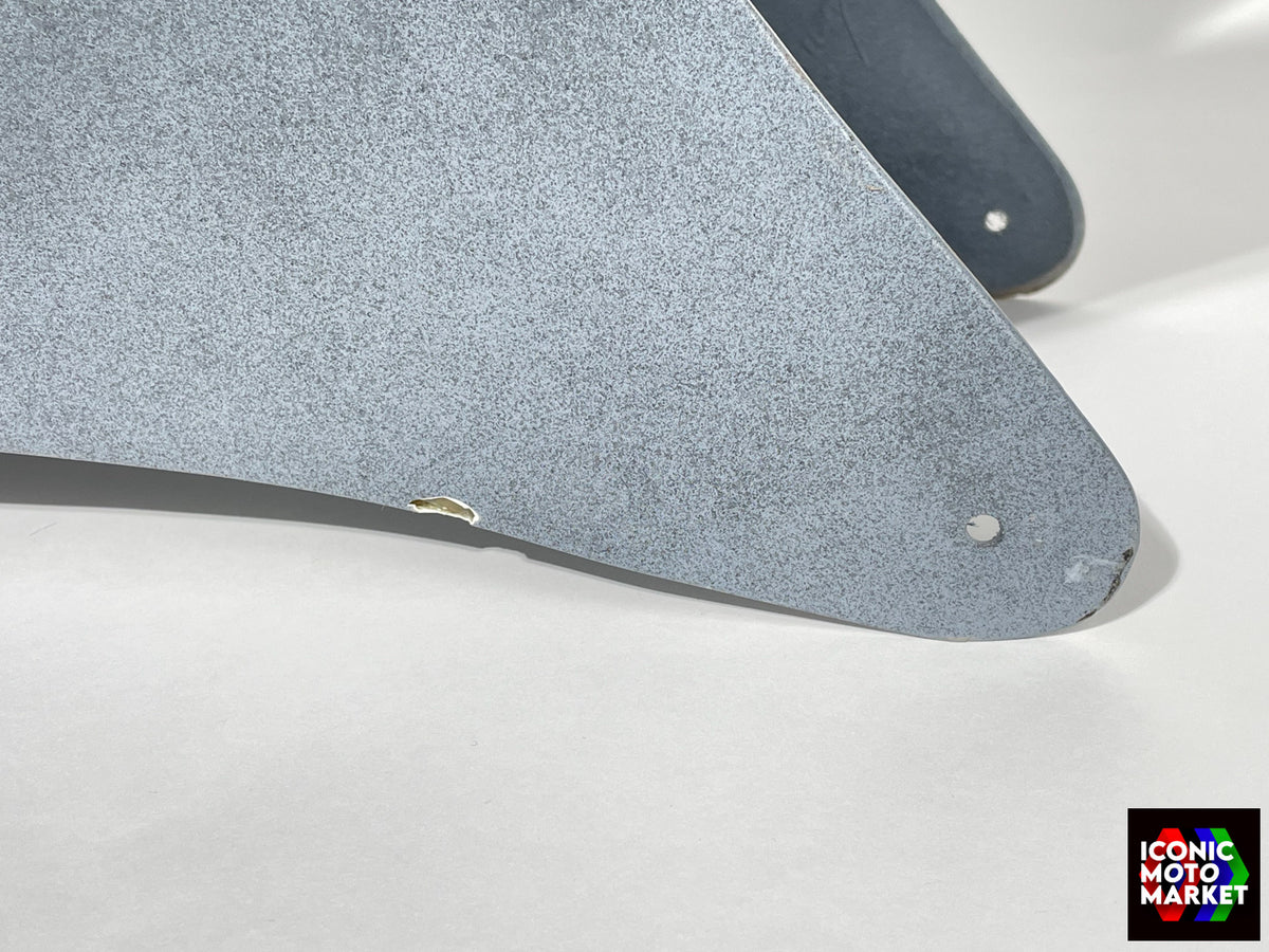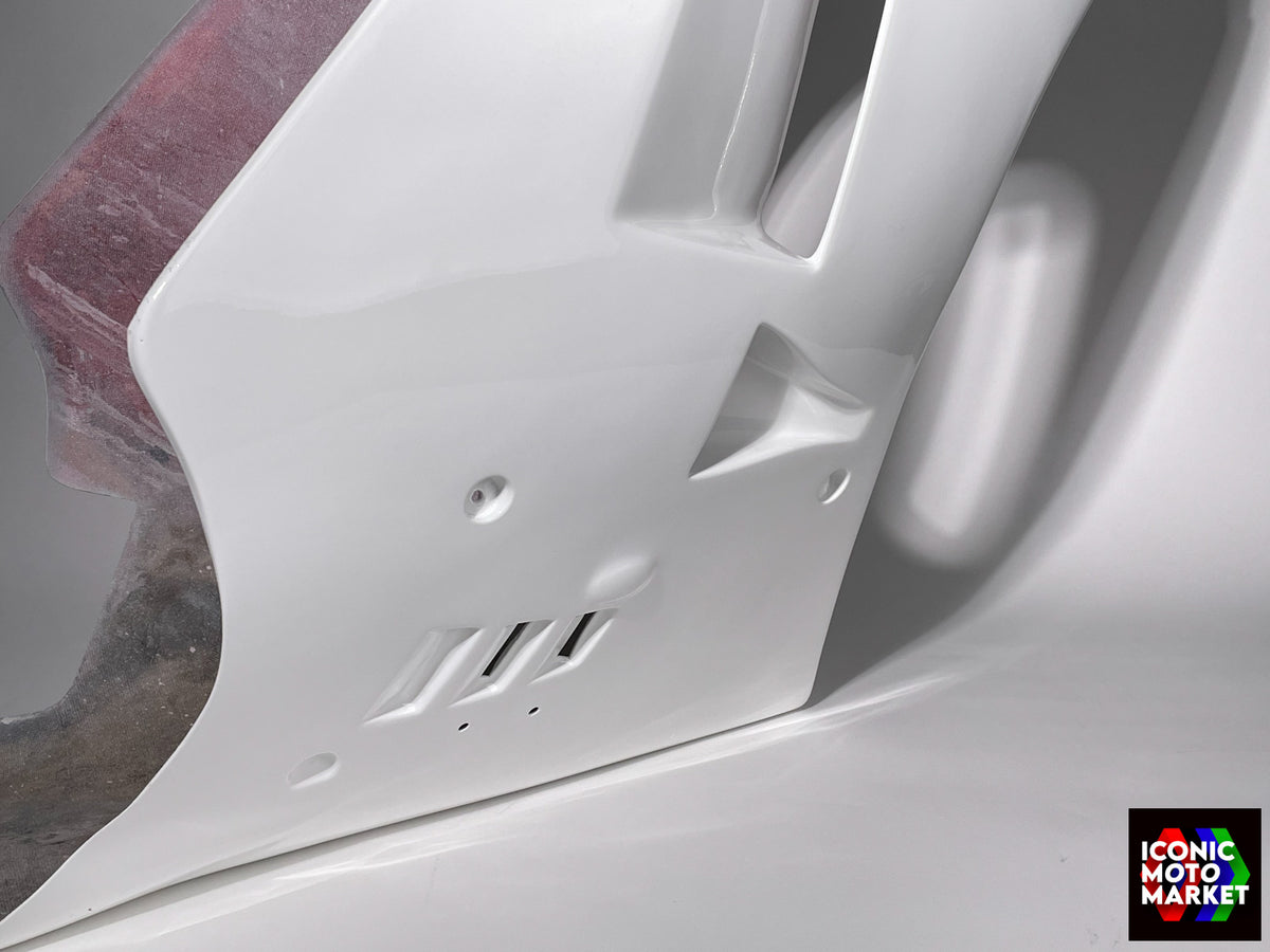 Description: Fiberglass fairings, aftermarket bodywork kit. New. Very good condition, and a solid choice for application on your Suzuki RG500. This kit includes: 1x front upper, 1x 1-pc mid/belly section, and 1x 1-pc tail-fairing cowl. Further investigation of this set reveals a few small hairline fractures in the gel-coat on the front upper cowl “ears” (see pics# 28-29), and several small chips found on the edge section of the tail-fairing (see pics# 40-42). Sold complete as shown, as-is.