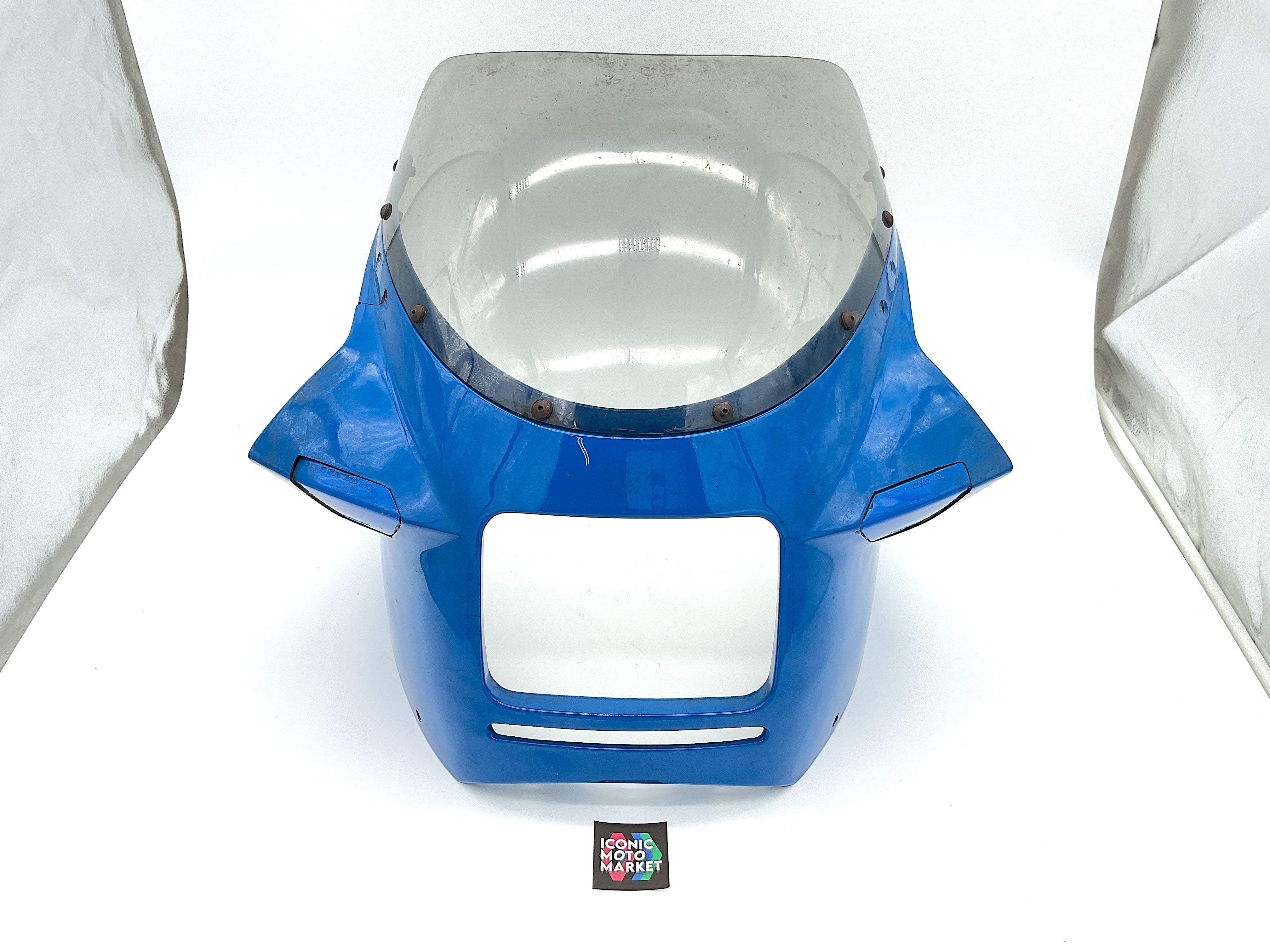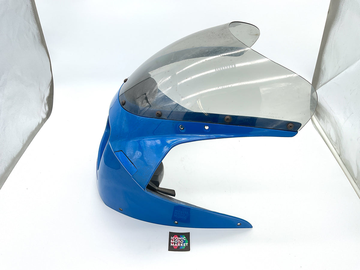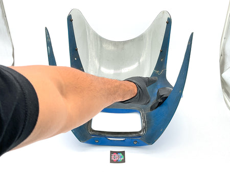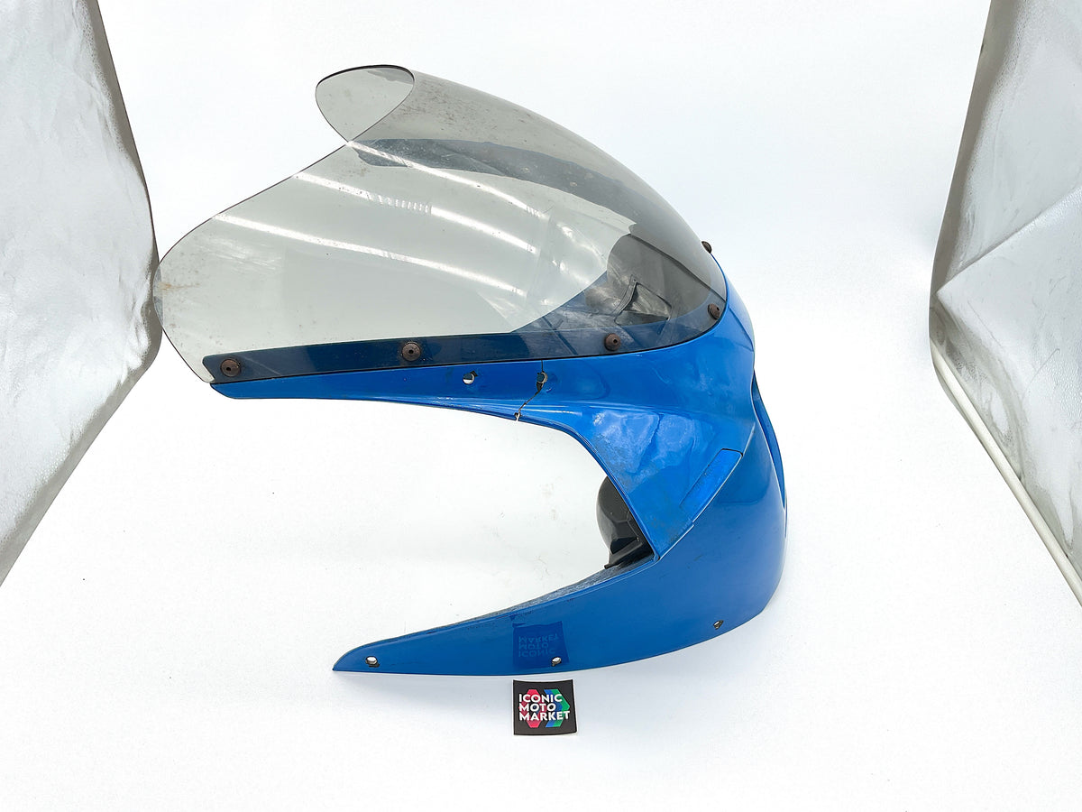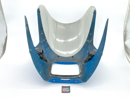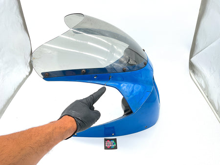 Aftermarket, fiberglass, front upper cowl with original Suzuki tinted windscreen. Very Good used condition. Fracture on right-side, which appears to have been partially repaired (see pics #5-6). The original tinted windscreen is included, as are the Suzuki internal headlight covers (see pic #4 - black covers).