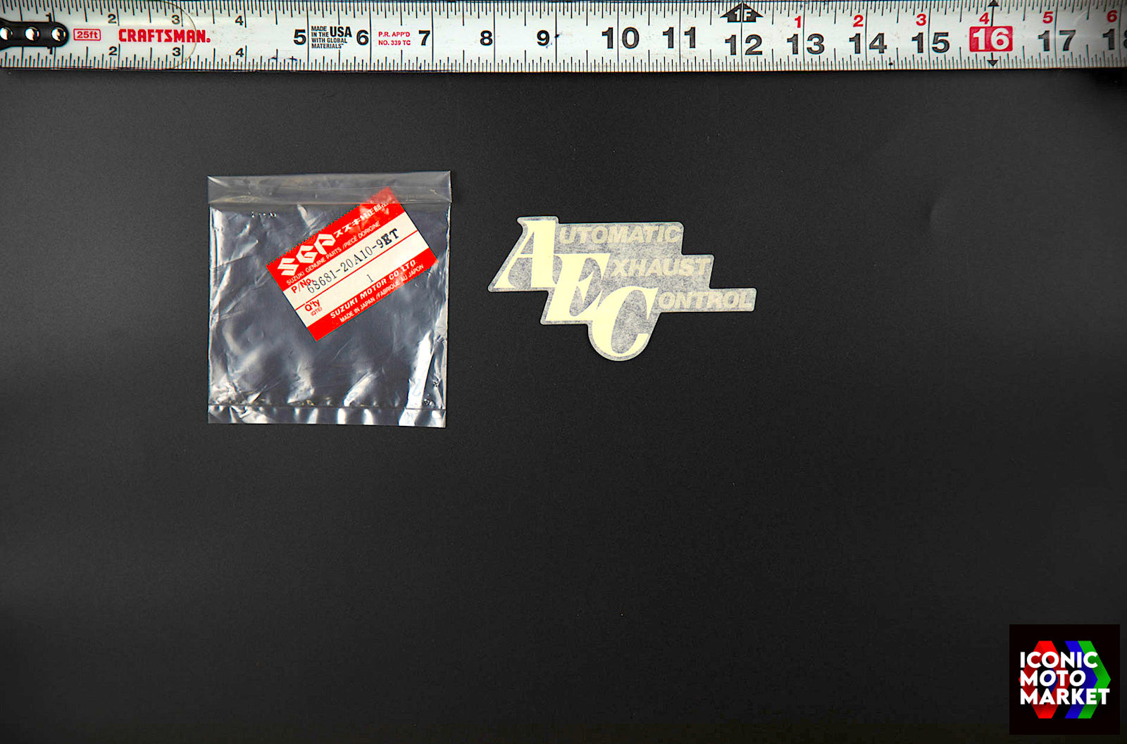 Suzuki Genuine Parts: 'AEC' decal, for lower side fairing location. NOS. The item was removed from its original packaging for final inspection and photographic purposes only. This unit will ship in the original package as shown.