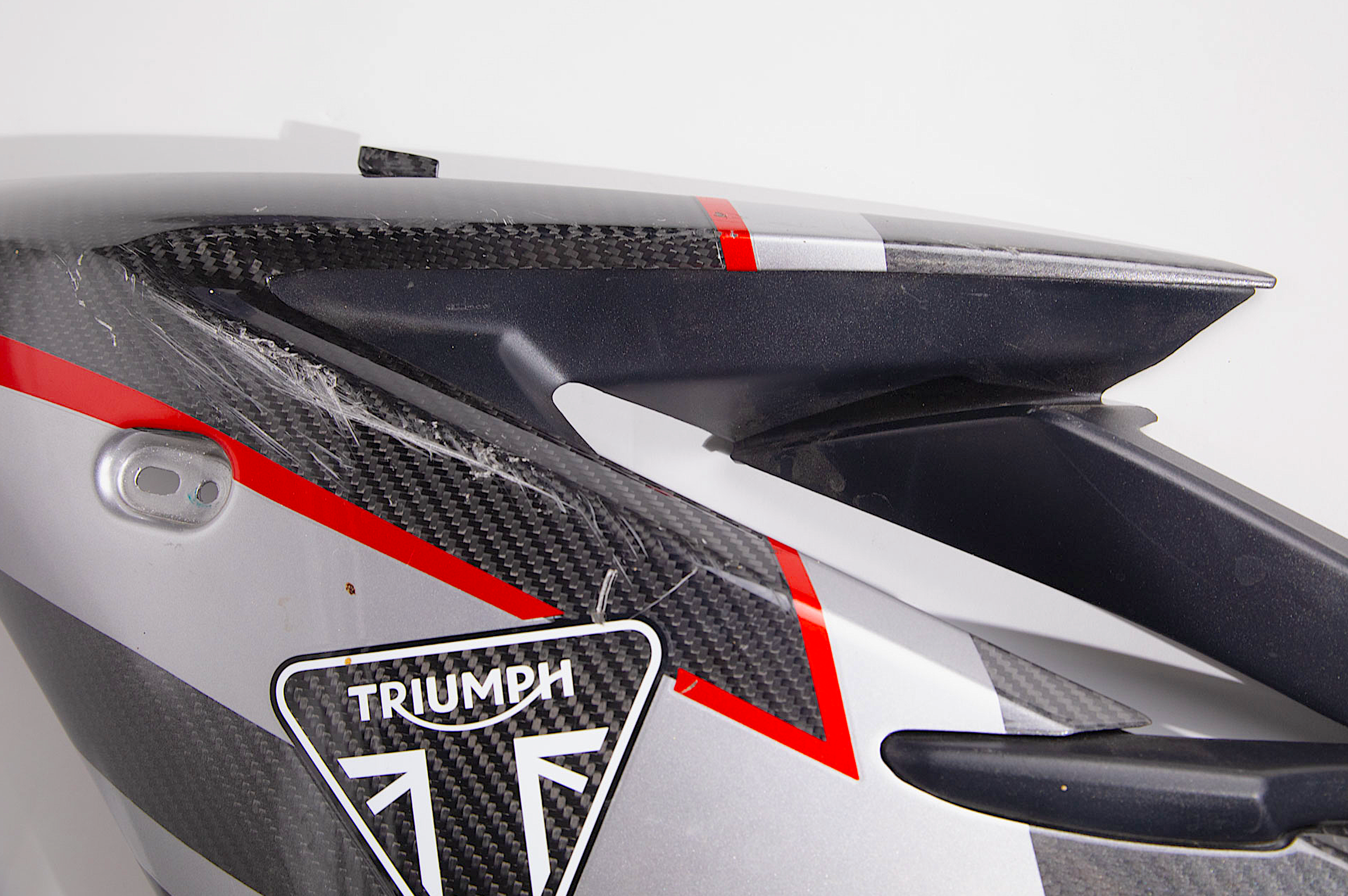 Triumph Genuine Parts: Left-side, carbon fiber fairing. Good condition, pre-owned, with wear. Inspection of the panel reveals cosmetic scratches to several locations (see pics #3-5). All tabs appear to be intact. Sold as shown, as-is.