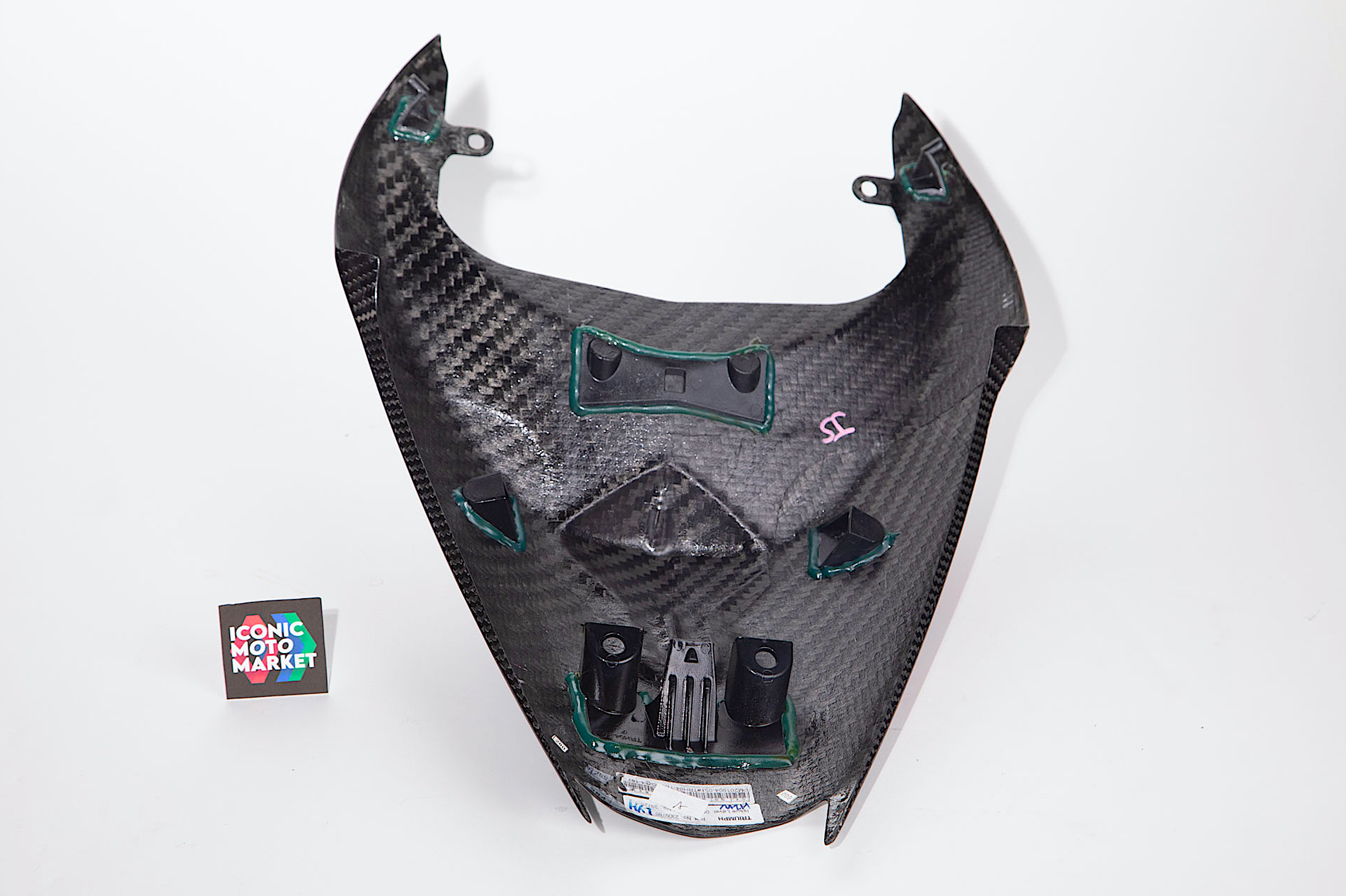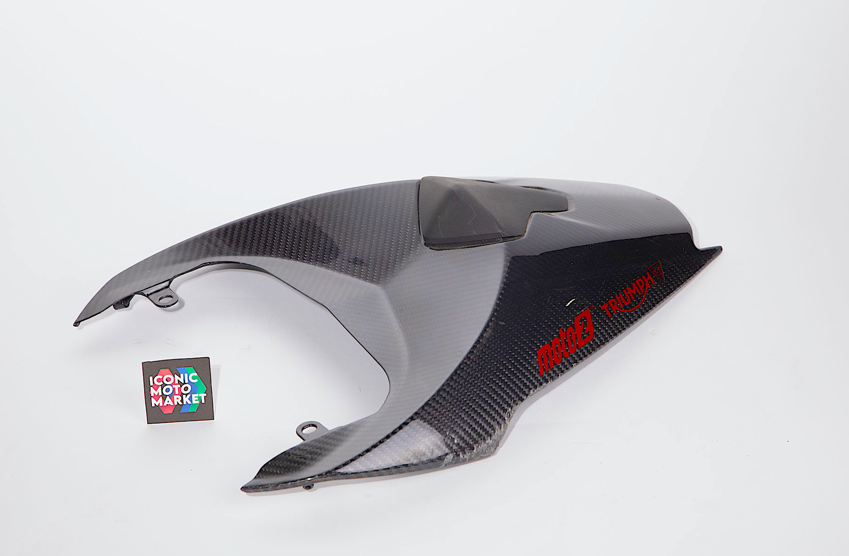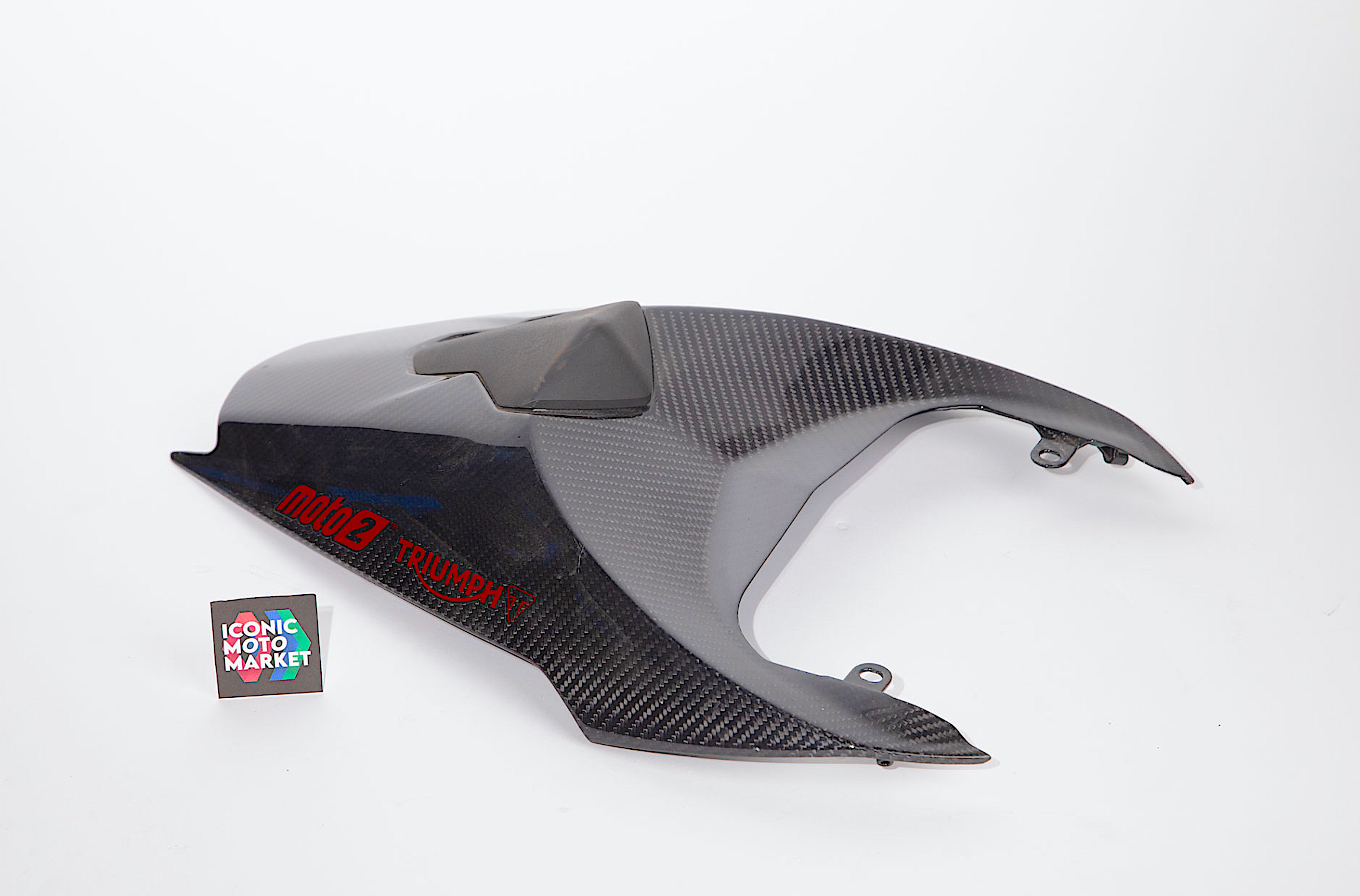 Triumph Genuine Parts: Seat cowl, carbon fiber tail cover. Good condition, pre-owned, with wear. Inspection of the cowl reveals cosmetic scratches to left-side edge (see pic #4). All tabs appear to be intact. Sold as shown, as-is.