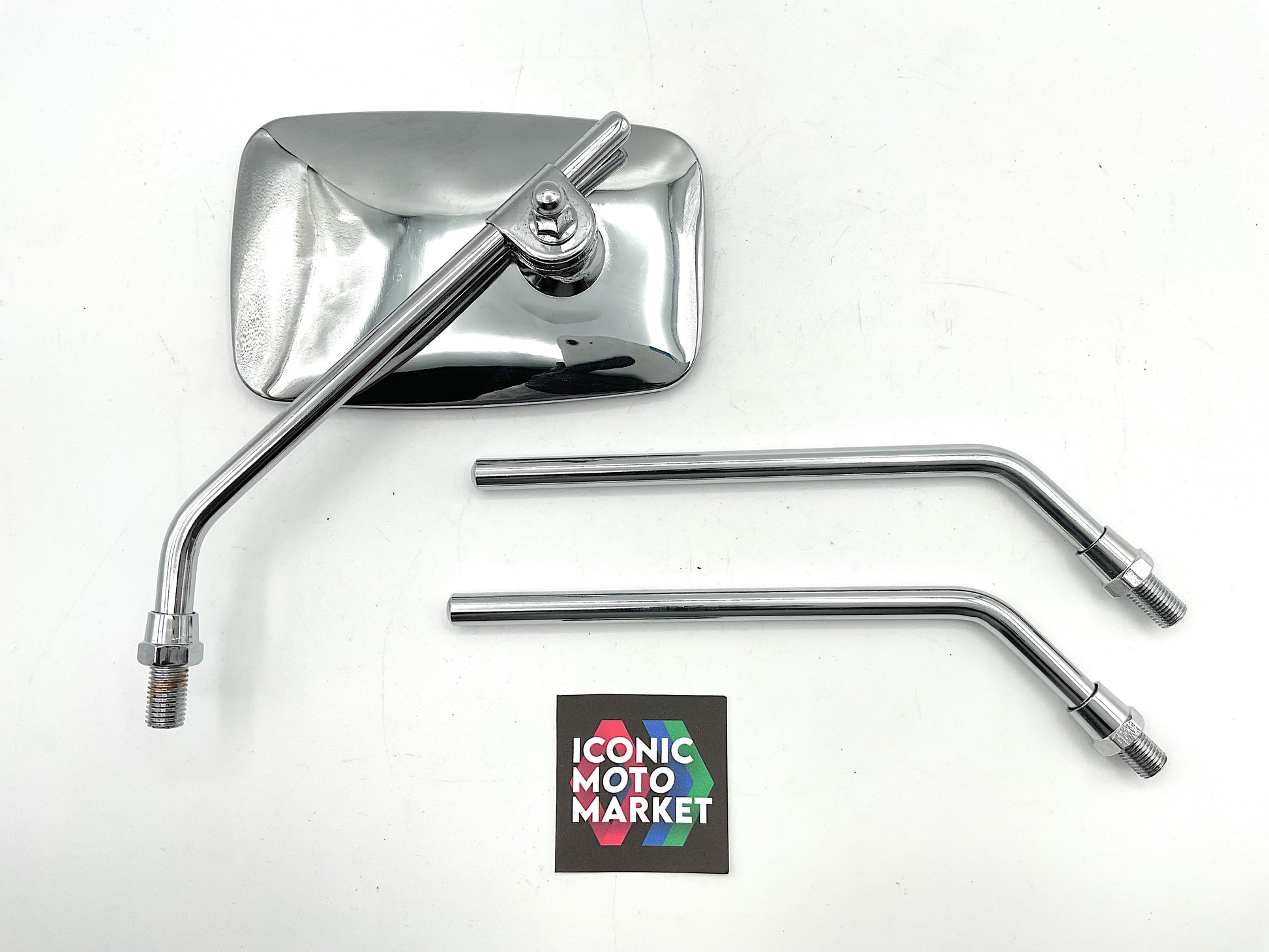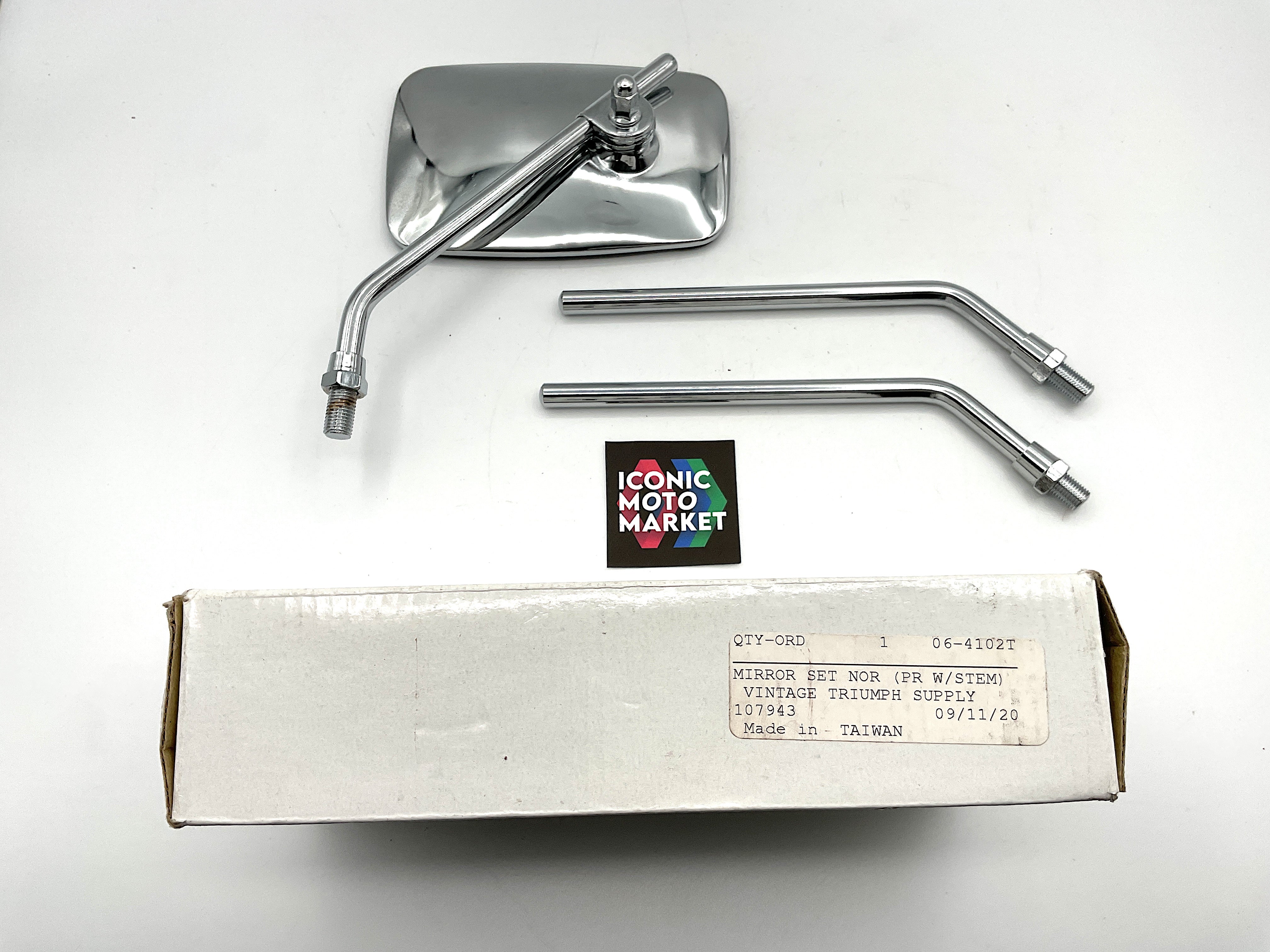 Triumph Vintage Supply - Left-side mirror, with 3 stems included. Universal fitment to Triumph, but possibly to BSA, and Norton. Very good quality piece. Removed from box for photographic purposes only!  NOTE: Please validate fitment by verifying with your service manual. Sold complete as shown. (see pics)