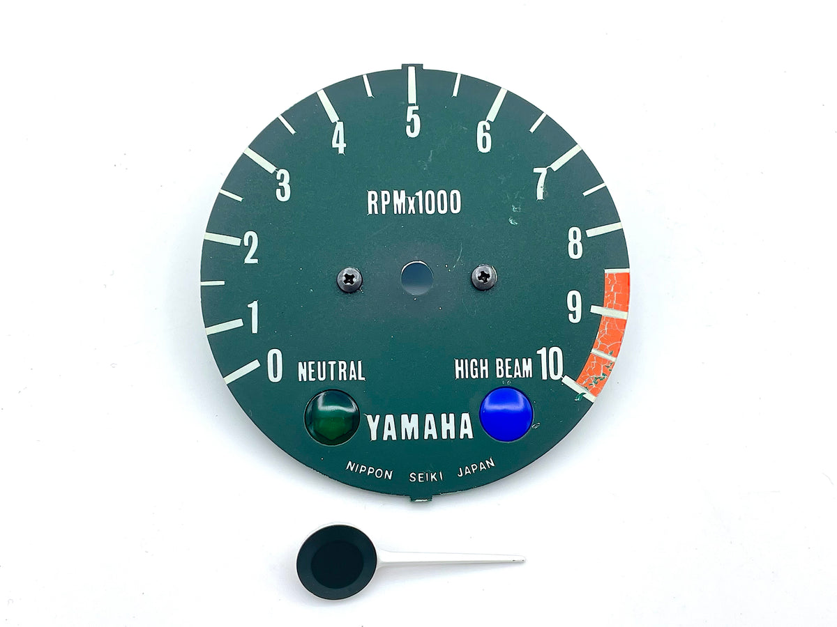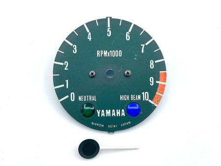 Yamaha Genuine Parts - Tachometer face, bezel ring with glass, and needle. Good condition with some light wear. Right section of clock (red-orange) has some degradation. This is a good selection of the primary and cosmetic replacement parts. Sold as shown, as-is.