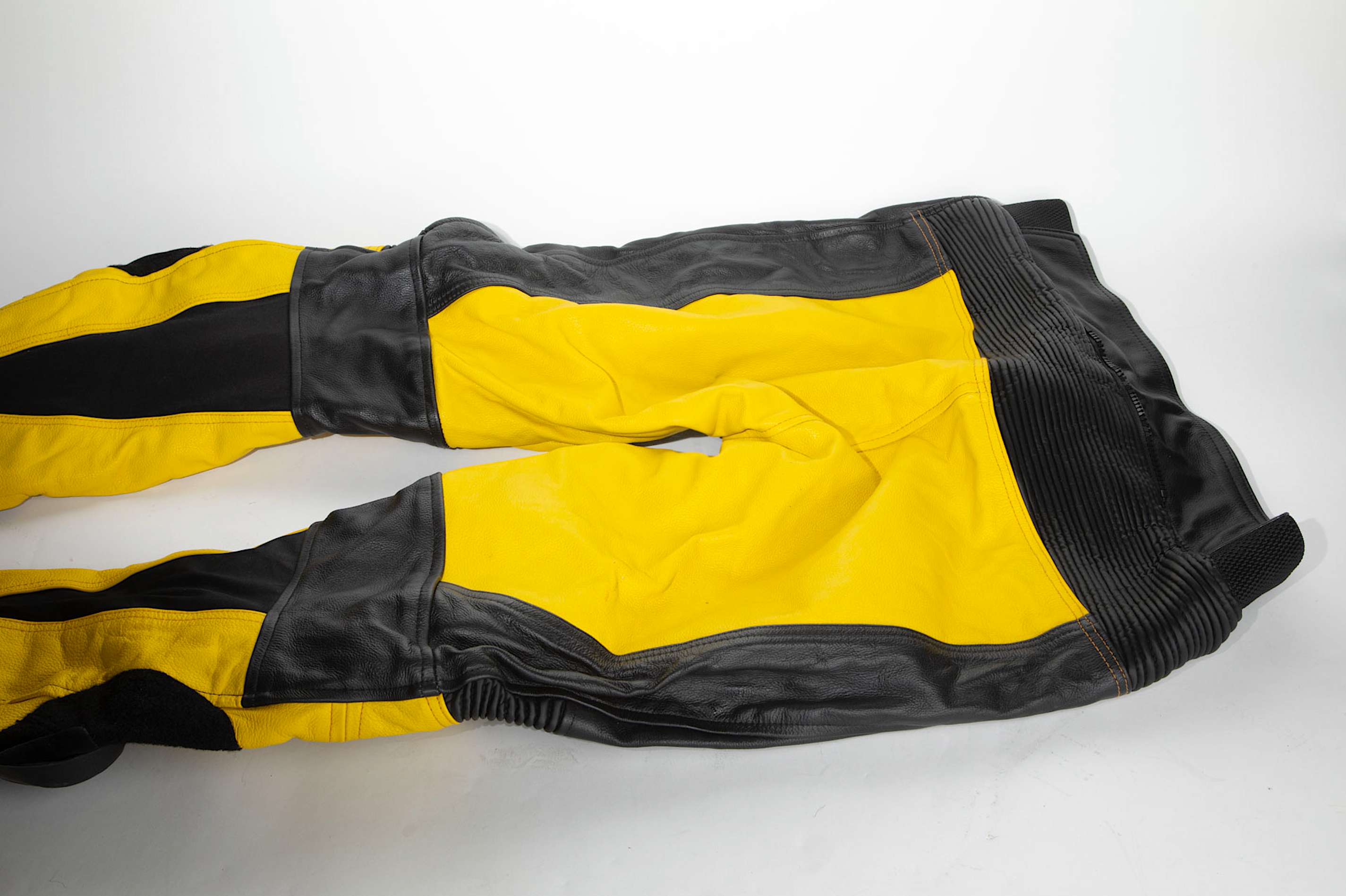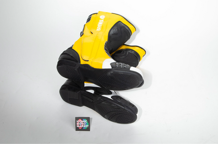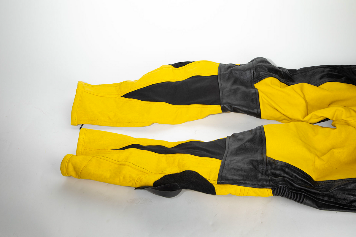 Description: Yellow Valentino Rossi 46 Edition, 2 piece leather suit, with leather riding boots. The suit/pant combination is a size: XL, and the boots are size: 47. This special inspired livery is a compliment to any Yamaha rider with a yellow/black R1 or R6. Clean in very good condition, with just a few small marks. The zipper is also a little sticky but could be looked after. Includes knee-sliders, large race hump, and 6-point metal sliders. Sold as shown.